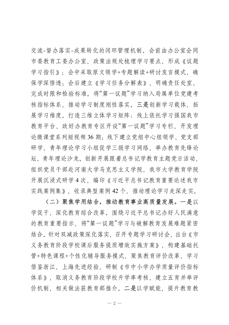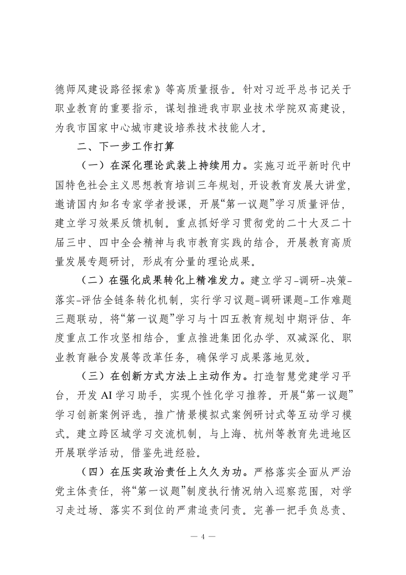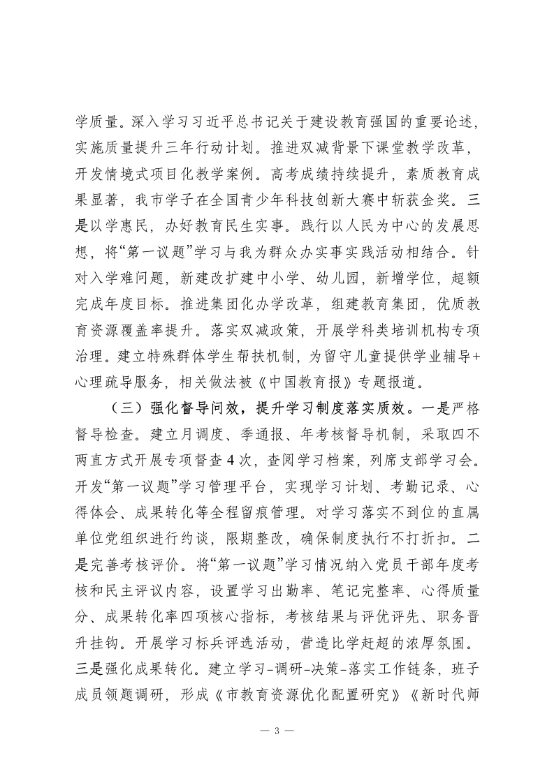 市教育局党组2025年落实“第一议题”制度工作总结2025年,市教育局党组坚持以习近平新时代中国特色社会主义思想为指导,深入学习贯彻党的二十大及二十届三中、四中全会精神,严格落实党中央关于建立“第一议题”制度的决策部署和省委、市委工作要求,始终把政治建设摆在首位,以高度的政治自觉、思想自觉和行动自觉抓实抓细“第一议题”学习制度落实,切实把学习成果转化为推动我市教育高质量发展的强大动力。一、主要工作情况(一)强化政治引领,构建“第一议题”学习闭环体系。一是健全领导机制,压实政治责任。局党组坚决扛起落实“第一议题”制度的主体责任,成立由党组书记任组长,其他班子成员任副组长,各处室、直属单位主要负责人为成员的学习领导小组,构建党组统一领导、办公室统筹协调、党支部具体落实、党员全员参与的四级责任体系。制定《市教育局党组“第一议题”学习制度实施细则》,将习近平总书记关于教育的重要论述、最新重要讲话和指示批示精神作为必学内容,做到应学尽学、深学细悟。建立一把手领学、班子成员跟学、党员干部研学的学习机制,党组书记带头撰写心得体会,班子成员开展专题辅导报告,形成以上率下、整体联动的良好学习格局。二是完善制度保障,规范学习流程。严格执行议题审核-集中学习-研讨1