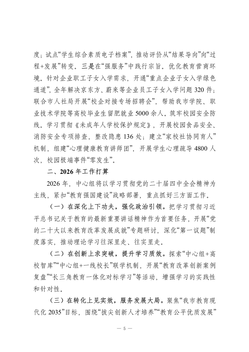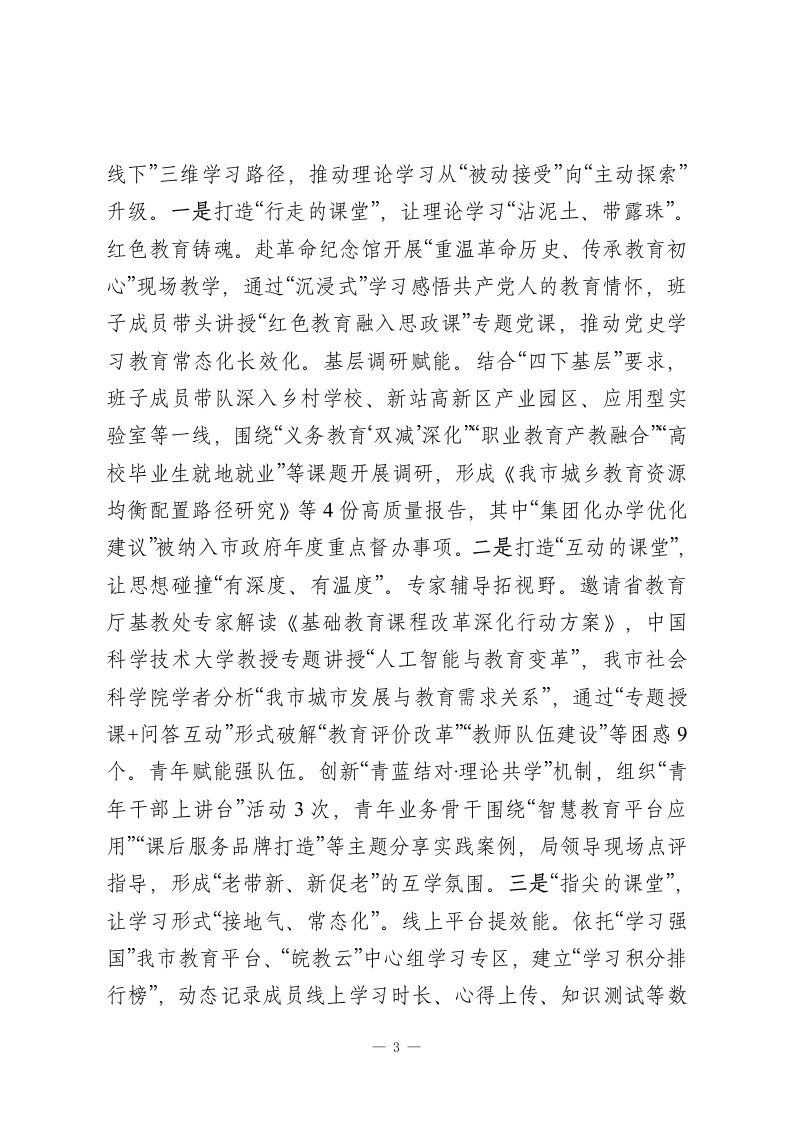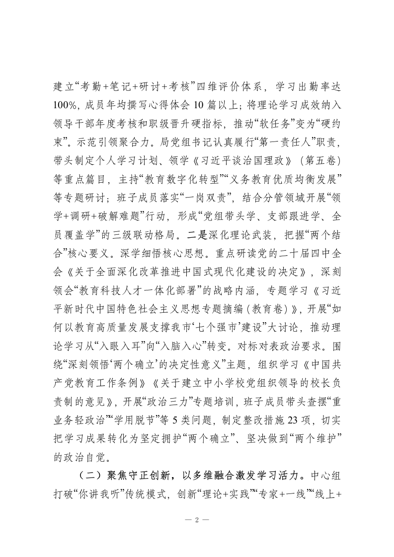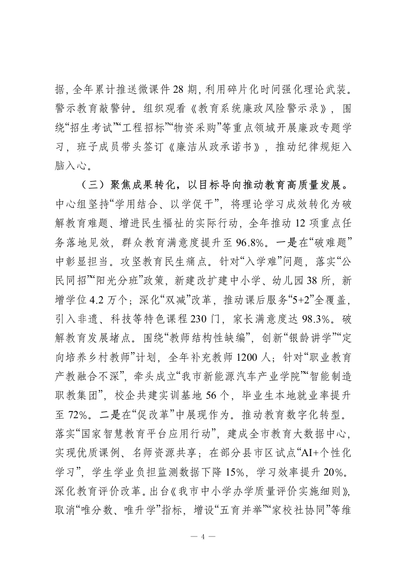 市教育局党组理论学习中心组2025年度学习工作总结2025年,市教育局党组理论学习中心组坚持以习近平新时代中国特色社会主义思想为指导,深入学习贯彻党的二十大和二十届三中、四中全会精神,全面落实习近平总书记关于教育的重要论述及考察我省重要讲话指示精神,紧紧围绕市委、市政府“办好人民满意的教育”战略部署,聚焦“学思想、强党性、重实践、建新功”总要求,以“三个聚焦”推动理论学习走深走实,以“三个转化”赋能教育高质量发展,为加快建设教育强市、打造“学在我市”品牌提供了坚强思想保证和行动指南。一、学习工作情况(一)聚焦政治引领,以高位统筹筑牢思想根基。一是强化顶层设计,构建“三位一体”学习机制。规划先行定方向。紧扣“学习贯彻习近平新时代中国特色社会主义思想主题教育深化拓展“党的二十届四中全会精神专题解读“教育强国建设纲要落实”等核心议题,制定《2025年中心组学习计划》,明确“每月1次集中学习、每季度1次专题研讨、每半年1次成果评估的“三个一”学习制度,将习近平总书记关于教育的最新重要讲话、党的教育方针政策、我市教育“十四五”规划中期评估等12项内容纳入必学清单,确保学习与教育中心工作同频共振。制度保障强规范。严格执行“第一议题”制度,党组会议首项议程专题学习习近平总书记最新重要指示批示精神,全年累计学习23次;1