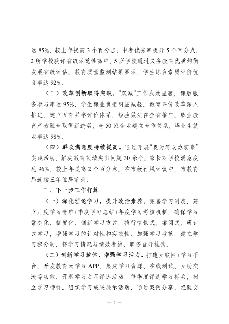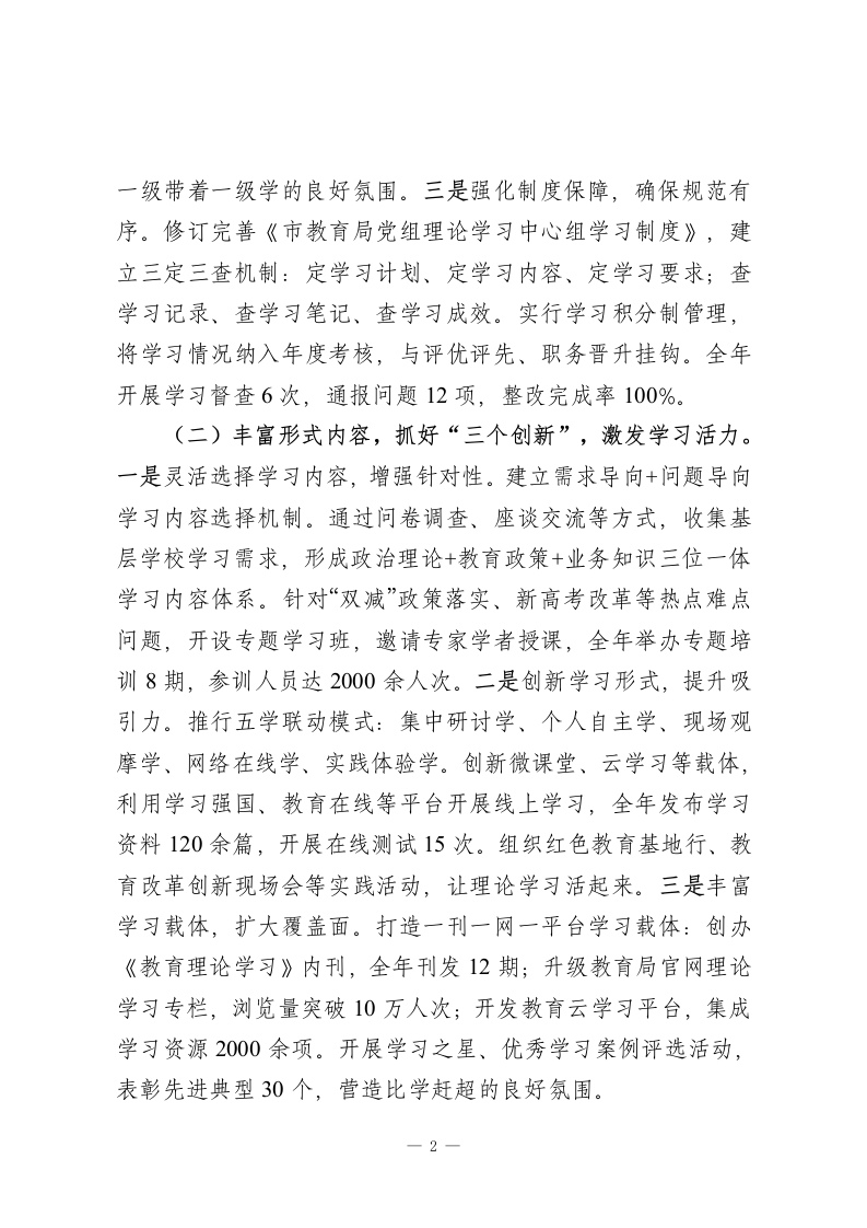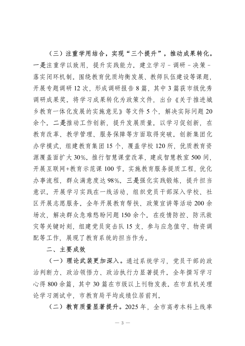 市教育局党组理论学习中心组2025年学习工作总结2025年,市教育局党组理论学习中心组坚持以习近平新时代中国特色社会主义思想为指导,深入学习贯彻党的二十大精神,紧紧围绕办好人民满意的教育目标,积极探索并坚持三个三工作法,在领、活、用三个关键环节上精准发力,推动理论学习与教育实践深度融合,为全市教育高质量发展提供了坚强思想保证和强大精神动力。一、主要工作情况(一)坚持以上率下,把握“三个关键”,筑牢思想根基。一是明确学习主线,把准政治方向。市教育局党组始终把学习贯彻党的创新理论作为首要政治任务,确立以党的创新理论武装头脑、以党的路线方针政策指导实践的学习主线。全年组织专题学习12次,系统学习习近平总书记关于教育的重要论述,深入领会“九个坚持”的深刻内涵。结合教育实际,将学习内容细化为教育公平与质量提升、立德树人根本任务、教育评价改革等专题,确保学习方向与教育发展同频共振。二是发挥领导作用,强化示范引领。建立党组领学、支部促学、党员跟学三级联动机制。党组书记带头讲党课6次,班子成员深入基层学校开展宣讲20余场次。创新1+N学习模式,即1名中心组成员联系N个基层党支部,通过学习清单+任务清单双清单管理,推动理论学习向基层延伸。全年开展领导领学活动48次,形成1