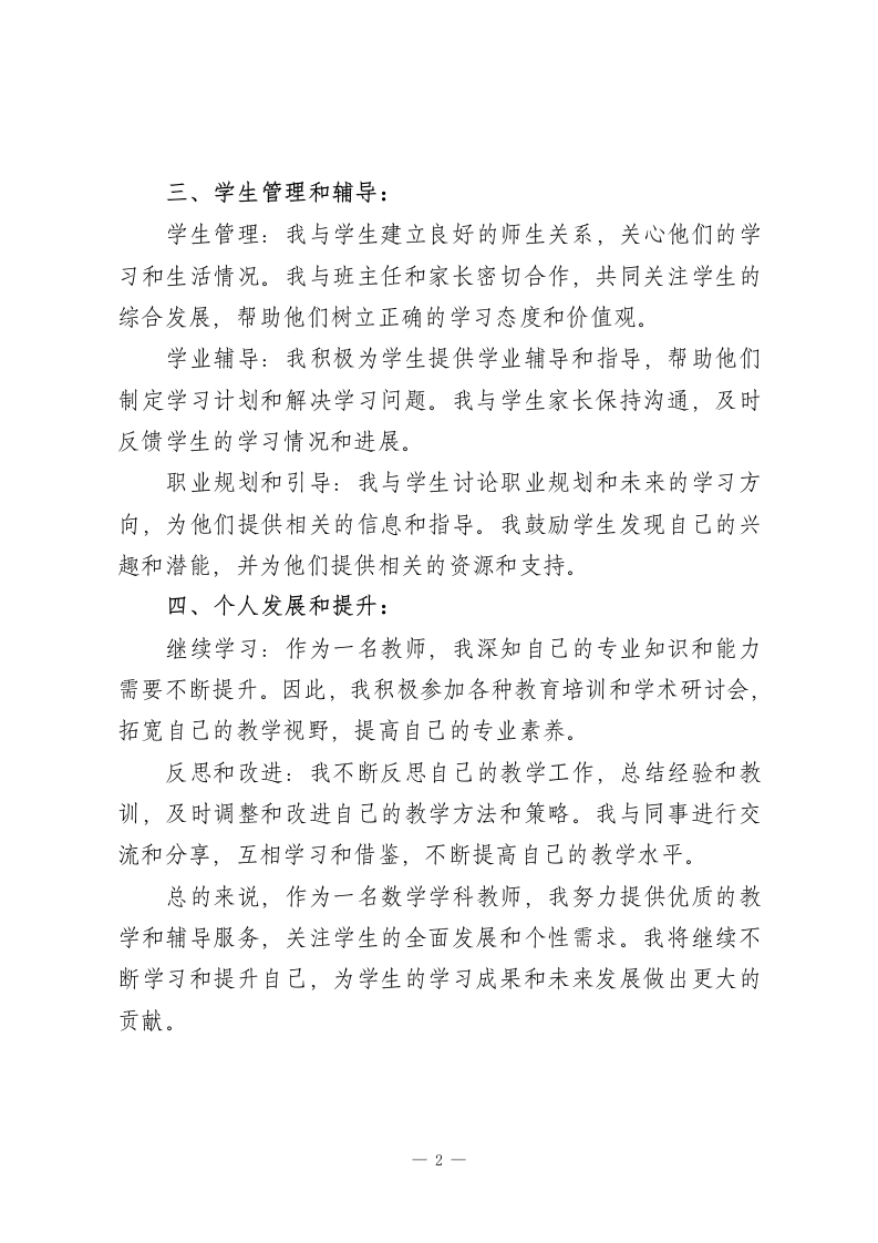 数学学科教师总结一、教学工作:教学内容和方法:我按照教学大纲和教材的要求,合理安排教学内容和进度,确保学生能够逐步掌握数学的基础知识和解题方法。我注重启发式教学,通过提出问题、引导讨论和解决实际问题等方式,培养学生的逻辑思维和问题解决能力。课堂管理:我注重课堂纪律和秩序的维护,确保学生能够专心听讲和参与课堂活动。我鼓励学生提问和讨论,并及时给予肯定和鼓励,营造积极的学习氛围。个性化教学:我关注学生的学习差异和特点,根据学生的能力水平和学习风格,提供个性化的教学指导。我与学生进行一对一的辅导,帮助他们克服学习障碍,提高学习效果。检测和评估:我定期进行学生的学习检测和评估,了解他们的学习进展和问题所在。我及时给予反馈和建议,帮助学生发现并改进自己的学习方法和策略。二、教研工作:参与教研活动:我积极参与学校的教研活动,与同事们分享教学心得和经验,探讨教学方法和教材的优化。我关注教育前沿的动态,不断更新自己的教育理念和知识。教材研究和开发:我深入研究教材,挖掘教材中的教学资源,结合学生的实际情况,开发和设计符合学生学习需求的教学资源和活动。一1