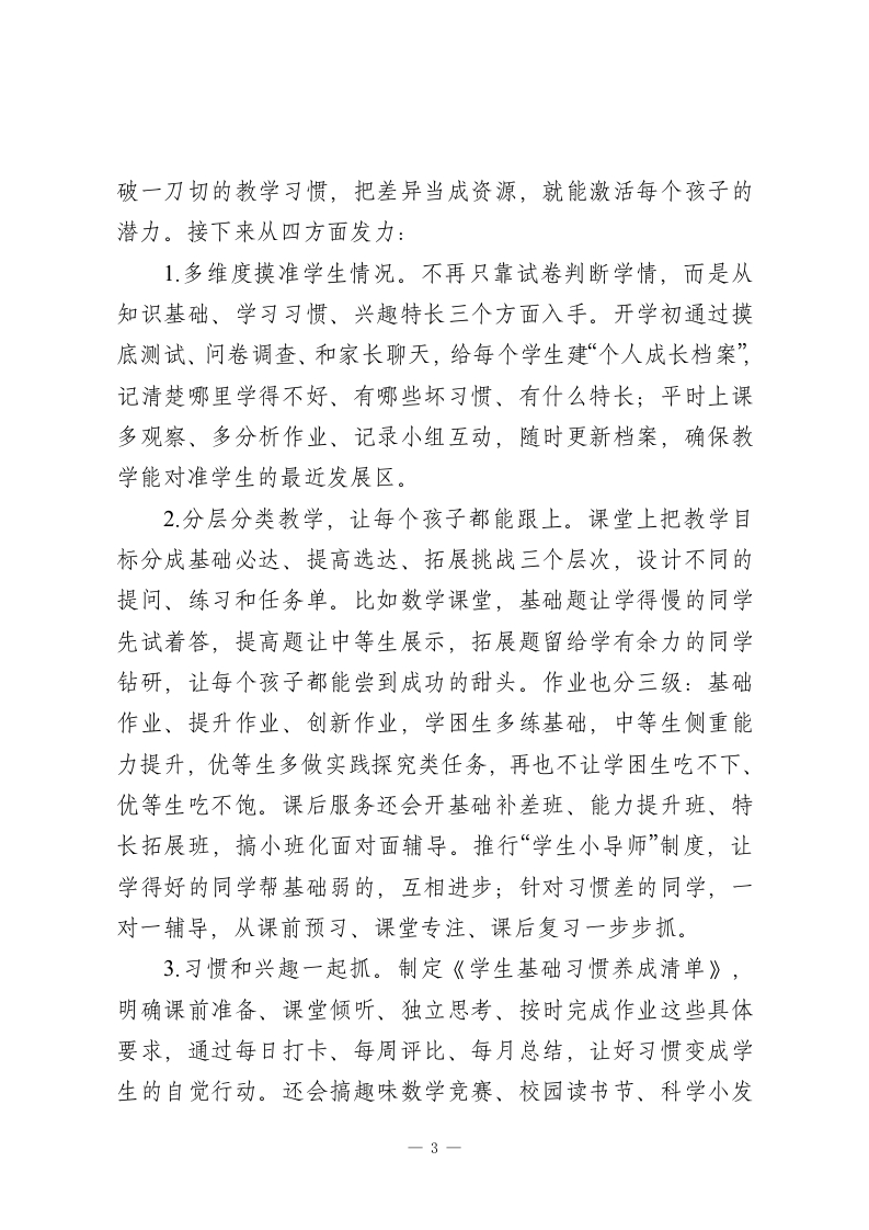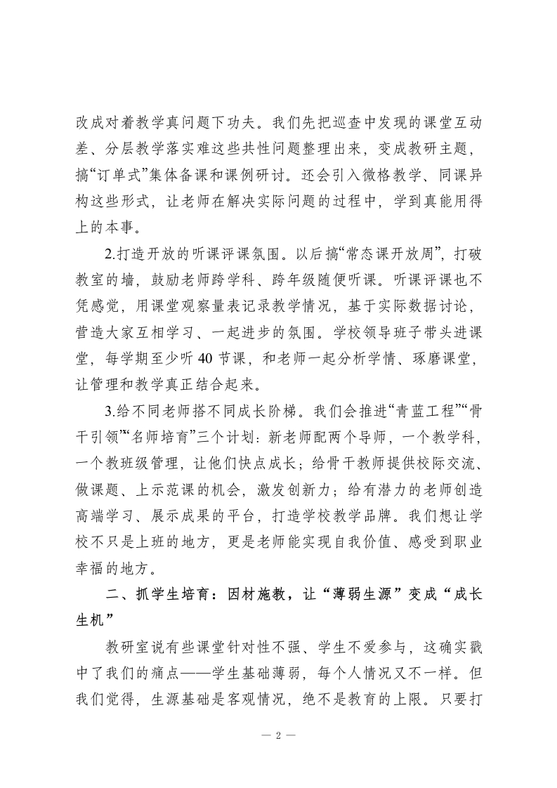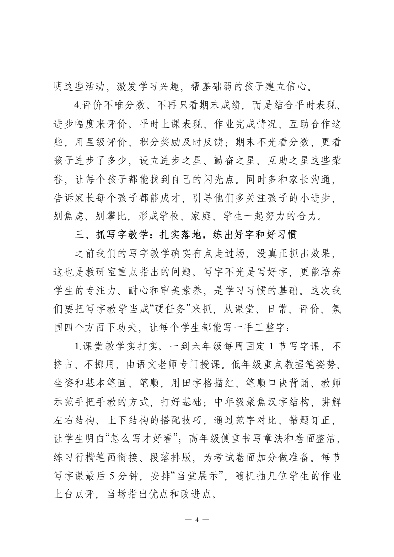 县教研室来校巡查,校长汇报发言:关于提升我校教育教学质量整改提升的反思县教研室的各位领导:老师们,大家好!这次教研室来我校开展常态课巡查,不光是给教学做了次全面体检,更给我们敲了个响警钟。各位专家提的问题特别实在,一下子点出了我们教学里藏着的深层问题。作为校长,我心里清楚责任扛在肩上,得带着全校老师直面问题、好好反思,借着这次机会把学校教育教学质量提上去。经过大家一起梳理讨论,现在制约我们发展的主要是三个问题:老师专业成长不均衡、学生生源基础薄弱、写字教学有点浮于表面。这些问题躲不开、绕不过,只能对着症结找办法、精准发力。下面我把整改想法和接下来的计划跟大家说说,也请各位领导多提宝贵意见。一、抓教师队伍:抱团成长,让教书从“谋生”变成“热爱”教研室反馈的问题让我们明白,老师的专业能力强了,教学质量才能真上去。平时上课暴露的教学目标不明确、教法老套、课堂效率低这些问题,根子就在没给老师搭好专业成长的平台,也没调动起大家主动提升的积极性。接下来我们重点做这三件事:1校本研修不搞“一刀切”。再也不搞填鸭式的统一培训了,1