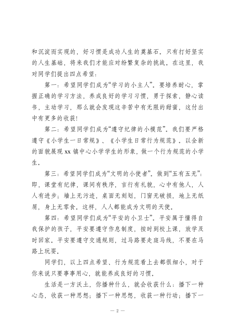 小学副校长在国旗下讲话培养良好习惯,奠基美好人生老师们、同学们:早上好!在这个美好的早晨,我们又相聚在国旗下,我非常高兴。今天我讲话的主题是:《培养良好习惯,奠基美好人生》。爱因斯坦有句名言:“一个人取得的成绩往往取决于性格上的伟大。”而构成我们性格的,正是日常生活中的一个个好习惯。好习惯养成得越多,个人的能力就越强。养成好的习惯,就如同为梦想插上翅膀,它将为人生的成功打下坚定的基石。每个人的言行举止之间,都传递着丰富的文明信息。审视有些同学的行为,不难发现种种不规范、不文明的言行,如过马路、骑车不遵守交通法规,有许多同学在校园内横冲直撞,追赶打闹;上课说闲话;在教室里大声喧哗;广播操做成了“休闲操”;垃圾桶变成了投篮筐;考试作弊等等。再看看开学以来我们同学的表现,有人勤奋,有人懒惰;有人认真,有人马虎:有人珍惜时间,有人挥霍光阴;有人明天的事情今天做,有人今天的事情明天做…经验告诉我们只有勤奋好学、遵守纪律的人才能收获幸福。事实告诉我们,良好的行为习惯是一个学生品德修养的外在表现,是保证良好学习的前提,也是树立健康人格的基础,有怎样的行为习惯,就会有怎样的人生!同学们,良好习惯是通过每一天、每一步良好行为的积累1