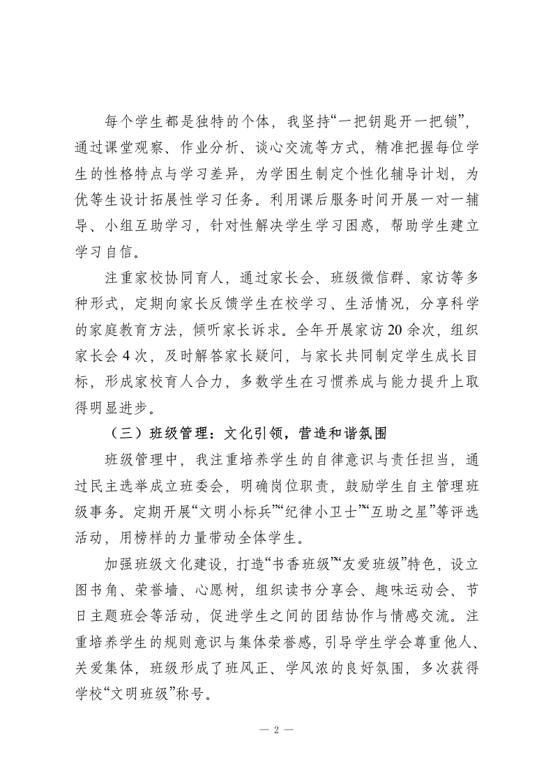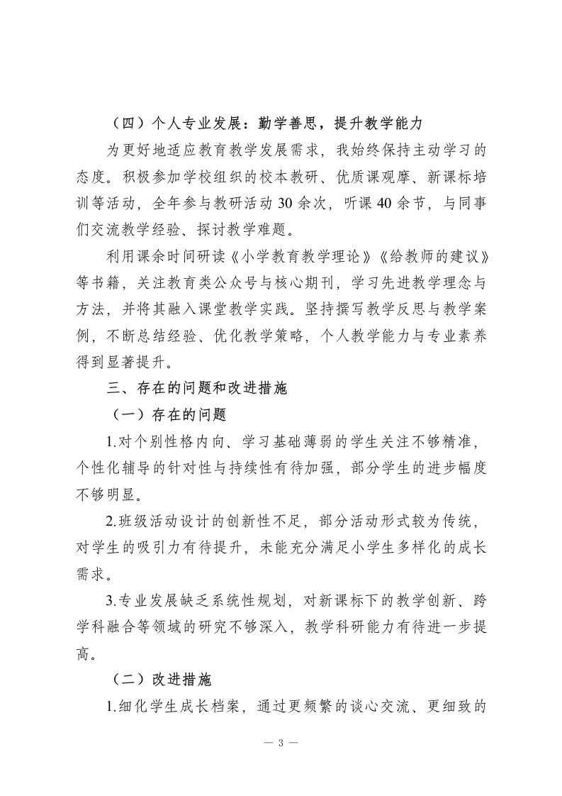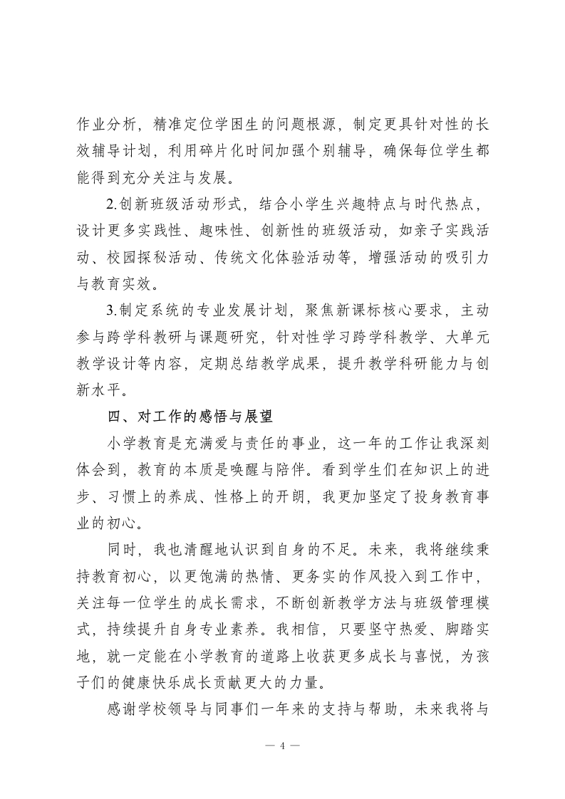 小学教师2025年度工作总结一、工作概述2025年度是我投身小学教育事业的第五个年头。这一年,我始终秉持“以生为本、润物无声”的教育理念,全身心投入教学与班级管理工作,在夯实教学基础、培育学生素养的同时,不断提升自身专业能力,努力为学生的童年成长保驾护航,收获了满满的成长与感悟。二、工作内容与成果(一)课堂教学:趣味赋能,筑牢成长根基小学阶段是学生学习兴趣与习惯养成的关键期,我始终聚焦课堂实效,积极探索贴合小学生认知特点的教学方法。课堂上,灵活运用情境教学、游戏互动、小组合作等策略,将抽象知识转化为具象体验,增强学生参与感和主动性。例如,在数学课堂设计“超市购物”模拟活动,在语文课堂开展角色扮演、故事创编等环节,让学生在玩中学、学中悟。注重培养学生的核心素养,通过启发式提问引导学生主动思考,鼓励大胆表达独特见解,着力培育问题意识与创新思维。同时,结合教学内容设计手工制作、实践探究等活动,锻炼学生的动手能力与合作意识,让课堂既充满童趣,又富有教育深度。本年度,所教班级学生学习兴趣浓厚,学科成绩稳步提升,在年级质量检测中表现优异。(二)学生成长管理:因材施教,助力全面发展-1