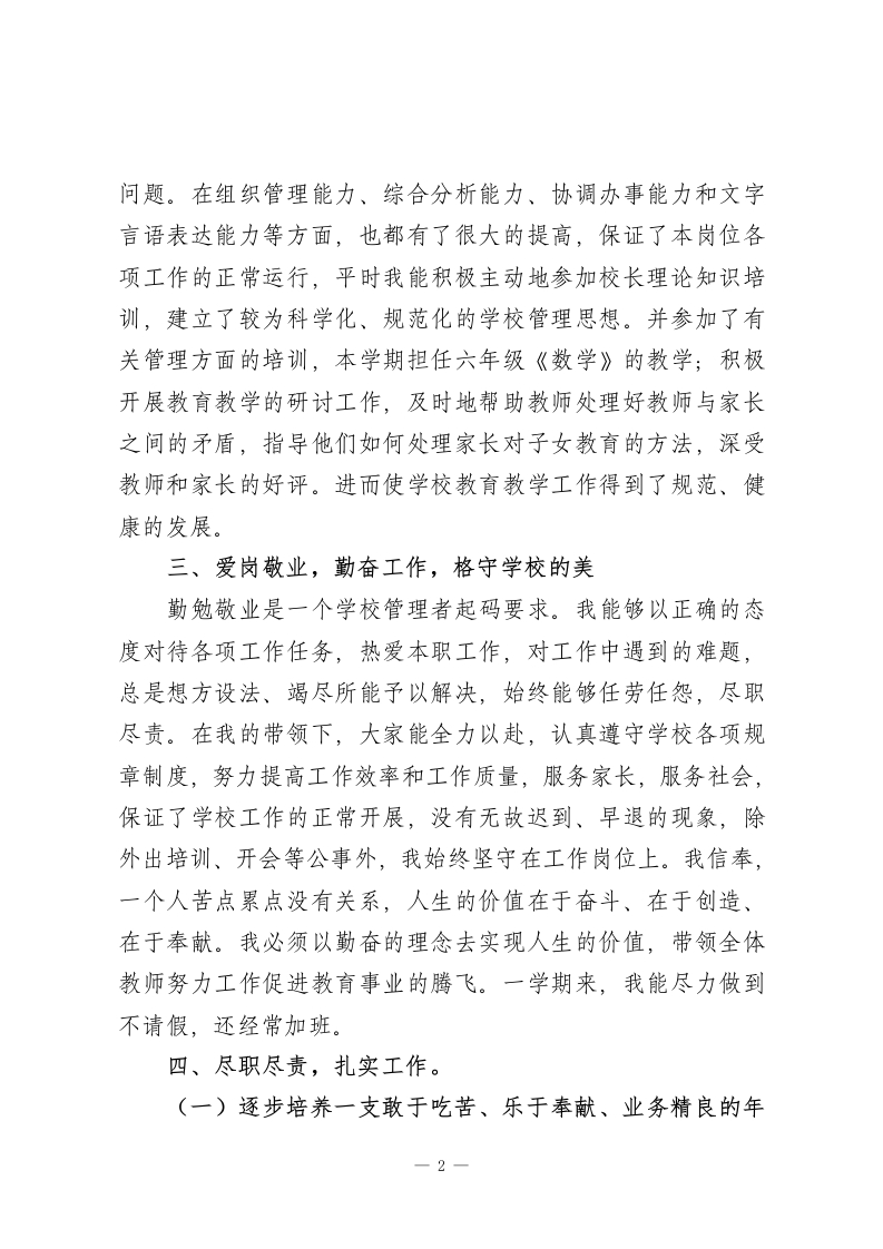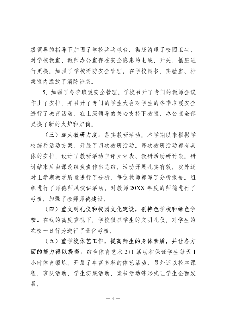 校长个人工作总结我始终坚持踏实做事、严格管理的做法。开拓进取,锐意创新。为办人民满意的教育面努力工作本学期以来,在上级领导和全体教师的关爱、支持下,我始终牢记并认真践行本人:“踏实做事、严格管理”的工作格言,认真履行职责,坚持原则,无私奉献,较出色地完成了各项工作任务。现将本学期本人的工作总结如下:一、加强理论学习,注重自我修养政治理论学习是立身之本,成事之基。一学期来,我一直将理论学习作为自身的重要任务,自觉做到勤学多想,努力增强党性观念,提高思想政治素质,牢固树立马克思主义的世界观、人生观、价值观,保持良好的道德风尚。并身体力行,激发自己的政治责任感和奋发进取的精神,不断朝着新的目标奋进。在工作和事业面前,我历来顾全大局,从不争名夺利,不计较个人得失,认真执行上级有关部门的规定,与学校干部教师一道打造良好的育人环境,创设优越的学校品牌,全心全意为人民服务,做到忠于职守,保证学校班子与上级组织高度一致,在思想上、政治上、业务上不断地完善自己,更新自我,使自己真正树立科学的发展观、正确的政绩观和牢固的群众观。二、求真务实,不断提高自身的工作能力本人在自己的工作岗位上,经过不断学习、不断积累,有了一定的工作经验,能够较熟练地处理日常工作中出现的各类1