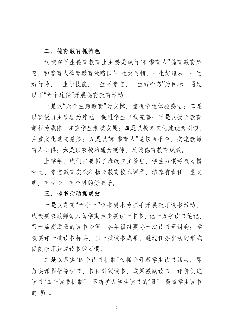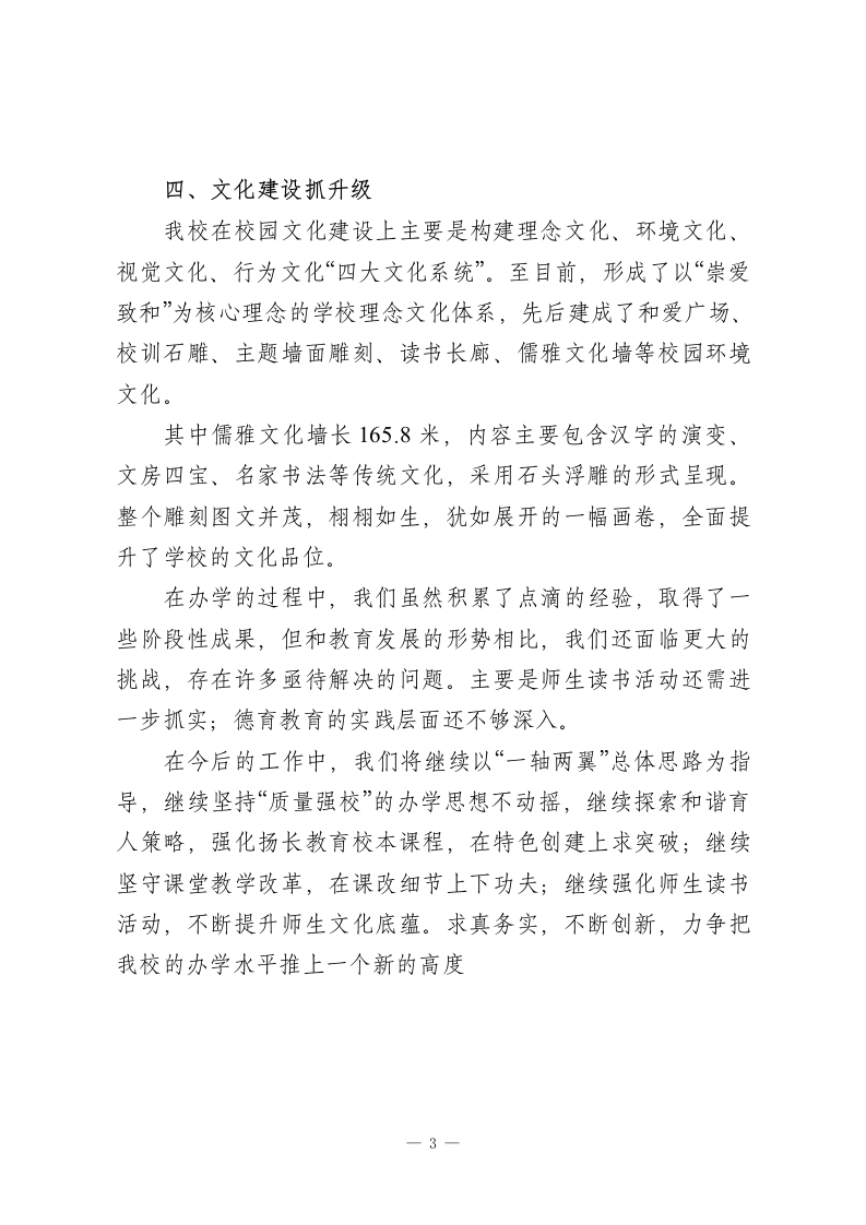 校长工作汇报立足生本抓课改,着眼育人创特色各位领导、各位同仁:下面我就我校在过去的一年里落实“一轴两翼”工作思路的情况向各位领导和同仁做以汇报和交流。一、课改工作抓细节一是以落实“四种培训”为抓手提升教师课改能力。即落实好校内岗位培训、校际交流培训、外出轮流培训、网络研修培训四种教师培训机制。上学年,我们分四批带领教师前往上海、广州参加了全国性的班主任及微课、翻转课堂培训。培训班主任101人,科任教师114人。二是以落实“四清”质量措施为抓手抓实课改过程细节。通过抓学生自主学习、当堂达标检测落实“堂堂清”;通过生生盯背、师生盯练等措施落实“日日清”;通过周清卷、查缺补漏落实“周周清”;通过质量检测、质量分析、查缺补漏落实“月月清。同时,我们还注重抓集体备课、抓上课流程、抓教学反思等课改细节,不断提高课堂教学效率。三是以强化教师责任考核为抓手促进课改管理落到实处。学校出台了责任考核标准,学校管理人员依据考核标准结合各自分管的工作进行分层考核。通过责任考核来规范教师教育教学行为,促进常规管理,落实课改措施,提高教学效率,提升管理效能。一1