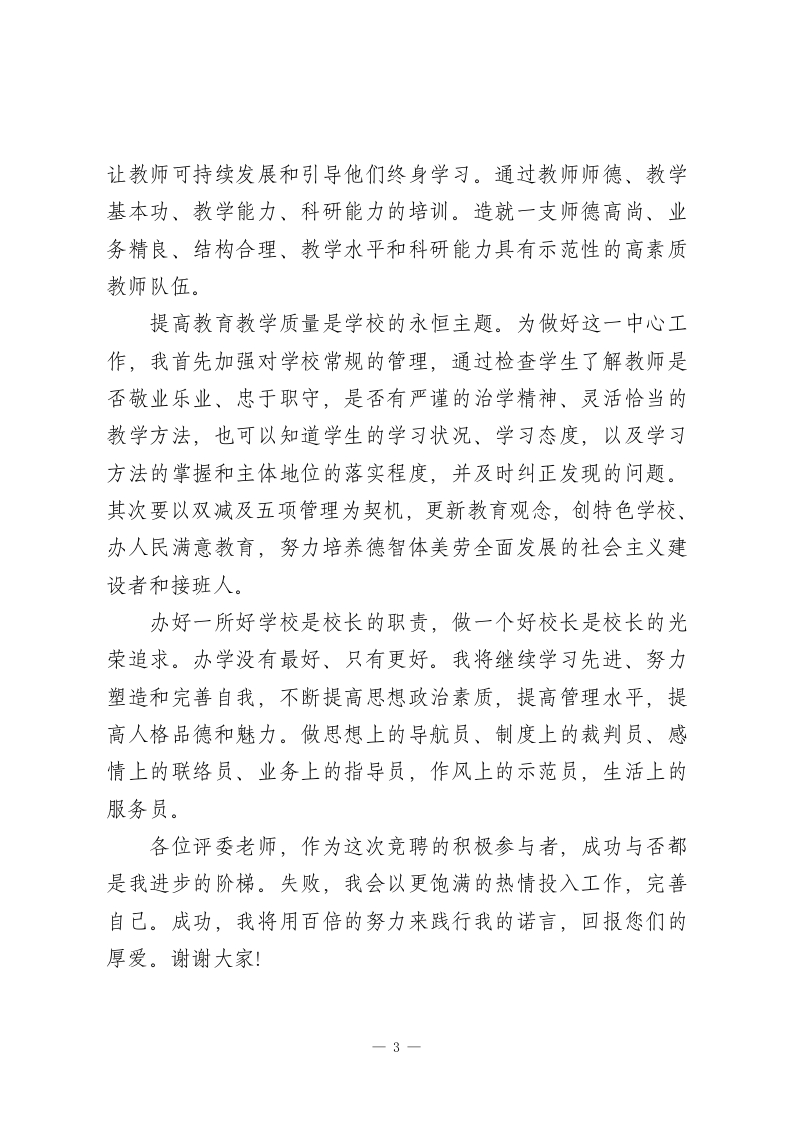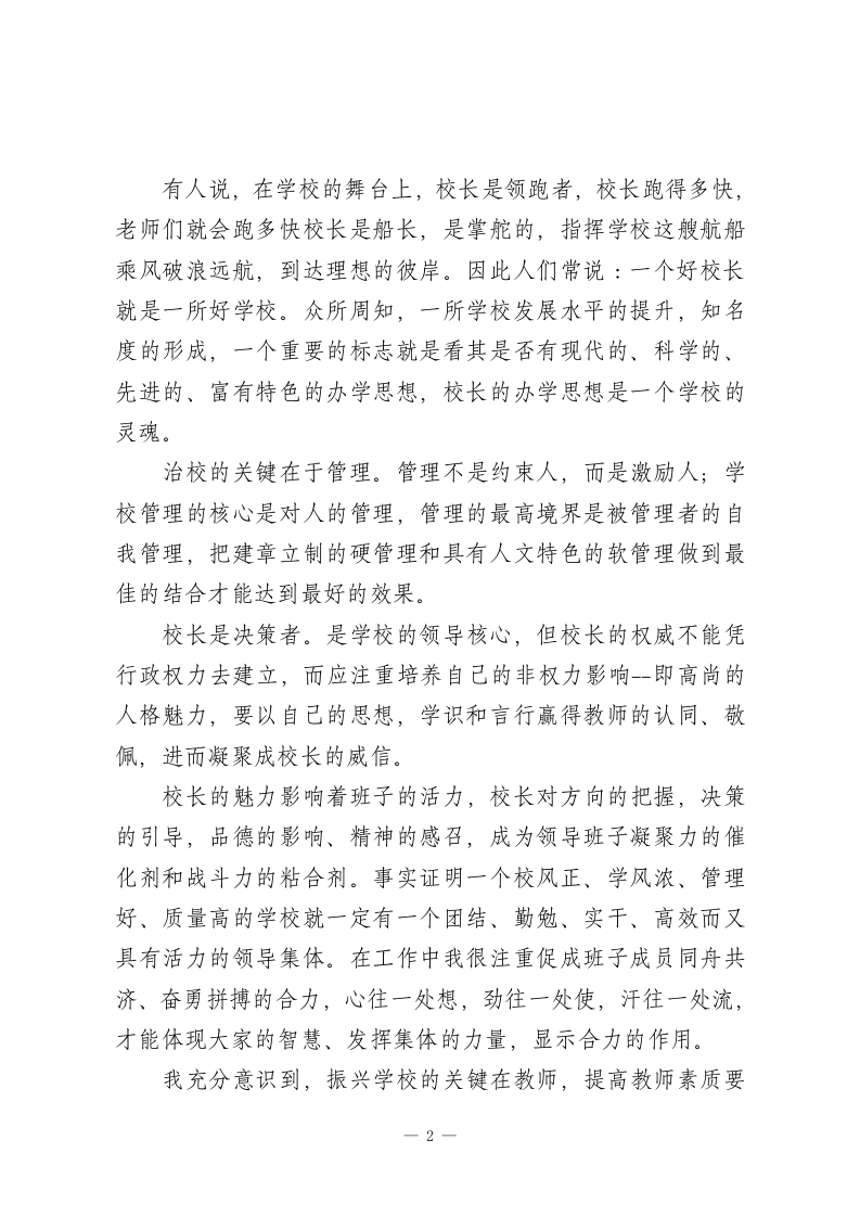 校长竞聘讲话办好一所好学校是校长的职责,做一个好校长是校长的光荣追求尊敬的各位评委老师:你们好!首先感谢你们给我这次学习、锻炼的机会!下面首先向大家汇报一下我的工作情况:忠于人民教育事业是我始终不悔的选择和追求。记得儿时父母曾对我说过“老师是世上最崇高的职业,他们燃烧自己,照亮他人他们盼望我们的心田开出最美的花,帮助我们实现梦想,到达理想的彼岸"。20XX年大学毕业后,我毫不犹豫选择回乡奉献我所爱所钟情的家乡教育事业,几次优厚的转行机会没有动摇我的从教初心,坚持用手中的粉笔书写自己平凡的人生。我曾经长期在城乡第一线担任教学和教育管理工作-一既有城区优质学校又有边远山区薄弱学校既有小学初中高中,又有教育局的工作经历即长期担任班主任及教学工作,又从事学校教育管理工作。无论任务多繁重,我都坚决服从。20XX年,我积极响应组织号召,毅然放弃城区优越的工作生活条件,来到Xx县最偏远的乡镇支持山区教育事业。任职X后,我坚持把立德树人作为根本任务,干一行、爱一行,钻一行、精一行,学思践悟、开拓创新、以身示范,X次被评为。。。接下来向各位评委老师汇报一下我对校长岗位的理解。一1