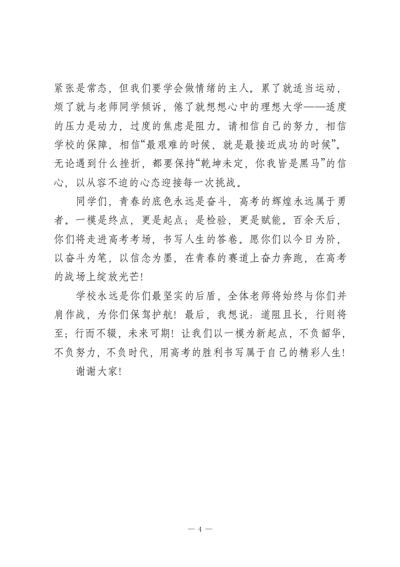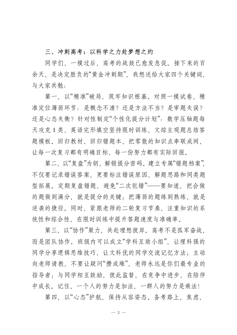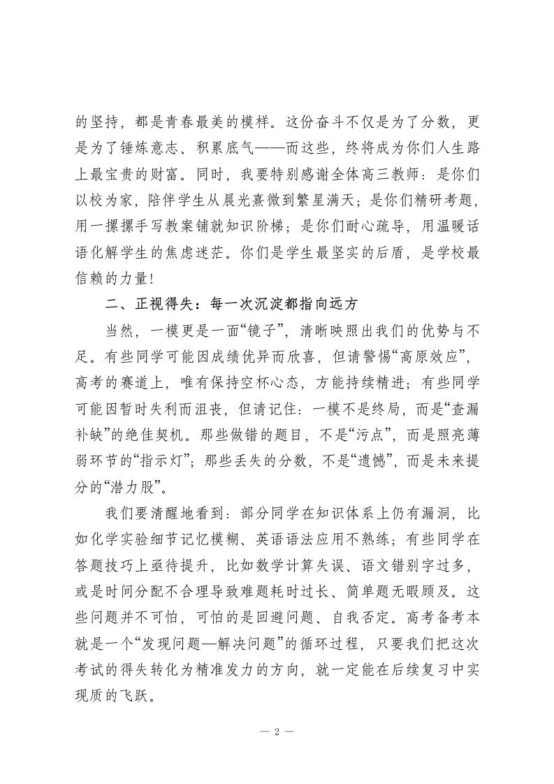 校长在高三一模考试后的鼓劲讲话:以模考为阶,向巅峰攀登尊敬的各位老师,亲爱的高三同学们:大家下午好!春寒渐退,壮志正浓。在距离高考仅剩百余天的关键节点,我们共同迎来了一模考试的收官时刻。今天,我们齐聚这里,不是为了定格一时的分数,而是为了校准前行的方向;不是为了沉溺得失的情绪,而是为了凝聚冲刺的力量。首先,请允许我代表学校,向每一位挑灯夜读、奋力拼搏的高三学子,致以最诚挚的敬意!向每一位深耕讲台、保驾护航的高三教师,道一声最衷心的感谢!一、致敬奋斗:每一份坚持都值得喝彩一模是高考的“试金石”,更是备考路上的“里程碑”。从这次考试中,我们欣喜地看到了全体师生的硬核实力:年级整体上线率较上次提升8个百分点,12个班级实现了全员进步,数学学科难题得分率较往年提高15%,语文作文涌现出多篇立意深刻、文采斐然的佳作。更让我们感动的是那些默默逆袭的身影:有的同学从年级200名跃升至前50名,用每天额外1小时的错题复盘诠释“勤能补拙”;有的同学攻克了长期薄弱的物理学科,用密密麻麻的笔记书写“水滴石穿”。同学们,你们在晨曦微露时的朗朗书声,在星光璀璨下的挑灯夜读,在草稿纸上反复演算的执着,在答疑室里追问不休一1