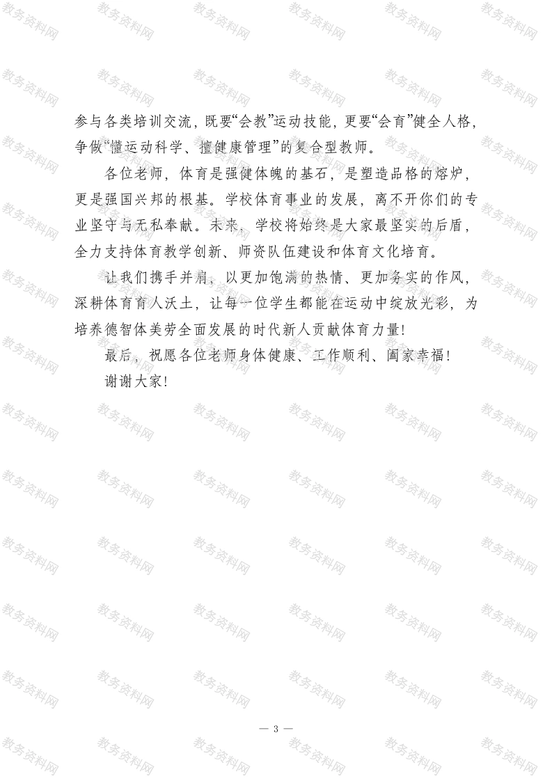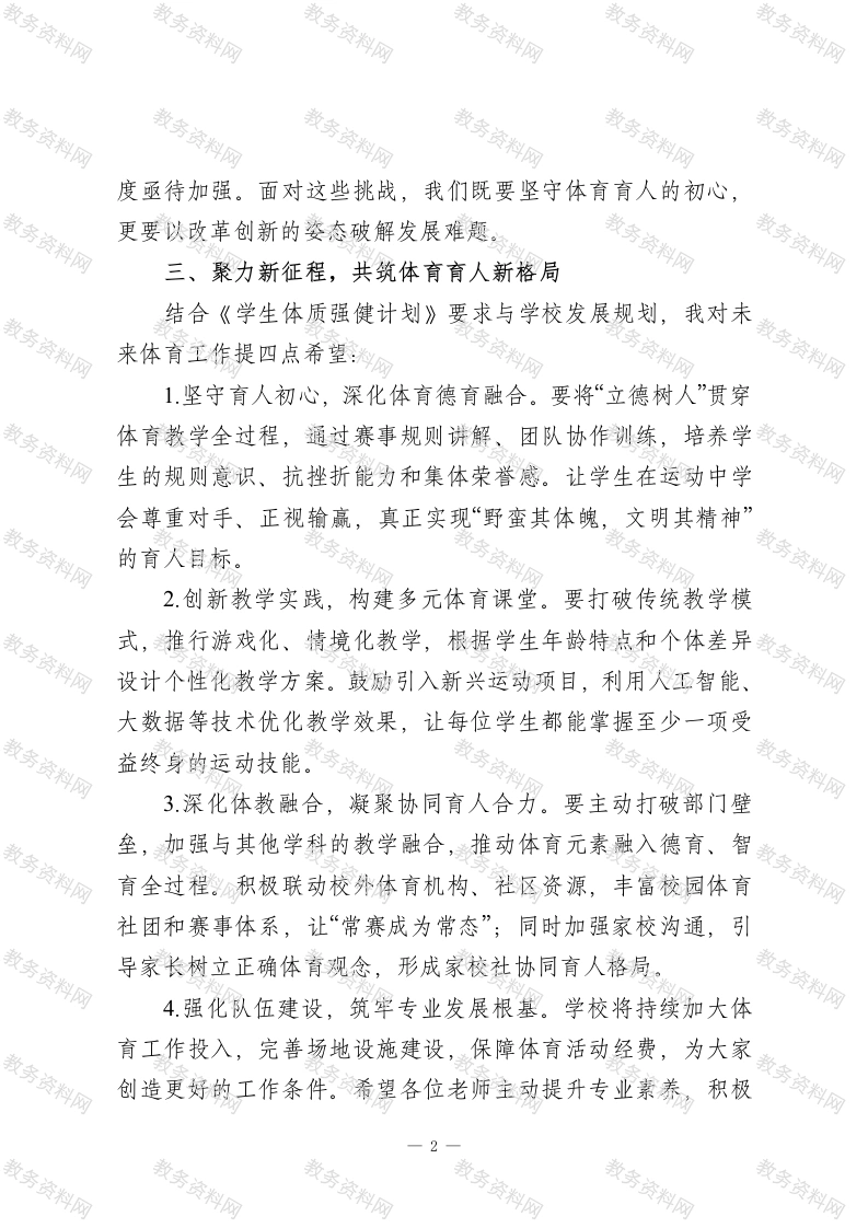 校长在体育教师座谈会上的讲话尊敬的各位体育老师们:大家下午好!今天我们齐聚一堂,既是总结过往体育工作的丰硕成果,更是共商学校体育事业高质量发展的未来蓝图。首先,我谨代表学校,向长期坚守教学一线、用汗水浇灌学生健康成长的各位体育教师,致以最诚挚的感谢和崇高的敬意!一、回首耕耘路,体育之花硕果盈枝近年来,我校体育工作在大家的共同努力下,交出了亮眼答卷:学生体质健康达标率持续提升,在各级各类体育赛事中屡创佳绩,田径场上的疾驰、球类赛场的拼搏,无不彰显着我校学子昂扬向上的精神风貌。更可贵的是,大家精心设计每一堂体育课,从基础队列训练到特色项目教学,从趣味运动游戏到校园体育节,让学生在运动中享受乐趣、增强体质、锤炼意志。通过小班化教学、项目式训练等创新实践,我们既保障了全民健身的普及性,又实现了体育精英的精准培养,充分彰显了“五育并举”中体育的独特价值。二、直面新挑战,锚定发展新坐标在肯定成绩的同时,我们也要清醒认识到当前体育工作面临的新形势:部分学生受学业压力影响,体育锻炼的主动性有待提升;体育场地设施虽持续改善,但仍需适配学生多样化运动需求;体教融合的深度与广度仍需拓展,优质资源的整合力1