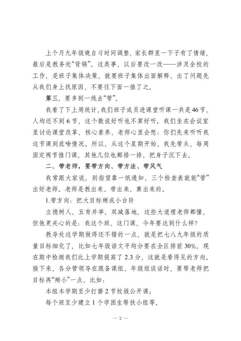 校长在学校班子会议上的讲话:带队伍要走在前面,不是只会在后面管!各位班子成员:今天这个会,我不讲别的,就想跟大家围绕一句话掰扯掰扯:好团队是带出来的,不是管出来的。我们现在有老师127人,真正跟学生“面对面”的是他们,不是我们。办学质量、立德树人、双减效果、五育并举落实得怎么样,说到底,看的是教师队伍的精气神。而教师队伍的状态,很大程度上又取决于我们这个班子,取决于我们怎么带。我想从三点说,说得比较直,大家别往心里去,多往工作里去。一、先把我们班子这支“队”带好说实在话,要老师相信学校、相信发展方向,前提是他们先要相信我们这帮人。一个东一榔头西一棒槌的班子,是带不出有战斗力的队伍的。第一,要同向发力。今年我们定的目标很清楚:教学质量整体上一个台阶,安全工作零事故,双减落到实处。这些不是校长一个人的目标,是我们整个班子的共同方向。碰到难事,不能有人踩刹车、有人加油门,更不能“当面一套、会后一套”。第二,要敢担责、会兜底。1
