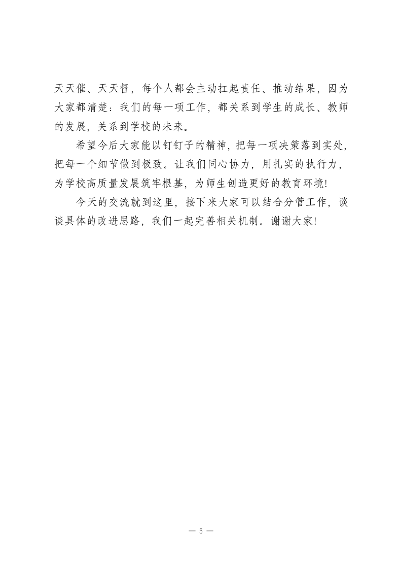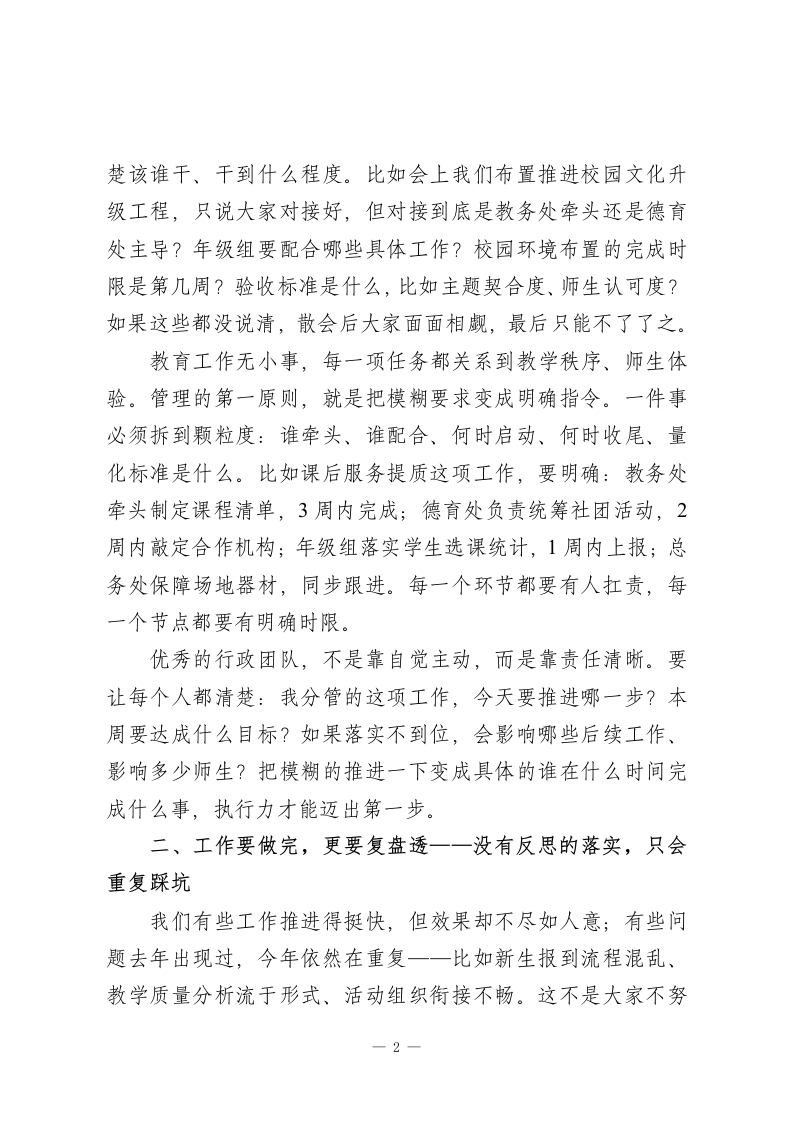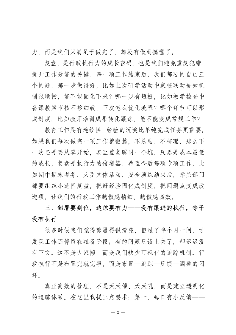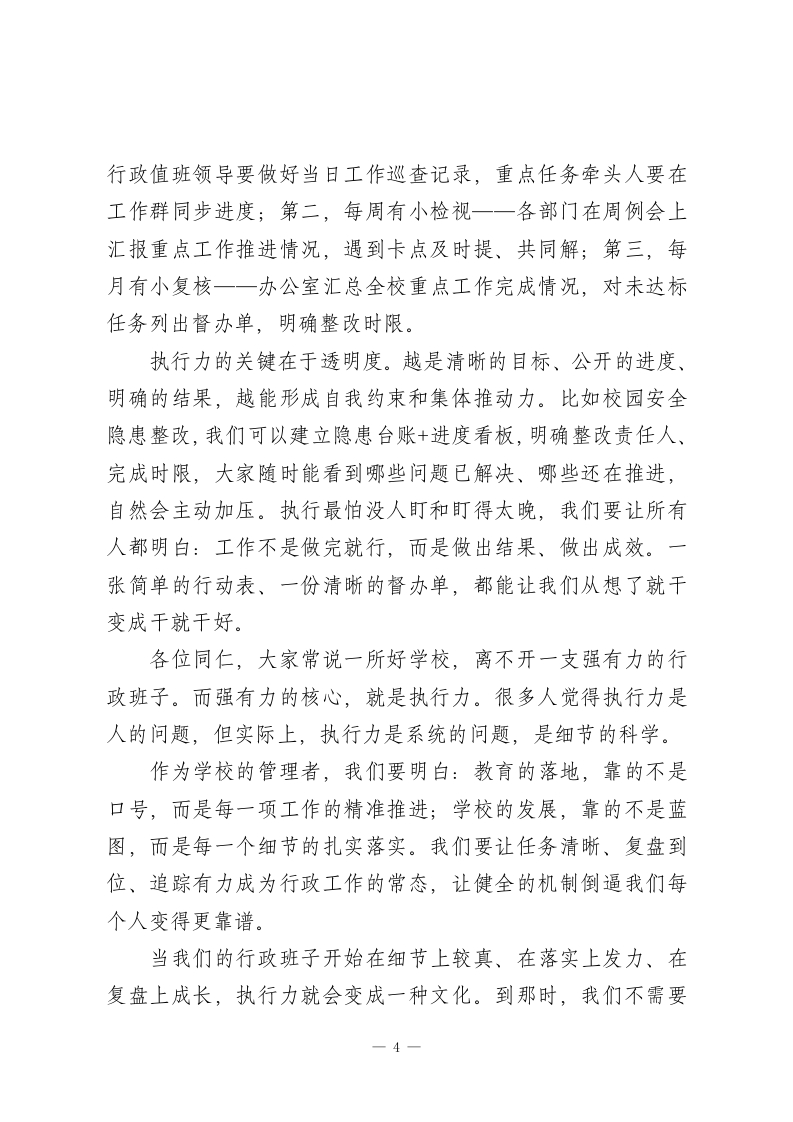 校长在学校行政班子会上发言:以细节破局,以执行聚力各位行政班子的同仁们:大家上午好!今天我们利用班子会的时间,专门围绕提升“行政执行力、夯实学校高质量发展根基”这个核心话题深入交流。作为学校的中枢神经,我们每一项决策的落地、每一项工作的推进,都直接关系到教育教学质量的提升、师生的切身利益,更关系到学校的长远发展。近期我观察到一个现象:我们不乏站位高远的规划、细致周全的方案,比如课后服务提质、德育品牌打造、校园安全排查等工作,会上大家讨论热烈、信心满满,都表态坚决落实、全力推进,但到了实际落地环节,却常常出现层层打折、进度滞后的情况一一有的工作悬在半空、有的细节不了了之、有的问题反复出现。很多时候我们觉得是大家不够勤快、落实不够有力,但深究下来会发现,执行力的短板,往往藏在那些被我们忽略的细节里。今天,我想结合学校工作实际,和大家重点探讨三个关键问题,这也是决定我们行政班子执行力的核心所在:一、任务要拆到根,责任要落到人一一模糊的部署,必然导致低效的落实我们行政工作中最常见的问题,不是没人干,而是没人清1
