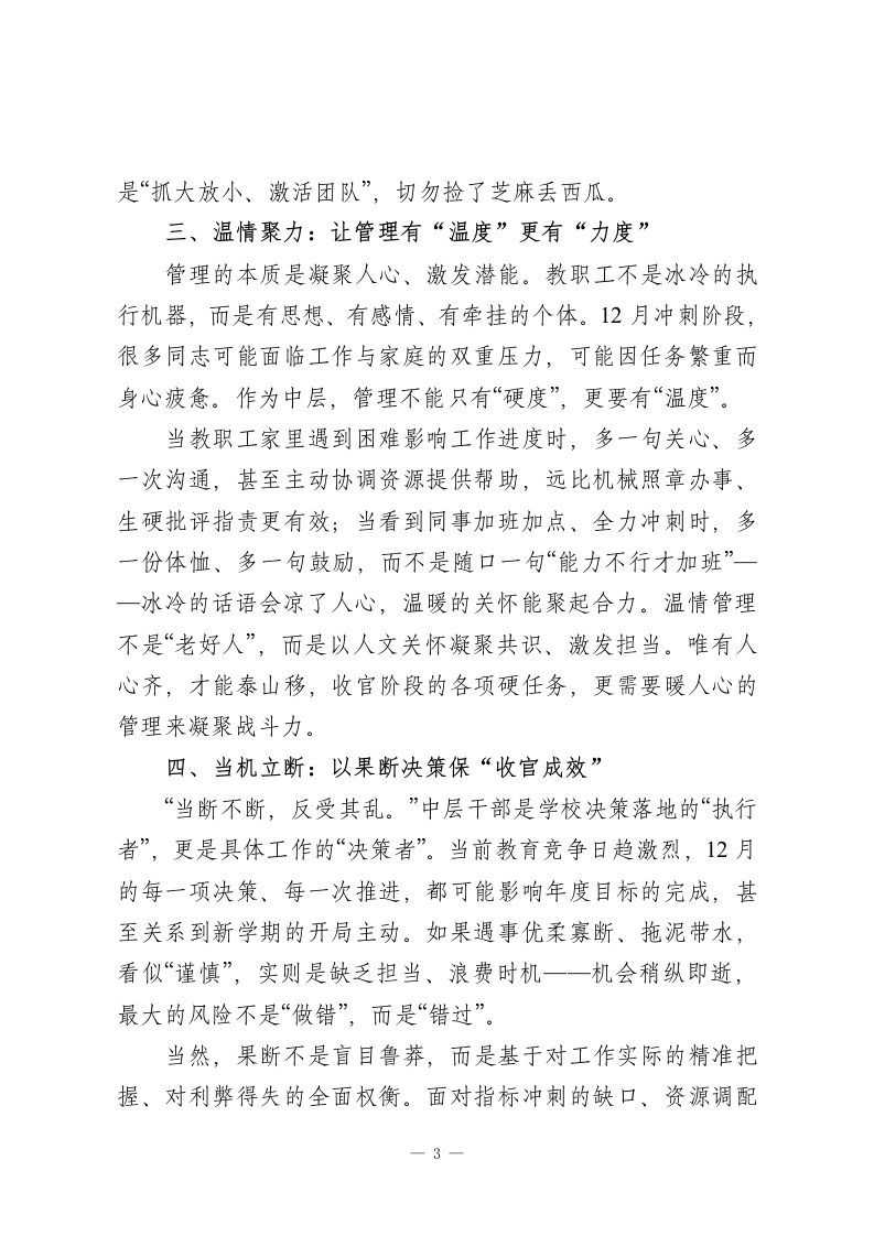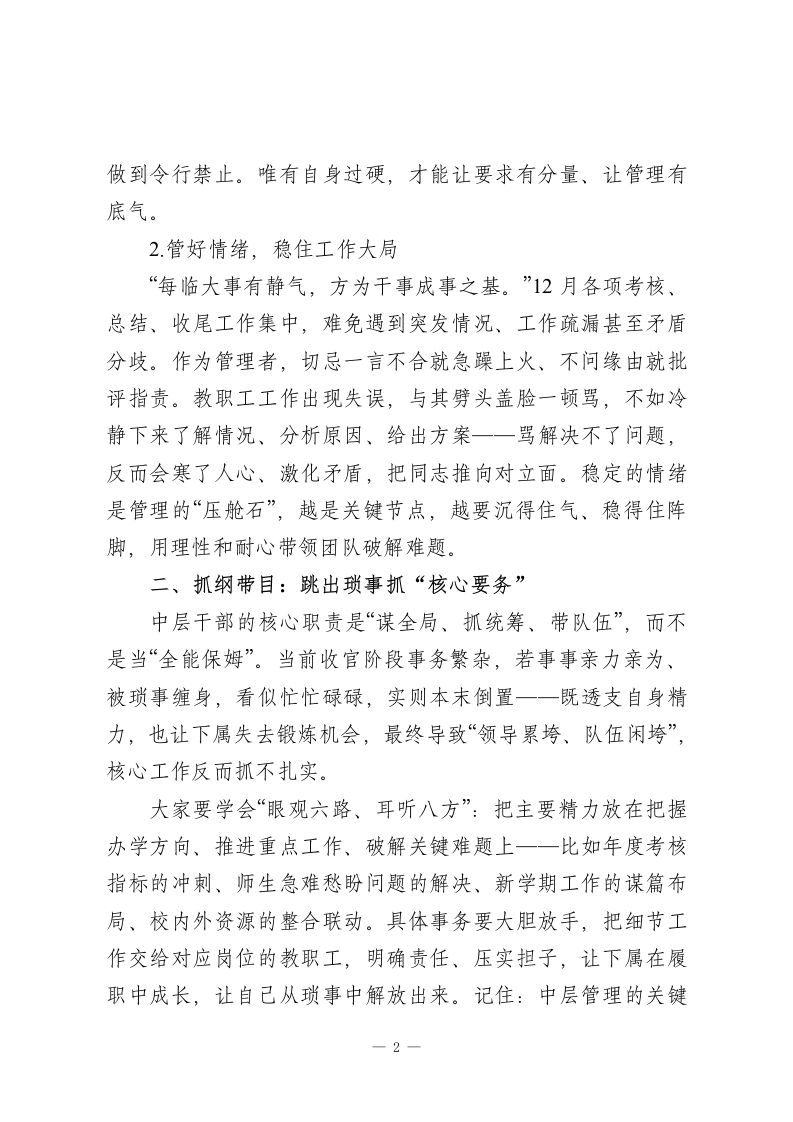校长在学校中层班子会上的讲话:决胜12月,赢在新开局!各位中层干部:大家上午好!时光飞逝,转眼间已进入12月,全年工作即将收官,新学期规划也已提上日程。今天我们召开中层行政班子会议,核心是聚焦“决胜收官、谋篇开局”,明确当前关键任务,更要强调:中层作为学校的“中坚枢纽”,是衔接校党委决策与师生实践的关键环节,你们的管理能力直接决定学校办学质量的成色。要想带好队伍、扛好责任,轻松高效推进各项工作,我希望大家重点做好四件事:一、以己为范:筑牢管理的“第一根基”“其身正,不令而行;其身不正,虽令不从。”中层干部是教职工的“风向标”,你们的一言一行、一举一动都被师生看在眼里、记在心里,直接影响团队的公信力与执行力。如果连自己都管理不好,何谈带好队伍、推动工作?1.管好时间,守住纪律底线时间管理是管理的基础。作为中层,若自身纪律松弛一一开会迟到、工作拖沓、信息不及时回复、部署任务不了了之,这些行为就像投入湖面的石子,会产生连锁反应,消解团队的规则意识。己所不欲勿施于人,你要求教职工守时高效,自己首先要做遵时守纪的表率;你希望团队执行力强,自己就要先1