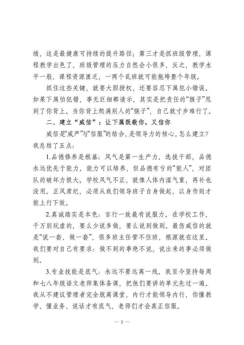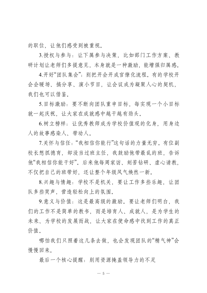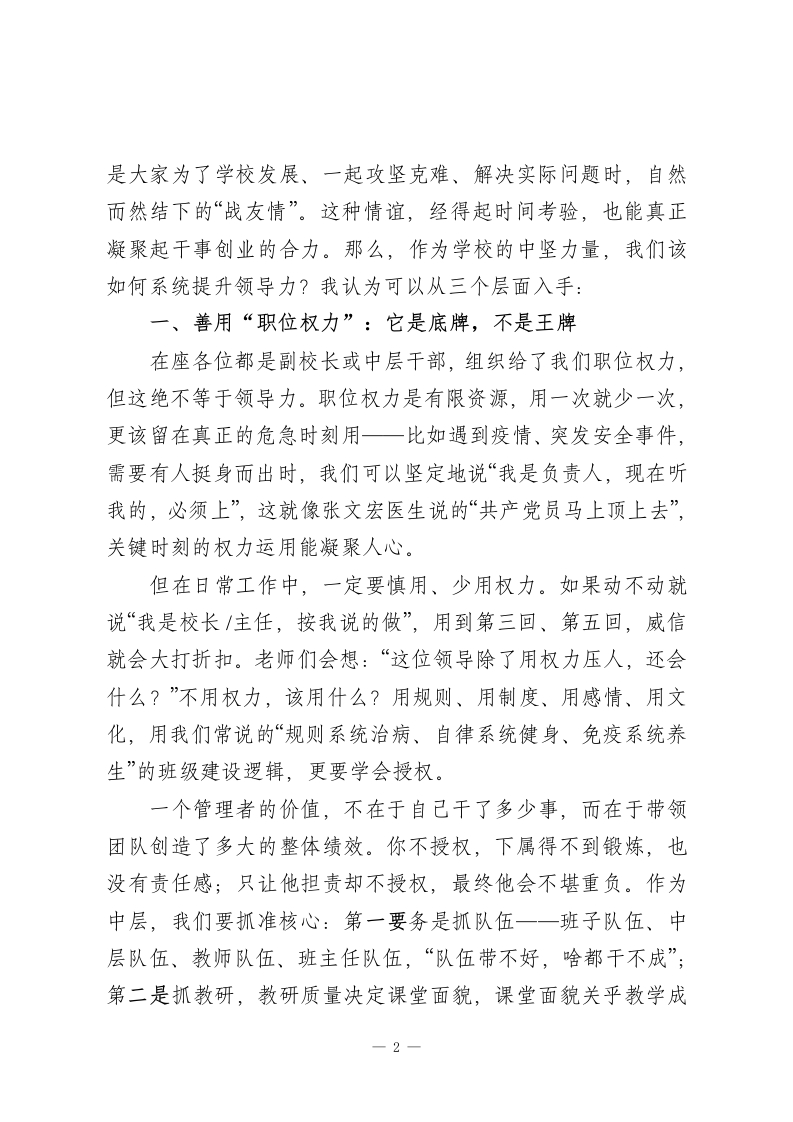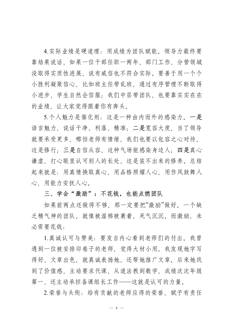 校长在中层班子会议上的讲话:领导力的本质是“点燃人”而非“管人”各位中层干部:大家好!今天我们开这个班子会议,想和大家深入聊聊“领导力”这个话题。经常有同事问我:“怎么才能提升领导力?”其实答案很简单一一别把领导力想得太神秘,也别陷入“管人”的误区。我们学校里,班主任带好一个班、科任老师上好一堂课、部门主任统筹一项工作,甚至协调好同事关系,本质上都是领导力的体现。它不是居高临下的控制,而是让人心甘情愿跟着你,朝着共同目标奋进的“点燃人”的能力。这些年观察我们的管理实践,发现大家凝聚团队的方式大概有四种:一是秉公执法,按制度办事,像包青天一样公平公正;二是江湖义气,靠个人感情维系,讲究“你对我一分好,我还你五分情”;三是帮助拉拢,靠信息差、资源差建立关系;四是小恩小惠,用些物质或情感上的小好处笼络人。这四种方法本身没有绝对对错,大家可能都用过,但如果我们只依赖后三种“关系与感情”,很容易变得刻意,甚至为了维系少数人而牺牲学校整体利益,这条路注定走不远。真正健康持久的团队关系,从来不是饭桌上喝出来的,而1