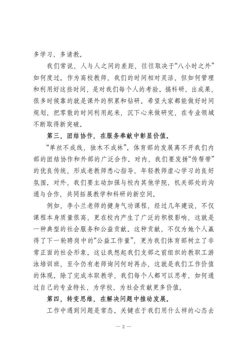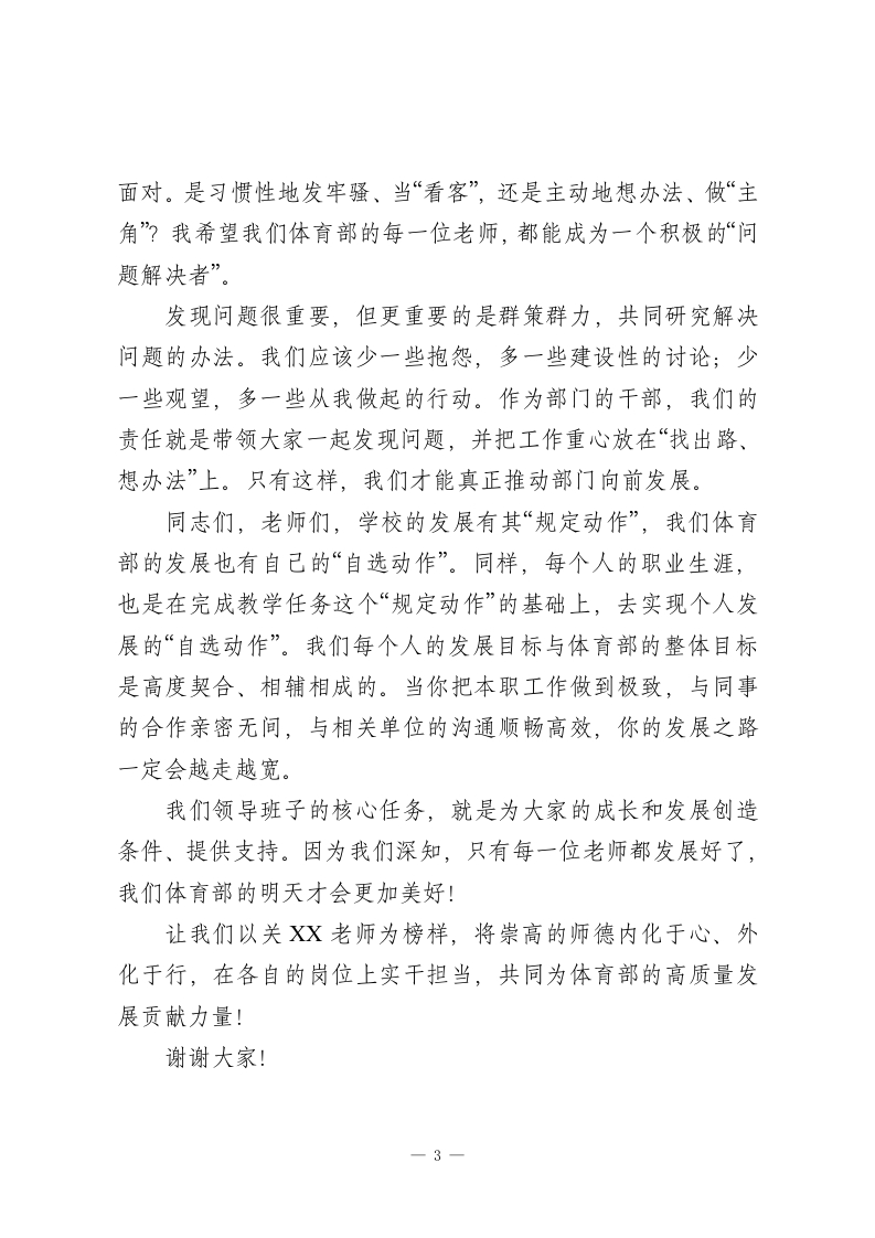 学习模范教师事迹推动体育部高质量发展在学习模范教师关XX同志事迹主题党日活动上的发言同志们:大家好!非常荣幸能在此次主题党日活动上,与大家交流学习关XX老师先进事迹的心得体会。刚才,关XX老师的先进事迹,让我们深受触动。结合我们体育部的工作实际,我想分享以下几点想法,与大家共勉。第一,立足本职,在教学细节中践行初心。教师的天职是教书育人,我们的核心阵地在课堂。关XX老师的先进事迹,首先体现在她对教学工作的极致追求上。对我们而言,这种追求就落实在每一个教学细节中。从备课开始,我们是否投入了百分之百的精力?我们的备课态度是否严谨?在课堂上,我们的教学组织是否有序?我们是否严格遵守了教学纪律和时间?这些看似微不足道的小事,恰恰是师德师风和敬业精神最直接的体现。如果我们能将这些细节做实、做严,我相信,我们在其他工作中也一定能做到精益求精。第二,深耕钻研,在课余时间里寻求突破。教学之外,教学研究和科研工作是推动我们个人成长和学科发展的重要引擎。在座的很多年轻老师都有自己的科研项目,这是非常好的开端。我们中心也有像赵培禹老师这样在课程建设方面经验丰富的教师。我希望年轻老师们能主动“跟进去”,1