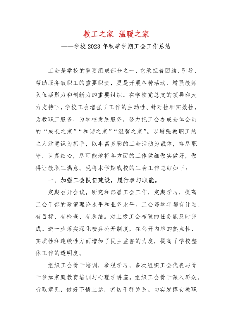 教工之家温暖之家学校2023年秋季学期工会工作总结工会是学校的重要组成部分之一,它承担着团结、引导、帮助服务教职工的重要职责,更是开展各种活动、增强教师队伍凝聚力和创新力的重要组织。在学校党总支的领导和大力支持下,学校工会增强了工作的主动性、针对性和实效性,为教职工服务,为学校发展服务,努力把工会办成全体会员的“成长之家”“和谐之家”“温馨之家”。以增强教职工的主人翁意识为抓手,以丰富多彩的工会活动为载体,恪尽职守、认真细心,尽可能地将各方面的工作做细做实做好,做得让教职工满意。现将本学期我校的工会工作总结如下:一、加强工会队伍建设,履行参与职能。定期召开会议,研究和部署工会工作,定期学习,提高工会干部的政策理论水平和业务水平。工会每学年都有计划、有目标、有检查、有总结。对上级工会布置的任务能及时完成。进一步落实深化校务公开制度,在公开内容的热点性、实质性和连续性方面增加了民主监督的力度,提高了学校整体工作的透明度。组织工会骨干培训,参观学习,多次组织工会代表与骨干参加家庭教育培训与心理学讲座。组织工会骨干深入群众,听取意见,做好下情上达,密切干群关系。切实发挥女教职