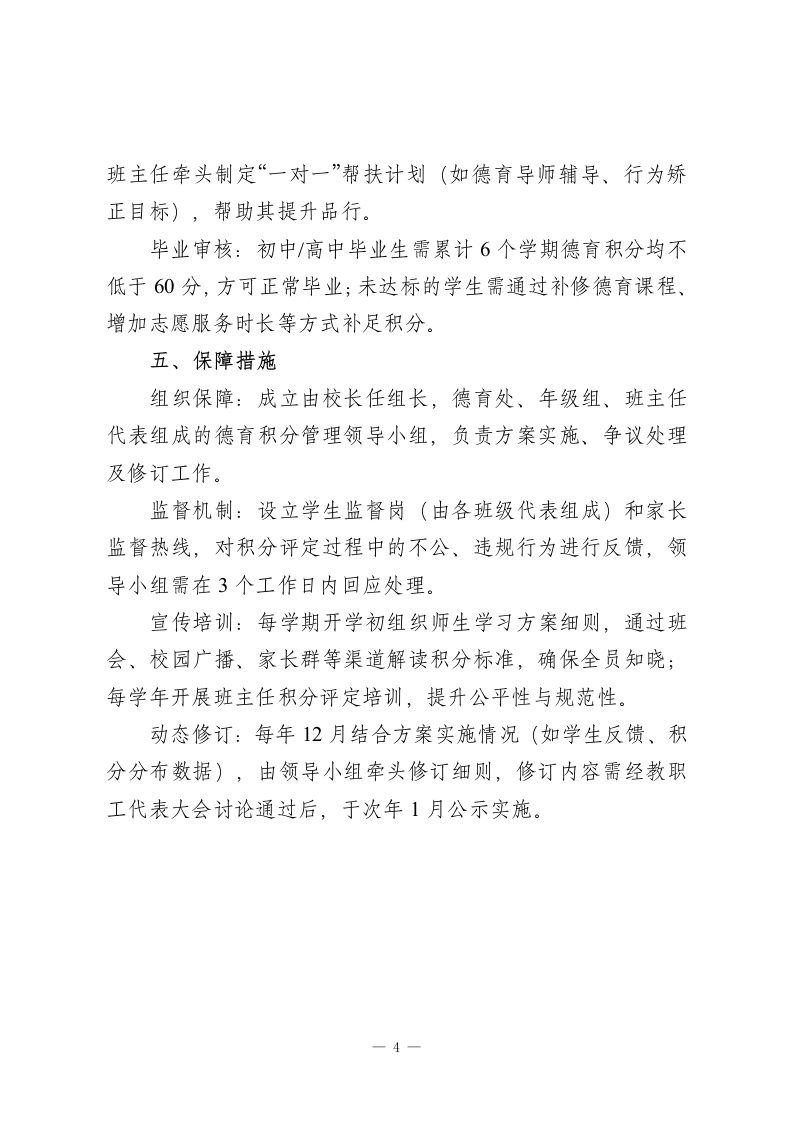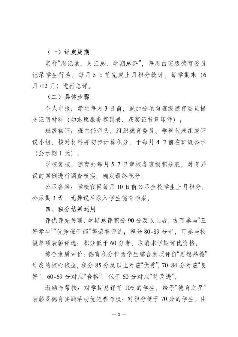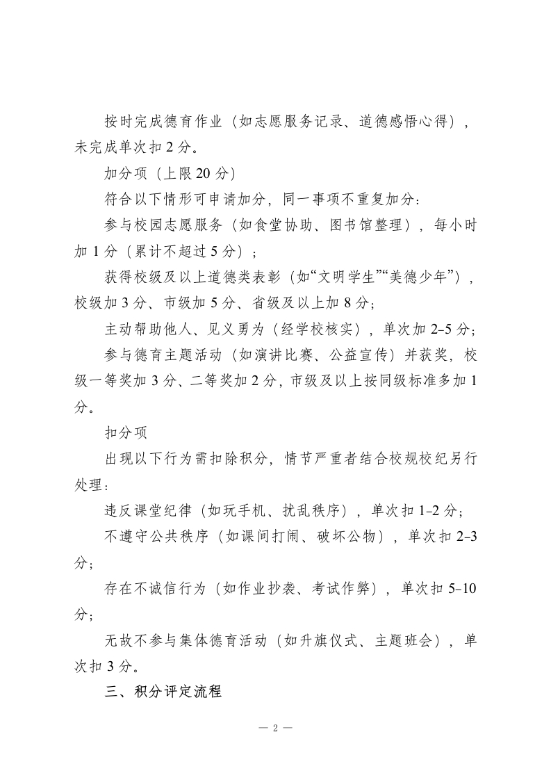 学校德育积分制管理方案(2025年修订)一、指导思想以习近平新时代中国特色社会主义思想为指导,全面贯彻党的教育方针,落实立德树人根本任务,坚持“五育并举、德育为先”原则,将德育积分作为学生日常行为规范、道德素养培育的重要载体,通过科学量化、公平评定,引导学生养成良好品行,培养德智体美劳全面发展的社会主义建设者和接班人。二、积分管理内容(一)积分构成德育积分实行“基础分+加分项-扣分项”累计制,满分100分,其中基础分80分,加分项上限20分,扣分项无下限(但单次扣分不超过10分,累计扣分不影响基础分有效性)。(二)具体细则基础分(80分)】学生需遵守以下基本要求,达标即得基础分,任一要求未达标按对应标准扣减基础分:遵守校规校纪,无迟到、早退、旷课(迟到/早退单次扣1分,旷课单次扣3分);尊重师长、团结同学,无辱骂、冲突行为(发生冲突单次扣2分);保持个人及校园卫生,无乱扔垃圾、破坏环境行为(单次扣1分);一1