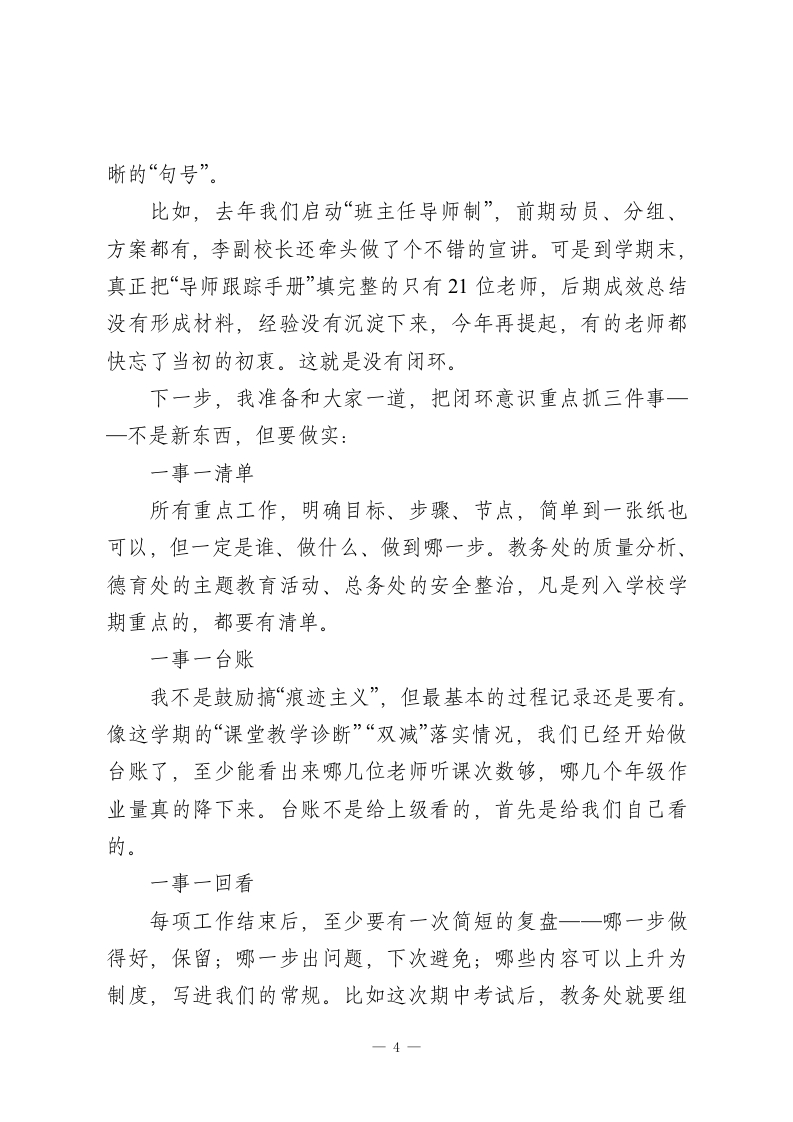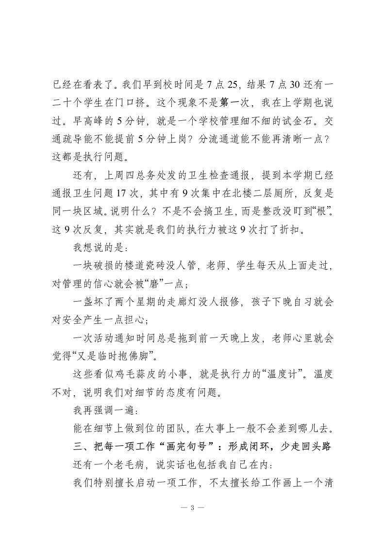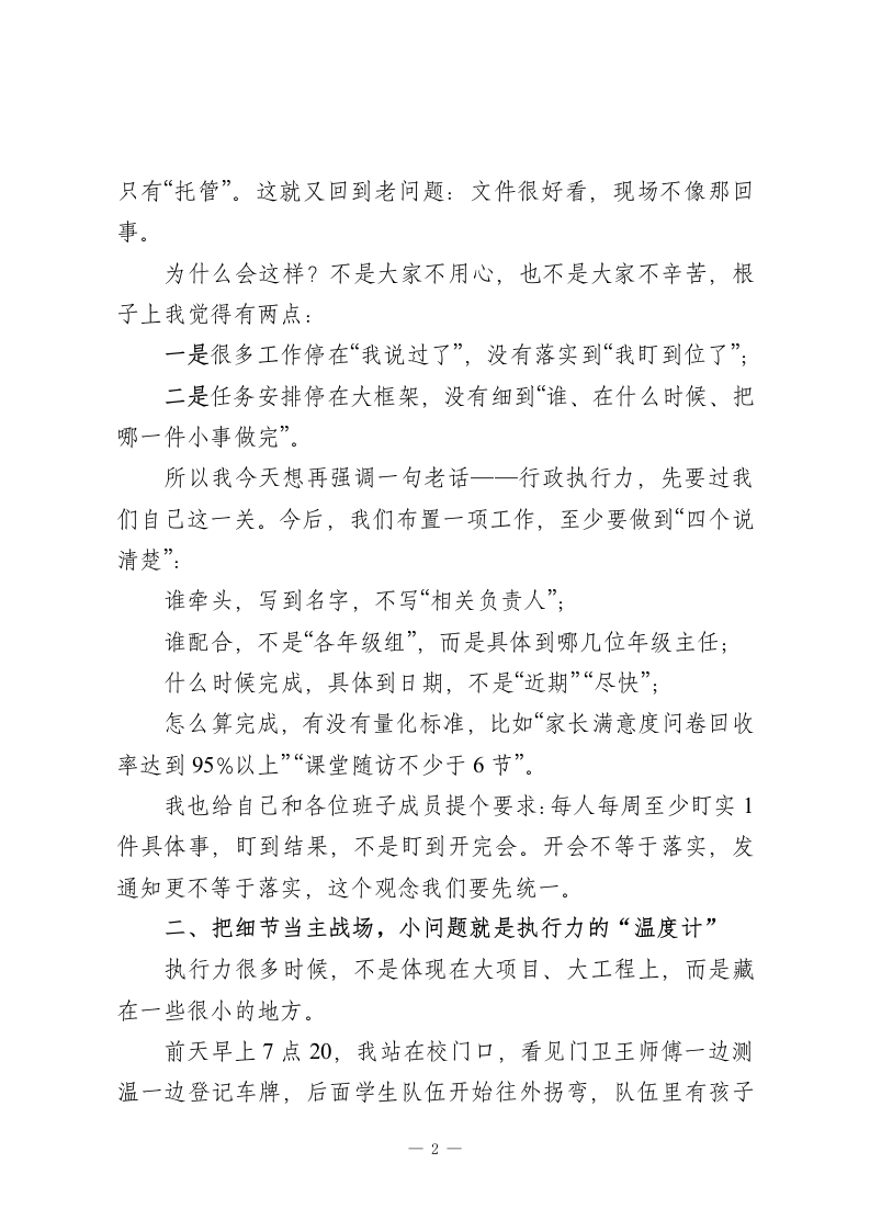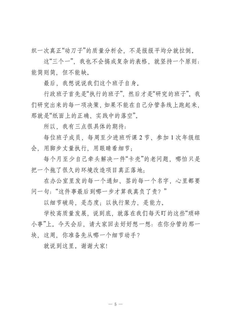 学校行政班子会上,校长讲话:在细节里破局,在执行中聚力!各位班子成员、各位同仁:上午好!这两周大家都忙,质量监测、迎接区里视导、期中备考,事情一件接一件。说心里话,我也在反思:我们学校这几年,规划不少,方案不少,口号也不算少,但有些事,总是“开会开得挺热闹,落地落得不太响亮”。所以今天我想借这个班子会,不讲大而虚的东西,就围绕一个词聊一一执行,再具体一点,就是:在细节里破局,在执行中聚力。一、从“说过了”到“真做到”:执行力先过自已这一关我先说两个很具体的现象,都是最近发生的。第一个,关于校园安全。上个月,我们按照教育局要求,做了一轮安全隐患大排查。台账我看了,很厚,教务处、总务处、德育处都有记录,照片也挺全。但上周我早读前去南楼四层看了一圈,3楼消防栓前还堆着两摞过期宣传画,其中一摞在李主任上次排查记录里已经写了“限期清理”。纸面上“整改完成”,现场还在那堆着。这就是典型的一工作做了,事情没了结。第二个,关于课后服务。我们开了两次专题会,方案写得很漂亮:分层作业、社团活动、“五育并举”、劳动教育样样都有。可我上周三去七(3)班看课后服务,孩子一屋子在那写卷子,社团课程表贴在走廊上挺好看,就是教室里看不见“提质”,1