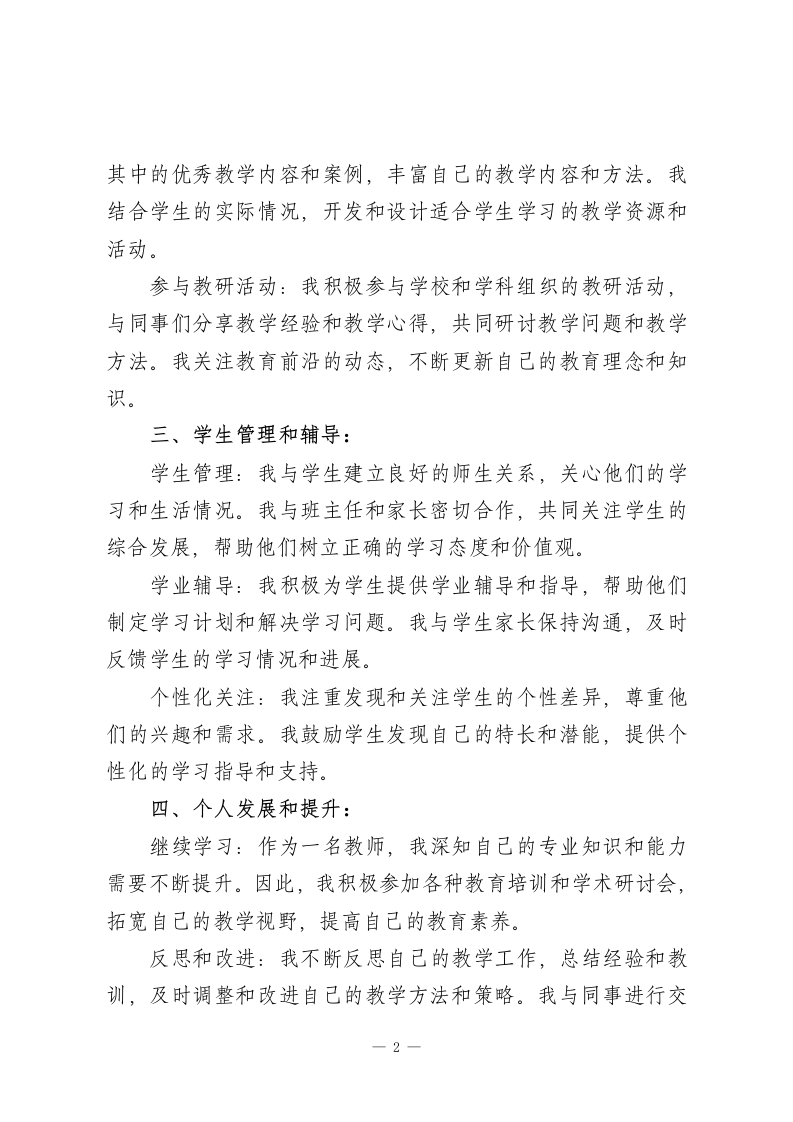 英语学科教师工作总结作为一名英语学科教师,我从教育事业的初心出发,不断努力提升自己的专业水平和教学质量,致力于为学生提供优质的英语教育和全面的发展。以下是我在教学工作、教研工作、学生管理和个人发展等方面的总结:一、教学工作:教学内容和方法:我紧密结合教材和教学大纲的要求,科学安排教学内容和进度,确保学生掌握英语的听、说、读、写能力。我注重启发式教学,通过提问、讨论和实践等方式,激发学生的学习兴趣和参与度。提高听力和口语能力:英语是一门语言学科,我注重培养学生的听力和口语能力。我通过大量的听力材料和口语练习,提高学生的听力理解和口语表达能力,培养他们的语言交际能力。阅读与写作指导:我注重培养学生的阅读理解能力和写作能力。我引导学生学会分析文章结构、理解文章主旨,并通过课堂讲解和写作指导,帮助学生提高阅读和写作水平。创新教学方法:我不断探索和尝试创新的教学方法,如使用多媒体教学、游戏化教学等,使课堂更加生动有趣,激发学生的学习兴趣和主动性。二、教研工作:教学资源和教材研究:我认真研究教学资源和教材,挖掘-1-