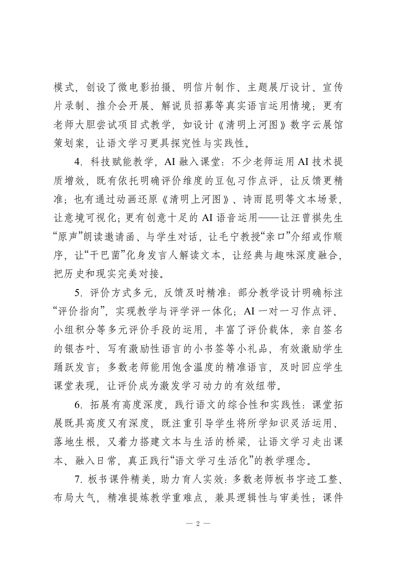 在“千校万师”初中语文赛课活动闭幕式上的发言:一年好景君须记,最是橙黄橘绿时尊敬的各位领导、老师:大家好!非常荣幸能与大家一同参与本次“千校万师”赛课活动,共享这场语文教学的视听盛宴。在此,我谨代表评委组,向为活动精心搭建平台、提供优质服务的市教育局与X中表示诚挚的感谢,向14位作课老师的精彩展示致以崇高的敬意,也向连日来辛勤付出的各位评委老师道一声辛苦了!为时两天半的紧张角逐已圆满落幕,老师们的课堂亮点精彩纷呈,尽显教学匠心与创新活力,具体表现在:1.教者素养过硬,备课扎实高效:各位老师教态大方得体,语言精炼且富有感染力,课堂节奏与时间把控精准到位。备课环节更是尽显用心一一既有老师精心准备《清明上河图》实物画作,让学生直观感受经典魅力;也有教学设计文本图文并茂、封面精致,个别老师还配有同步课件图片;更有老师对课文烂熟于心。这些都展现了老师们的个人素养。2.立足课标导向,培育核心素养:所有教学设计与课堂实践均紧扣新课标、新教材理念,将学生学科核心素养的培育贯穿始终,融入听说读写各项教学活动,着力培养学生的关键能力、必备品格与正确价值观,让“立德树人”掷地有声。3.课堂架构创新,情境真实鲜活:多数老师突破传统教学1