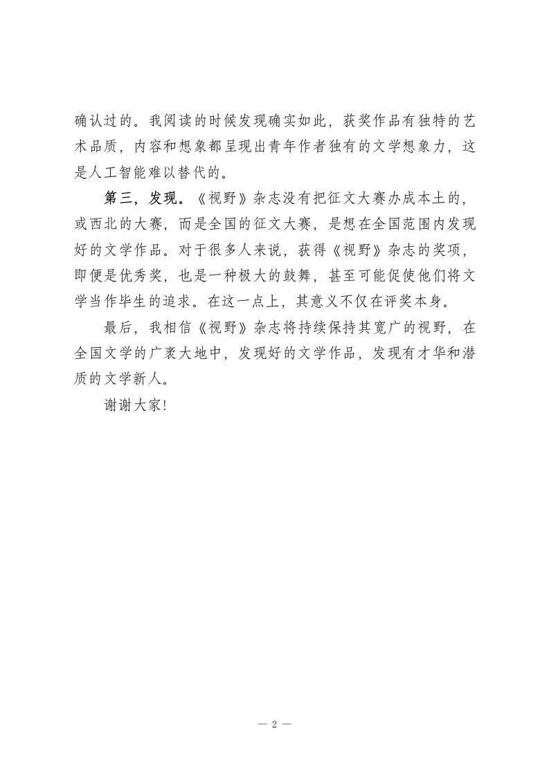 在《视野》杂志第X届征文大赛颁奖典礼上的致辞首先,我要祝贺《视野》杂志第七届全国主题征文大赛成功举办!今天,来到这里非常荣幸,与此同时,也有一种“近乡情更怯”的感触一兰州大学是我的母校。我不禁回想起在母校求学时的一次经历。有一次,与朋友从积石堂出来,她突然指着一位身形颀长的老师,对我说:“你看,包老师!”她的声音很小,但仍然能清晰地感受到激动。事实上,在我攻读博士学位期间,包国宪老师一直是我们心目中的传奇人物。不是因为他身形高大,而是因为他是管理学领域的一流学者,是深受我们学生尊敬与崇仰的老师。关于本届《视野》全国征文大赛,我认为可以用三个关键词来概括其特点:第一,宽广。作为一份兰州大学主办的杂志,《视野》杂志有着宽广的视野。兰州大学虽然地处内陆,却一直有着向外看的目光与宽广视野的追求。这视野是文学的视野,也是文化的视野与学术的视野。此次主题征文大赛面向全国,亦有香港同学参与,体现出一种宽广的姿态。第二,原创。在这样一个生成式A虹盛行的时代,我们人类的原创性显示出前所未有的重要性。此征文大赛获奖作品原创性非常强。之前和《视野》杂志社的编辑人员有过交流,他们说这次大赛的获奖作品,原创性是经由作者本人和大赛组委会1