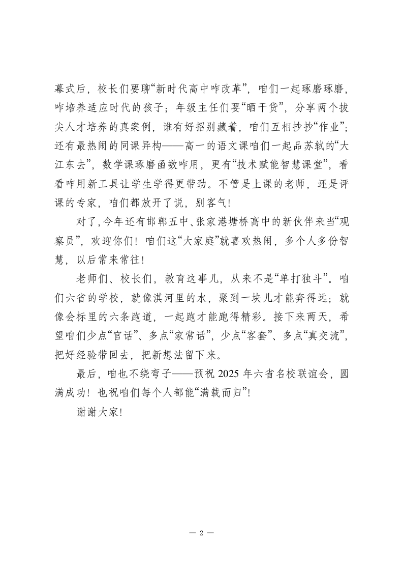 在2025年XX六省名校联谊会开幕式上的讲话各位校长、老师们,老朋友们、新伙伴们:大家上午好!淇水之滨的鹤壁暖意融融一一咱们六省名校的“教育大家庭”,又一次聚到一块儿了!首先,得替咱们联谊会,好好谢谢鹤壁市高中的领导们、老师们、同学们:为了这次相聚,你们忙前忙后搭好了“交流舞台”,这份用心,咱们都记在心里!咱们这“大家庭”的缘分,说起来可有年头了。1988年,晋冀鲁豫四省的学校先“搭了班子”;2004年在梁丰高中一合计,又拉上江苏、浙江,成了今天的“六省联盟”。37年了,从最初的“互通有无”,到后来提的“集群智慧”,再到咱们熟悉的会标一六个“C”像六条跑道,藏着改革、合作、事业、伙伴、文化、创新的“密码”,不就是想告诉大家:咱们六省的学校,没有“大小尊卑”,只有“并肩往前冲”嘛!还记得前几年,长治二中的缑校长和陈院长,俩人选聊聊天就出了两本30万字的书;还有《为什么天才总是成群的来》里说的,一群人围着核心话题“随便聊”,反而能聊出创造力。这就是咱们常说的“集群智慧”一不是谁一个人“唱独角戏”,而是你带一个教学妙招、我提一个育人困惑,凑在一起琢磨,难题就变“活题”,点子就成“好招”。今年咱们聚在鹤壁,聊的也都是“实在事儿”。一会儿的开一1