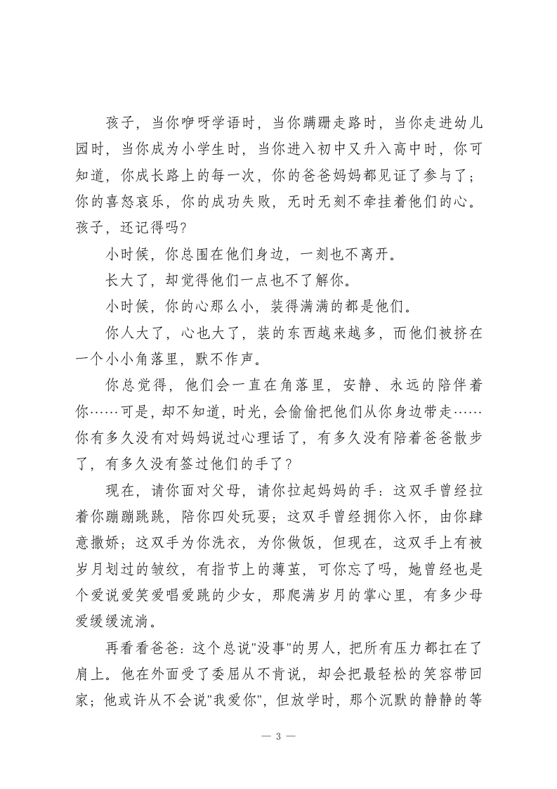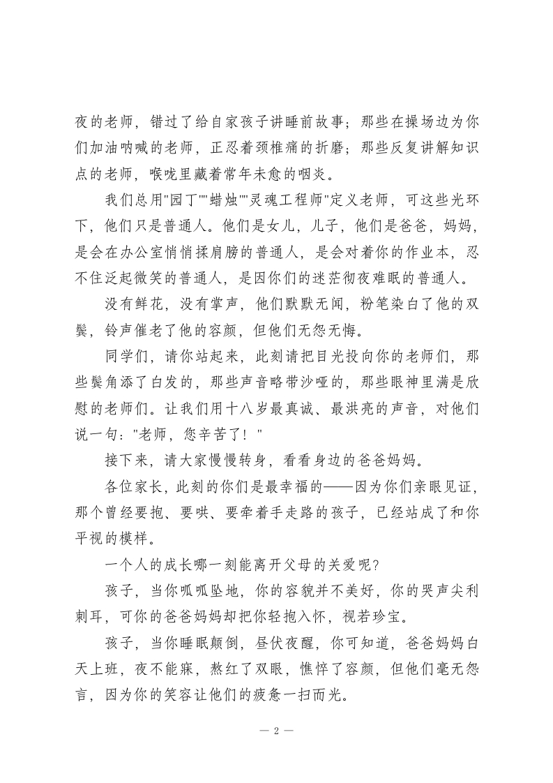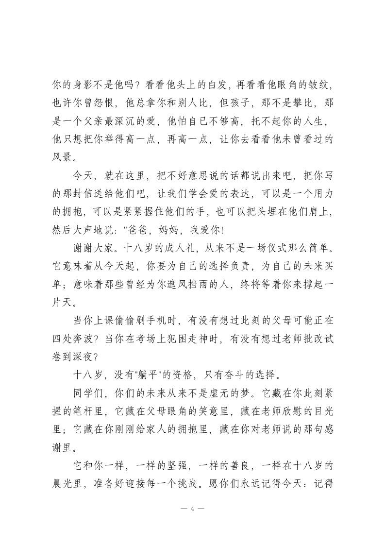 在XX高级中学2026届学子成人仪式上的发言:一样的爱各位老师,各位家长朋友们,亲爱的同学们:大家好!当阳光掠过"成人门"的拱顶落在肩头,我们共同见证着一场盛大的蜕变一一你们,十八岁了。站在少年与成年的交界线,我最想说的一个词是一"一样"。我们谁不渴望,在最需要的时候,有人轻轻拍我们的肩膀?谁不渴望,在拿到成绩单的瞬间有人读懂眼底的失落与欢喜?"日子那么长,我在你身旁,见证你成长让我感到充满力量。陪伴,藏在你们十八年的时光里。从7岁握起铅笔到18岁执笔追梦,4000多个日夜,除了家庭的灯火,照亮你们最多的,是谁呢?对,是教室的灯,是老师办公室的灯。还记得两年前进入开高的那一天吗?还记得军训时那个看起来严厉,却偷偷安慰你的人吗?还记得那次办公室谈话,是谁帮你重扬起希望的风帆吗?是普通平凡的开高老师,是尽心尽责的开高老师,他们陪你们在清晨的薄雾中晨读,陪你们在跑道上挥洒汗水,陪你们在晚自习的寂静里攻克难题。可你们知道吗?那些陪你们到深一1