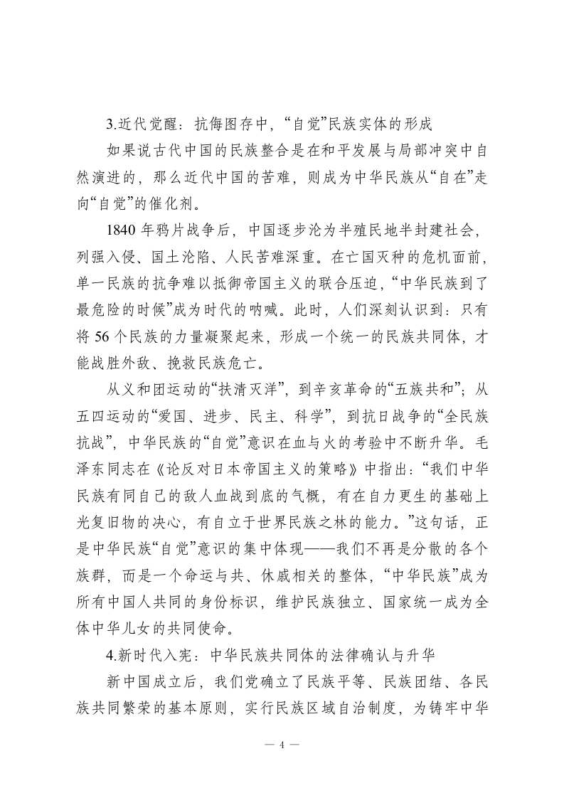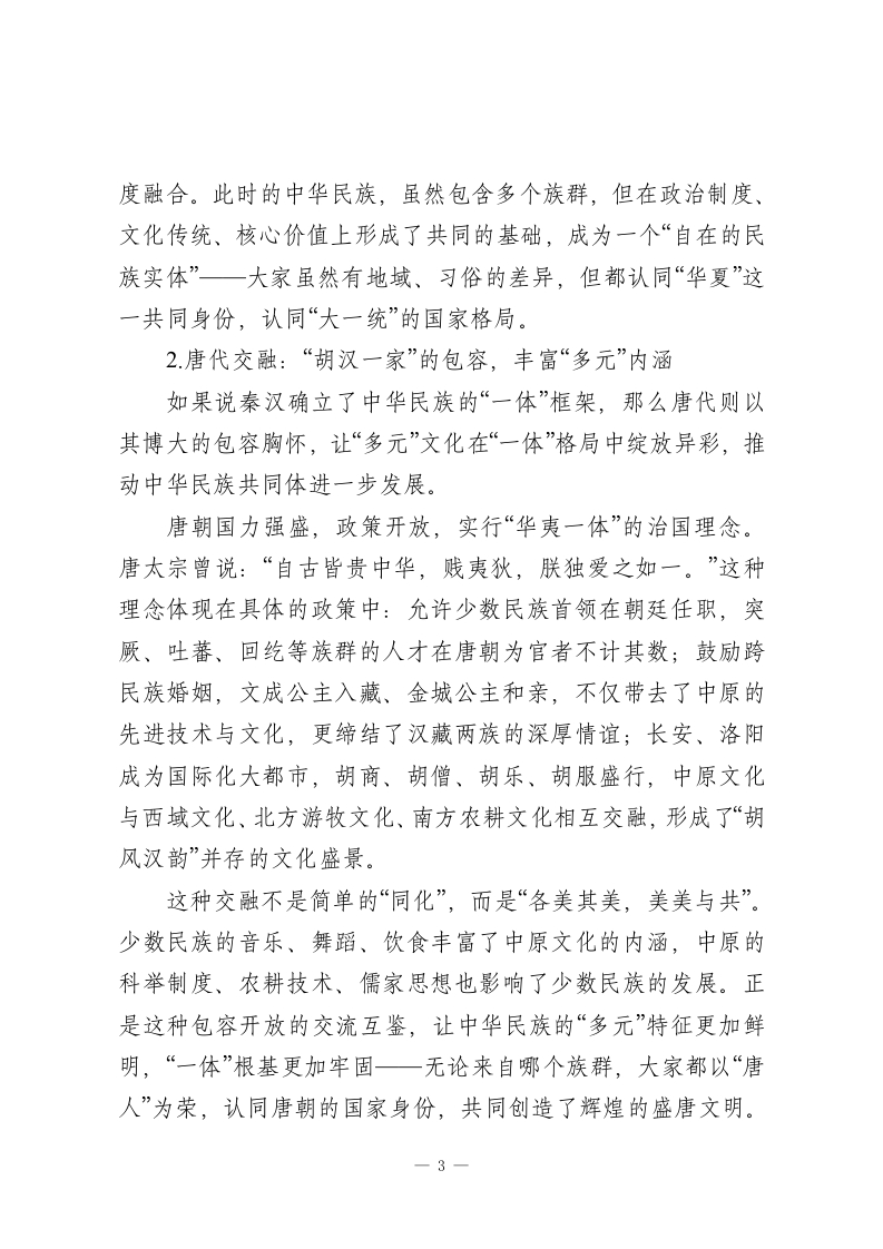 在X市高中上关于铸牢中华民族共同体意识的思政课讲稿铸牢中华民族共同体意识、做民族复兴大任的时代新人尊敬的各位老师,亲爱的同学们:大家上午好!今天,我们站在XX市这片充满活力的土地上,置身于中华民族伟大复兴的关键历史节点,共同探讨一个关乎国家命运、民族未来、青年担当的核心命题一一“铸牢中华民族共同体意识”。作为即将接过时代接力棒的高中生,你们是“强国一代”的中坚力量,是民族复兴的直接参与者和见证者。而铸牢中华民族共同体意识,正是你们成长路上的“必修课”,是我们应对风险挑战、凝聚奋进力量、实现伟大梦想的精神根基。习近平总书记指出:“铸牢中华民族共同体意识是新时代党的民族工作的‘纲’,所有工作要向此聚焦。”这一重要论述,深刻揭示了中华民族共同体意识的核心地位和时代价值。今天这堂思政课,我们将从理论溯源、时代必然、实践路径、青年担当四个维度,系统解读这一重要思想,让大家明白:中华民族共同体意识不是一句抽象的口号,而是贯穿历史、现实与未来的精神纽带,是我们每个人安身立命、成长成才的根本遵循。第一部分理论溯源:中华民族共同体的历史演进与核心内涵要真正理解“铸牢中华民族共同体意识”,首先要回答三个1