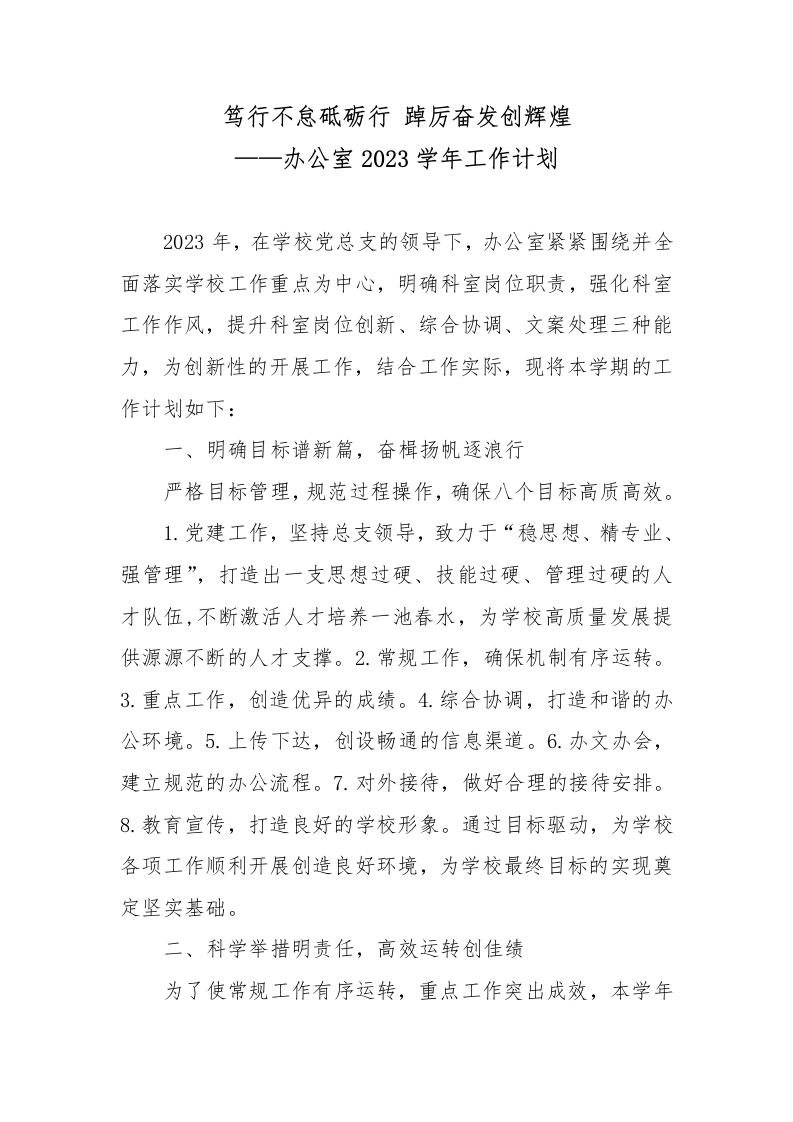 笃行不怠砥砺行踔厉奋发创辉煌-一办公室2023学年工作计划2023年,在学校党总支的领导下,办公室紧紧围绕并全面落实学校工作重点为中心,明确科室岗位职责,强化科室工作作风,提升科室岗位创新、综合协调、文案处理三种能力,为创新性的开展工作,结合工作实际,现将本学期的工作计划如下:一、明确目标谱新篇,奋楫扬帆逐浪行严格目标管理,规范过程操作,确保八个目标高质高效。1.党建工作,坚持总支领导,致力于“稳思想、精专业、强管理”,打造出一支思想过硬、技能过硬、管理过硬的人才队伍,不断激活人才培养一池春水,为学校高质量发展提供源源不断的人才支撑。2.常规工作,确保机制有序运转。3.重点工作,创造优异的成绩。4.综合协调,打造和谐的办公环境。5.上传下达,创设畅通的信息渠道。6.办文办会,建立规范的办公流程。7.对外接待,做好合理的接待安排。8.教育宣传,打造良好的学校形象。通过目标驱动,为学校各项工作顺利开展创造良好环境,为学校最终目标的实现奠定坚实基础。二、科学举措明责任,高效运转创佳绩为了使常规工作有序运转,重点工作突出成效,本学年