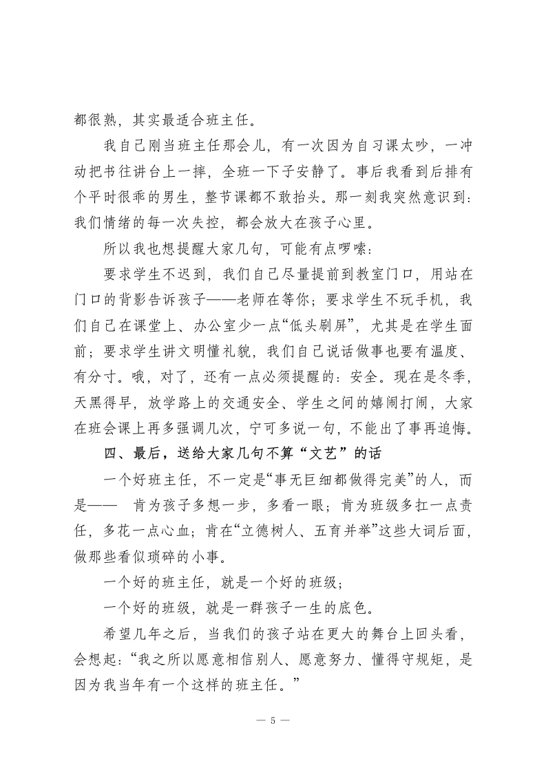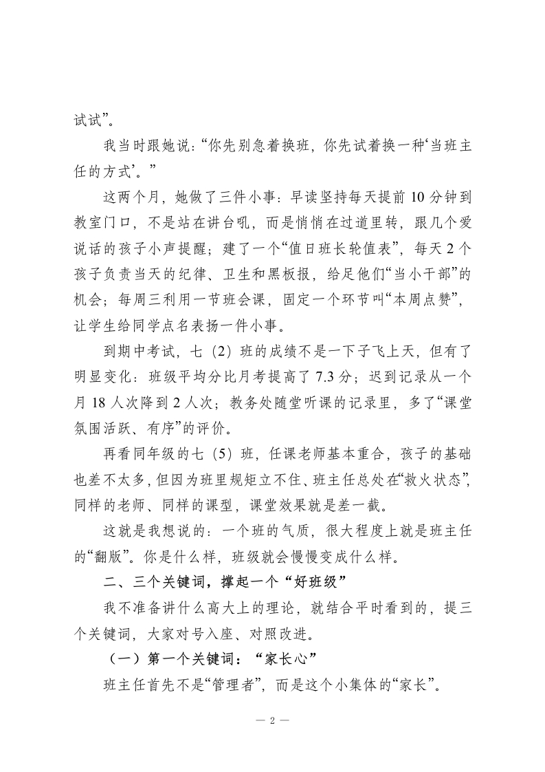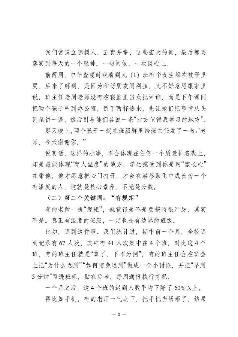 在班主任提升培训会上,德育副校长讲话:在座的每一位班主任,都是一个班级的“天花板”!各位班主任老师:下午好!外面已经有了冬意,这两天早读时,我七点十分走在三楼走廊上,看见很多熟悉的背影:有的老师端着一杯还没喝两口的热水,在门口守着早读;有的老师一只手拿着作业本,一只手还在手机上回家长信息。说实话,每次看到这些场景,我心里都挺不是滋味的一班主任真的是学校里最辛苦的一群人。今天这个班主任提升培训会,我不想给大家再加很多条条框框,只想围绕一句话跟大家聊聊:“一个好的班主任,就是一个好的班级。”这不是一句口号,是我这些年在一个个具体班级里,真真切切看到的结论。一、从两个班说起:一样的学生,不一样的班级先跟大家说两个班的故事,都是我们学校本学期真实的数据。七(2)班,开学第一次月考,全级排名倒数第3,班里一个月迟到记录一共18人次,班务日志上,“课间追跑”“教室乱丢垃圾”这样的记录几乎天天有。班主任小林老师,9月底来找我,说压力太大,想“换个班—1