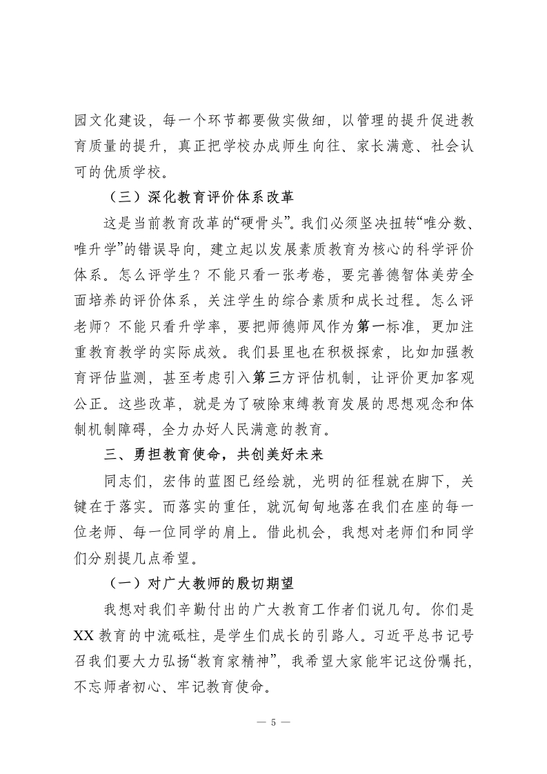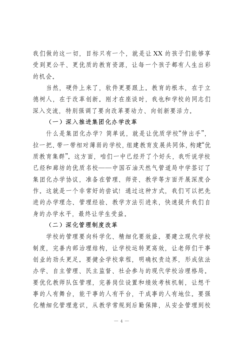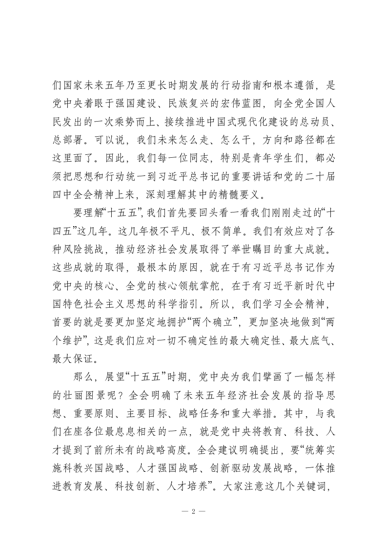 在某某中学学习贯彻党的二十届四中全会精神学习会上的宜讲报告老师们,同学们,同志们:大家下午好!今天,我非常高兴能有机会来到咱们县第一中学,和我们XX最优秀的老师、最朝气的同学们一起,共同学习领会党的二十届四中全会精神。这既是一堂思政课,更是一次心贴心的交流。刚才来的时候,我先和学校的领导班子进行了座谈,详细了解了学校的办学情况。看到一中这所百年名校如今依然生机勃勃、人才辈出,我感到由衷的欣慰和自豪。你们是我们X的骄傲,更是XX未来的希望所在。今天我来到这里,主要目的就是和大家一起,深入学习一次党的最新精神,聊一聊国家的大事,谈一谈我们XX的发展,也说一说对老师们和同学们的期望。一、深刻领会党的二十届四中全会精神实质同志们,我们首先要深刻认识到,刚刚闭幕不久的党的二十届四中全会,究竟是一次什么样的会议?我可以很负责任地告诉大家,这是一次在我国迈上全面建设社会主义现代化国家新征程、向第二个百年奋斗目标进军的关键时刻,召开的一次十分重要的会议。这次全会,最重要的成果就是审议通过了《中共中央关于制定国民经济和社会发展第十五个五年规划的建议》。这个“十五五”规划建议,不是一份普通的文件,它是我1