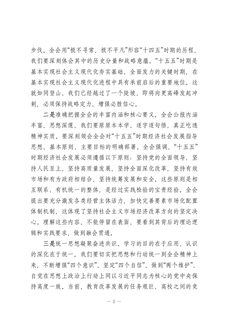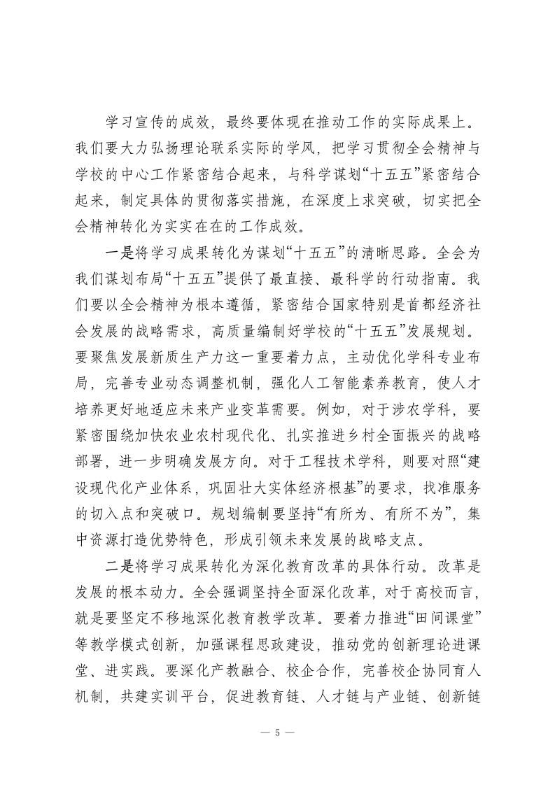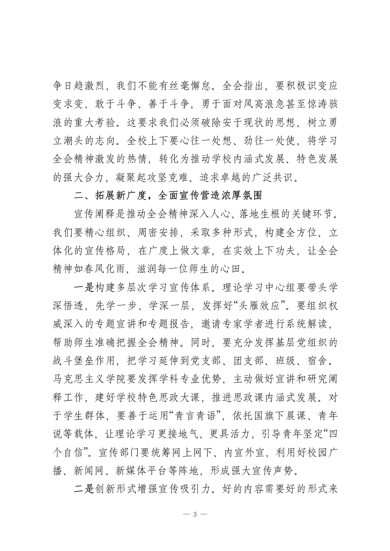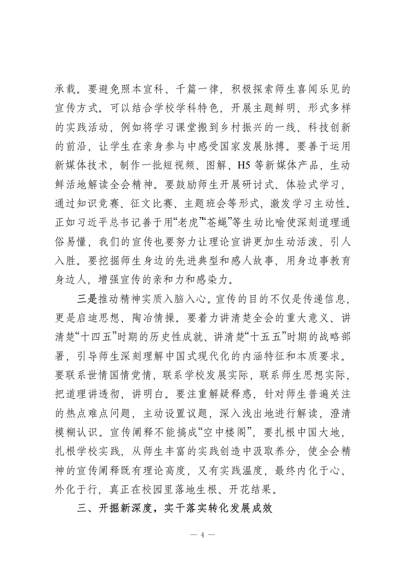 在学校党委理论学习中心组专题学习全会精神会议上的交流发言同志们刚才,我们专题学习了党的二十届四中全会精神。会议全面学习了全会公报,深入交流了心得体会,进一步统一了思想,明确了方向。这次学习会开得很及时、很深入,达到了预期目的。下面,我结合自己的学习思考,就全校深入学习宣传贯彻党的二十届四中全会精神,讲三点意见。一、站上新高度,深刻领会全会核心要义党的二十届四中全会是在全面建设社会主义现代化国家关键时期召开的一次重要会议。全会系统总结了“十四五”时期的辉煌成就,科学谋划了“十五五”时期的宏伟蓝图,提出了一系列新观点、新论断、新部署。我们要深刻认识到,学习好、宣传好、贯彻好全会精神,是当前和今后一个时期的重大政治任务,必须在思想认识上达到新高度,为行动实践打下坚实基础。一是深刻理解全会的重大政治意义和历史意义。这次全会充分肯定了党的二十届三中全会以来中央政治局的工作,高度评价了“十四五”时期我国发展取得的重大成就。面对错综复杂的国际形势和艰巨繁重的国内改革发展稳定任务,以习近平同志为核心的党中央团结带领全党全国各族人民,迎难而上、砥砺前行,推动党和国家事业取得新的重大成就。我国经济实力、科技实力、综合国力跃上新台阶,中国式现代化迈出新的坚实1