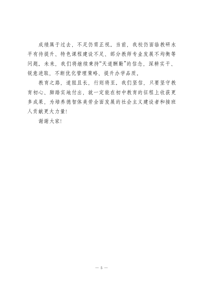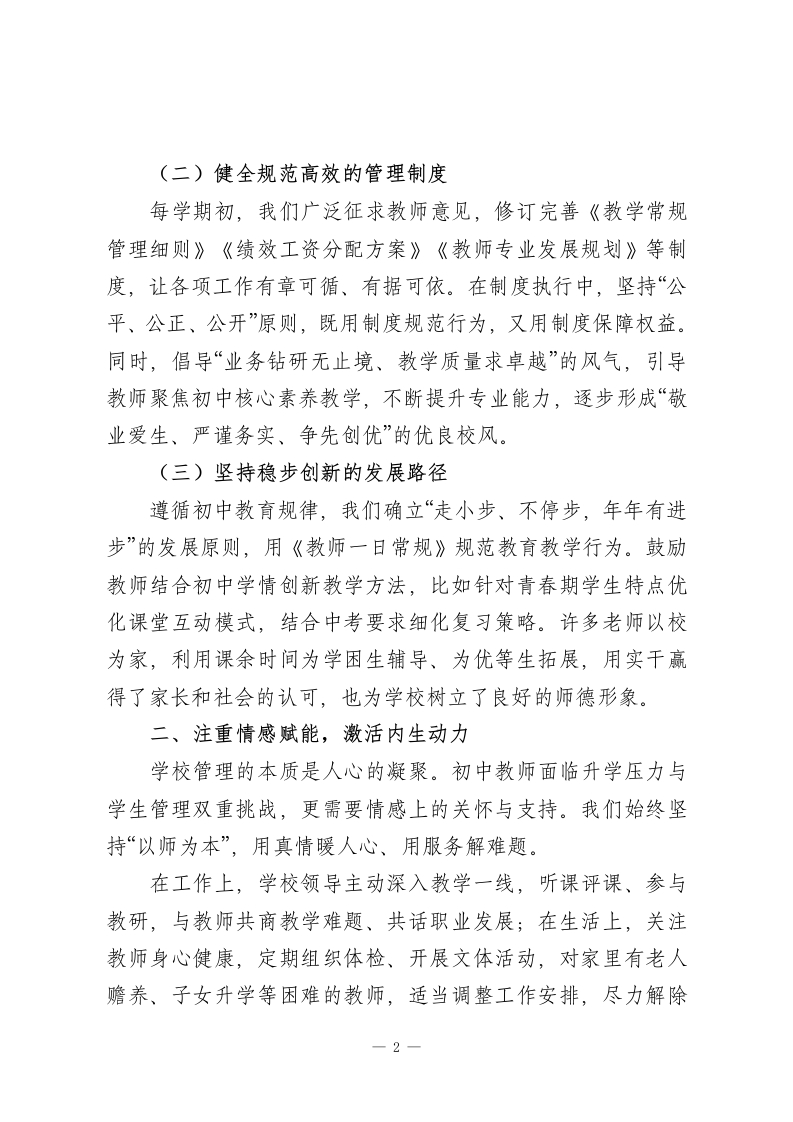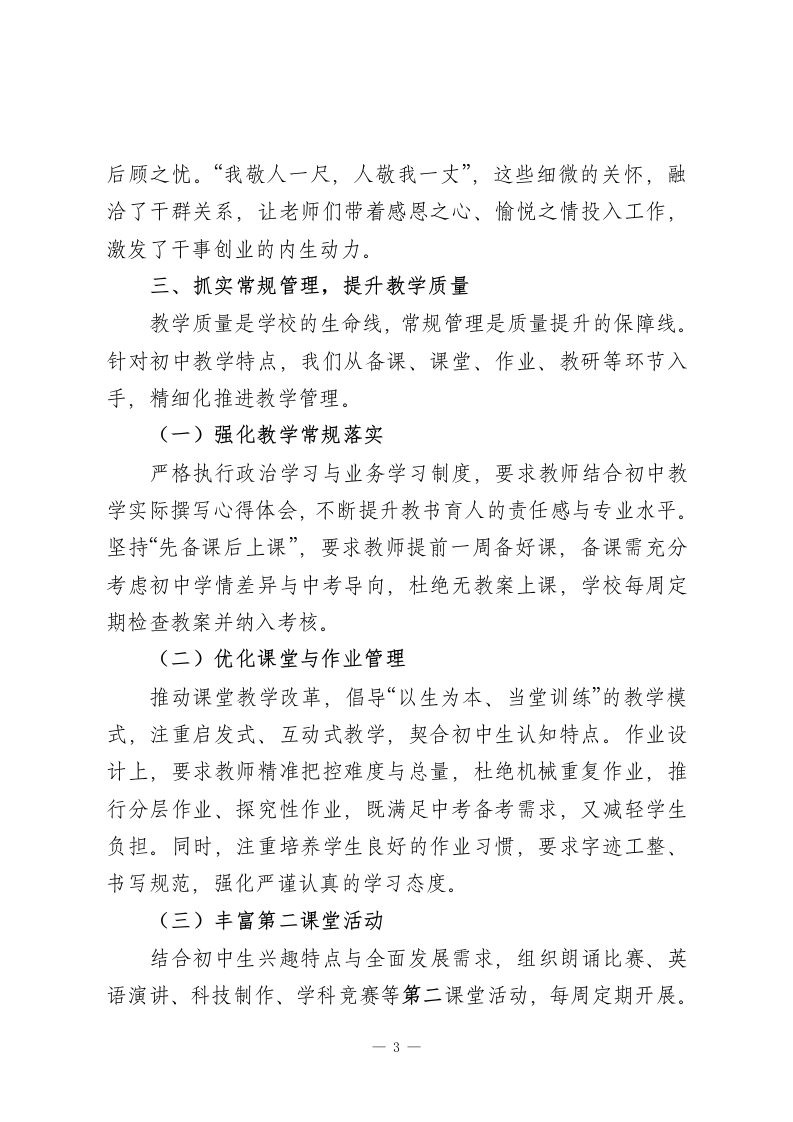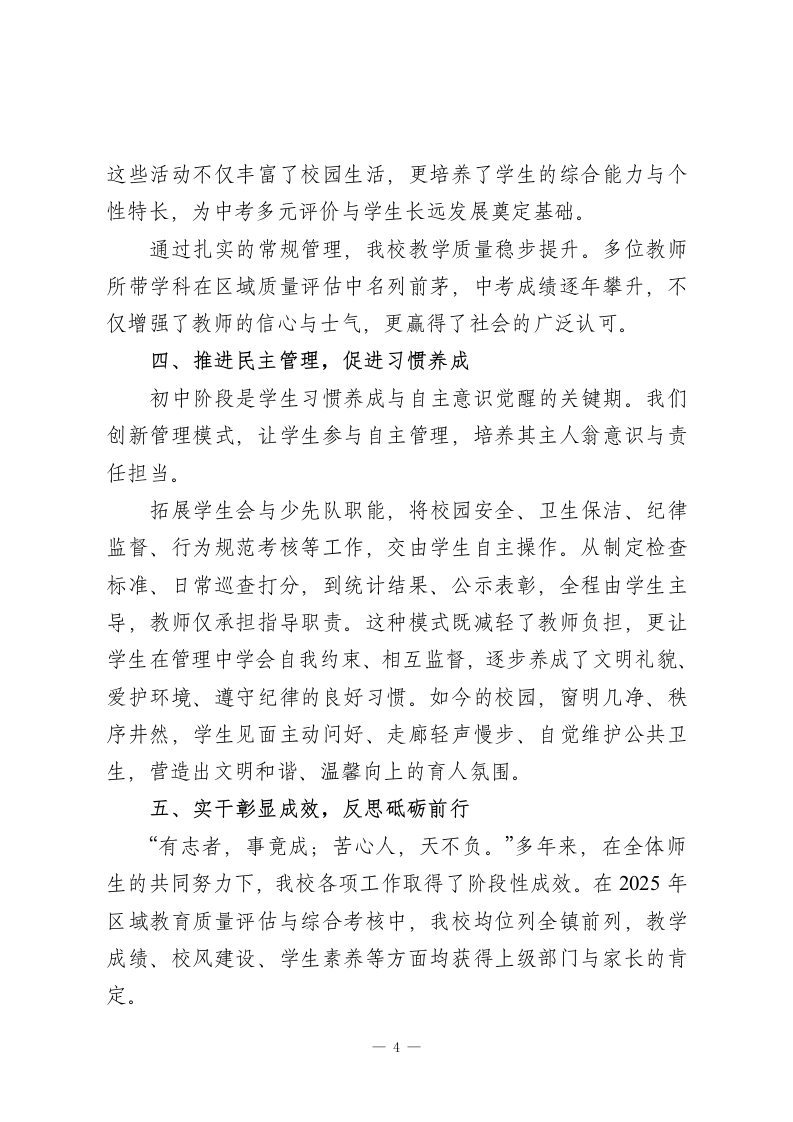 在学校管理经验交流会上初中校长讲话:深耕实干守初心聚力赋能育新苗尊敬的各位领导、各位同仁:大家好!今天,很荣幸能与各位分享我校在初中阶段学校管理中的实践与思考。初中是学生身心成长的“拔节孕穗期”,也是学校教育承上启下的关键阶段。多年来,我校始终秉持“天道酬勤,厚德载物”的办学理念,坚守“踏踏实实工作,真真诚诚做人”的初心,不投机、不取巧,以实干求实效,以匠心育新人。现将我校的管理做法汇报如下,恳请各位批评指正。一、铸强师资团队,夯实校风根基初中教育质量的核心在教师,校风建设的关键在团队。我校始终将师资建设与校风优化作为管理核心,为学校发展筑牢根基。(一)打造团结奋进的教师队伍学校领导班子率先垂范,秉持“吃苦在前、服务在先”的作风,与全体教师同甘共苦、并肩作战。针对初中教学压力大、责任重的特点,我们着力构建“命运与共、相互支撑”的团队氛围,在思想上凝聚共识,在工作中协同发力。无论是备课研讨、学生管理,还是应急处置,老师们都心往一处想、劲往一处使,形成了敬业奉献、团结协作的良好风气。这种凝聚力,成为学校应对各类挑战、推动各项工作的强大动力。1