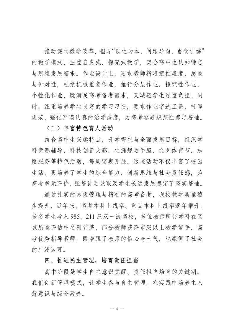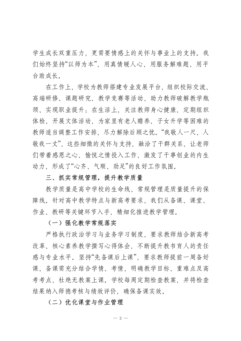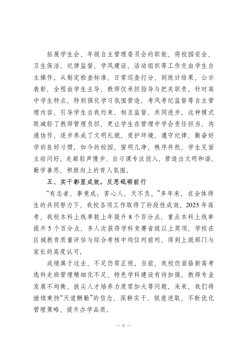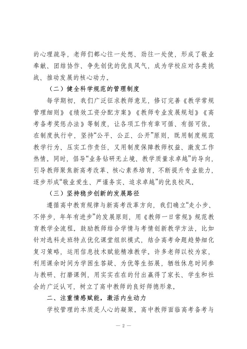 在学校管理经验交流会上高中校长讲话:实干笃行铸品牌匠心育人启新程尊敬的各位领导、各位同仁:大家好!今天,很荣幸能与各位教育同仁分享我校在高中阶段学校管理中的实践与感悟。高中是学生世界观、人生观、价值观定型的关键期,也是实现升学梦想、迈向人生新阶段的冲刺期。多年来,我校始终坚守“天道酬勤,厚德载物”的核心信念,秉持“踏踏实实工作,真真诚诚做人”的行事准则,不投机取巧、不浮躁功利,以实干求实效,以匠心育栋梁。现将我校的管理思路与具体做法汇报如下,恳请各位批评指正。一、铸强师资内核,筑牢办学根基高中教育的质量,核心在教师;学校发展的底气,关键在团队。我校始终将师资建设与校风优化作为管理核心,为学校高质量发展筑牢根基。(一)打造团结奋进的教师队伍学校领导班子率先垂范,秉持“吃苦在前、服务在先”的作风,深入教学一线听课评课、参与教研,与全体教师同甘共苦、并肩作战。针对高中教学升学压力大、学生管理任务重的特点,我们着力构建“目标同向、责任同担、成果共享”的团队氛围,在高考备考、学科建设、学生成长等关键工作中凝聚共识、协同发力。无论是深夜的备课研讨、周未的培优补弱,还是考前1