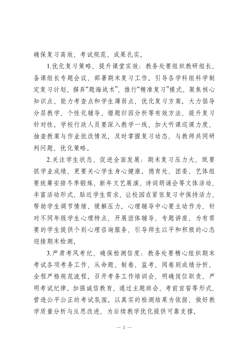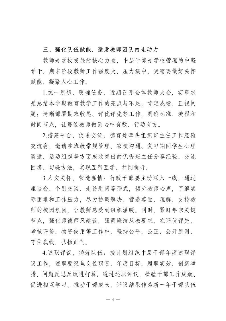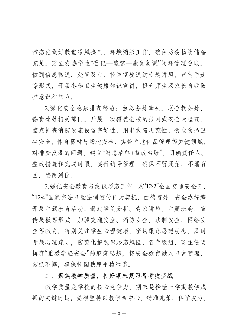 在学校中层行政会上校长讲话:决胜收官启新程凝心聚力谋发展同志们:今天我们召开中层行政干部会议,核心任务是复盘近期工作、研判当前形势,对12月份及岁末年初的重点工作进行再部署、再压实、再推进。12月作为年度收官与新年谋划的关键节点,承载着检验全年成效、夯实发展基础、擘画未来蓝图的多重使命。当前各项工作头绪繁多、任务艰巨、标准严苛,既要全力冲刺期未复习备考,也要系统梳理年度工作,更要精心筹划新一年发展。能否高质量完成本月工作,直接关系到全年目标的圆满实现,更影响着新一年工作的良好开局。希望全体中层干部统一思想、提高站位、凝聚合力,以高度的责任感、强烈的紧迫感和务实的工作作风,全力以赴投身各项工作,确保年末工作收好尾、新年工作起好步。一、坚守安全底线,织密校园全域防护网安全是学校发展的生命线,是不可逾越的底线红线。期末阶段,天气寒冷、师生思想易松懈,安全隐患风险有所增加,必须时刻绷紧安全这根弦,以“时时放心不下”的责任感,筑牢“万无一失”的安全防线。1.抓实冬季传染病防控:当前冬季流感、呼吸道疾病进入高发期,德育处、总务处、校医室要协同联动、各负其责。严格落实晨午检制度,加强日常抽检与健康状况追踪;督促各班-1