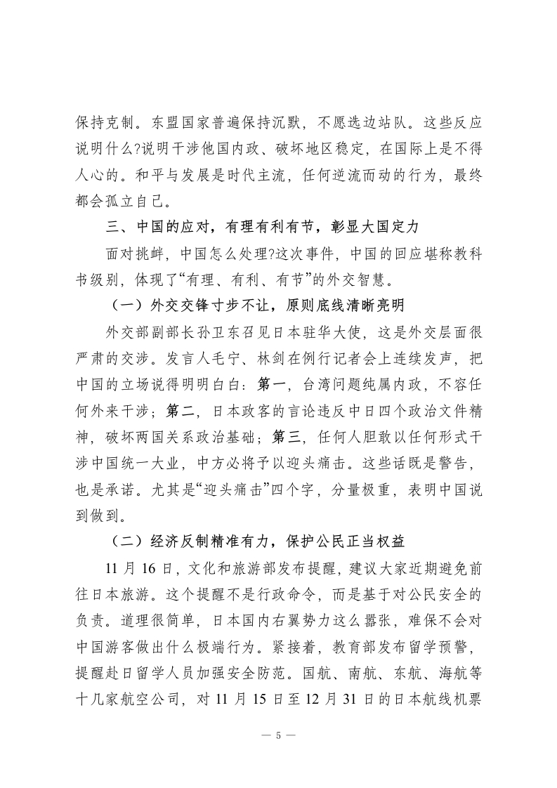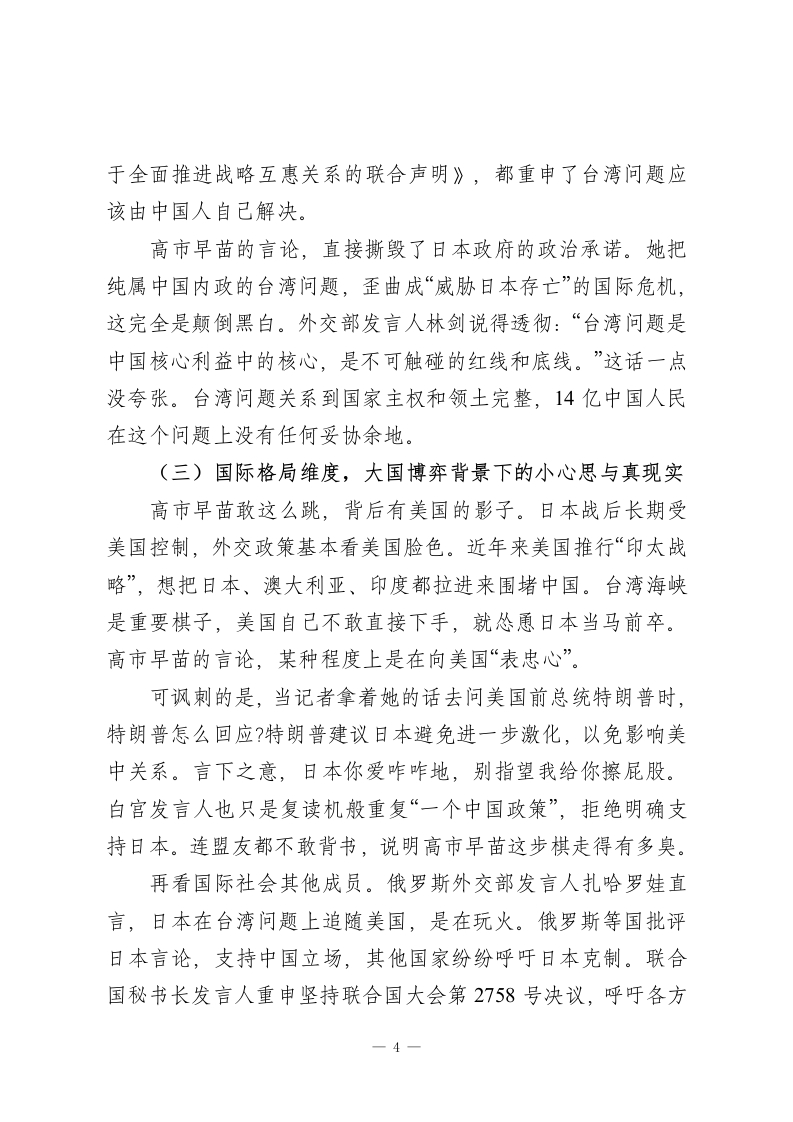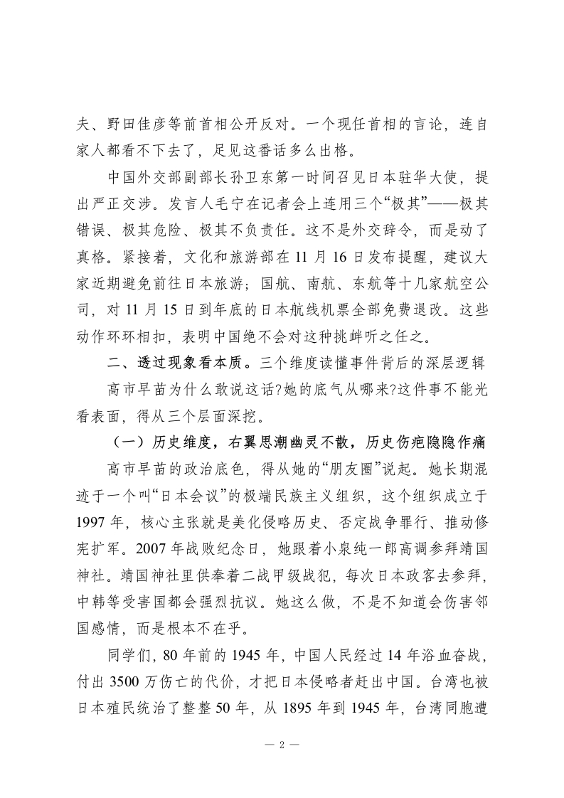 中学思政课讲稿:从近期日本首相涉台错误言论看国家主权与和平发展同学们好。今天这堂思政课,和大家聊一件最近闹得沸沸扬扬的事。11月初,刚上台没多久的日本首相高市早苗,在国会答辩时突然大放厥词,说什么“台湾有事就是日本有事”,还要派自卫队武力介入台海。这番言论一出,立刻在国际上炸开了锅,中国政府当天就提出了严正抗议。可能有些同学会觉得,这离我们太远了,关我们什么事?其实不然,这件事背后牵扯到的国家主权、历史教训、和平发展,恰恰与每一个中国人的命运息息相关。今天就把这件事掰开揉碎,说清楚讲明白。一、事件来龙去脉,一句不负责任的言论掀起多大风浪时间回到2025年11月7日。那天,高市早苗在日本众议院接受质询,有议员问她对台海局势怎么看。正常情况下,任何一国领导人都该谨慎发言,毕竟台湾问题是中国内政,国际上有明确共识。可高市早苗偏不,她当场撂下狠话:如果“台湾有事”伴随对方使用武力,可能构成安保法中日本能行使集体自卫权的“存亡危机事态”。这话翻译成大白话就是一一只要台海发生冲突,日本就可能派兵介入。同学们,这句话的分量有多重?这是近年来日本首相罕见地将台湾问题与日本军事介入直接挂钩。往前看,连以强硬著称的安倍晋三当年也只是含糊其辞,没敢把话说得这么死;往周围看,韩国媒体批评这是右翼言论;往国内看,包括鸠山由纪1