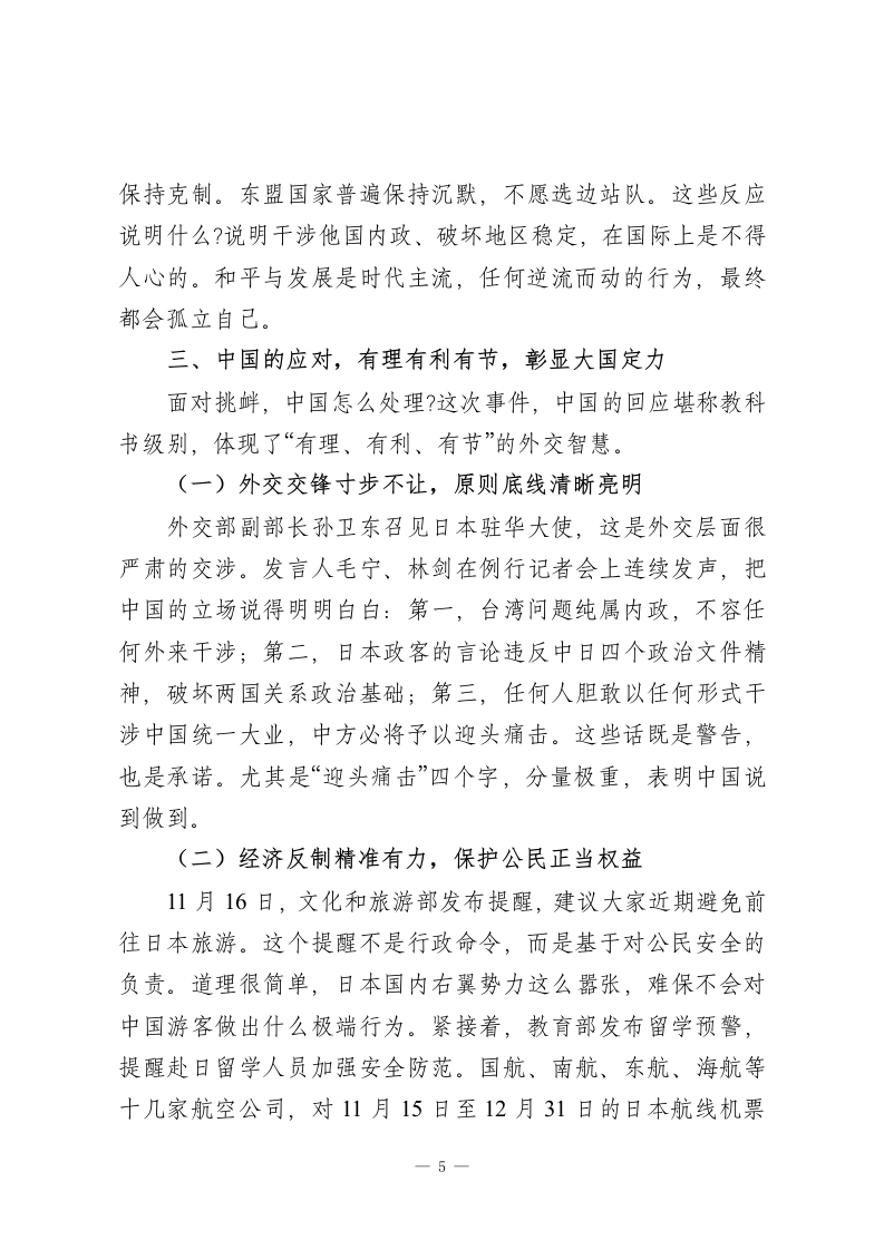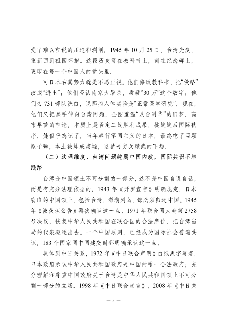 中学思政课讲稿:从近期日本首相涉台错误言论看国家主权与和平发展同学们好。今天这堂思政课,和大家聊一件最近闹得沸沸扬扬的事。11月初,刚上台没多久的日本首相高市早苗,在国会答辩时突然大放厥词,说什么“台湾有事就是日本有事”,还要派自卫队武力介入台海。这番言论一出,立刻在国际上炸开了锅,中国政府当天就提出了严正抗议。可能有些同学会觉得,这离我们太远了,关我们什么事?其实不然,这件事背后牵扯到的国家主权、历史教训、和平发展,恰恰与每一个中国人的命运息息相关。今天就把这件事掰开揉碎,说清楚讲明白。一、事件来龙去脉,一句不负责任的言论掀起多大风浪时间回到2025年11月7日。那天,高市早苗在日本众议院接受质询,有议员问她对台海局势怎么看。正常情况下,任何一国领导人都该谨慎发言,毕竟台湾问题是中国内政,国际上有明确共识。可高市早苗偏不,她当场撂下狠话:如果“台湾有事”伴随对方使用武力,可能构成安保法中日本能行使集体自卫权的“存亡危机事态”。这话翻译成大白话就是一一只要台海发生冲突,日本就可能派兵介入。同学们,这句话的分量有多重?这是近年来日本首相罕见地将台湾问题与日本军事介入直接挂钩。往前看,连以强硬著称的安倍晋三当年也只是含糊其辞,没敢把话说得这么死;往周围看,韩国媒体批评这是右翼言论;往国内看,包括鸠山由纪1
