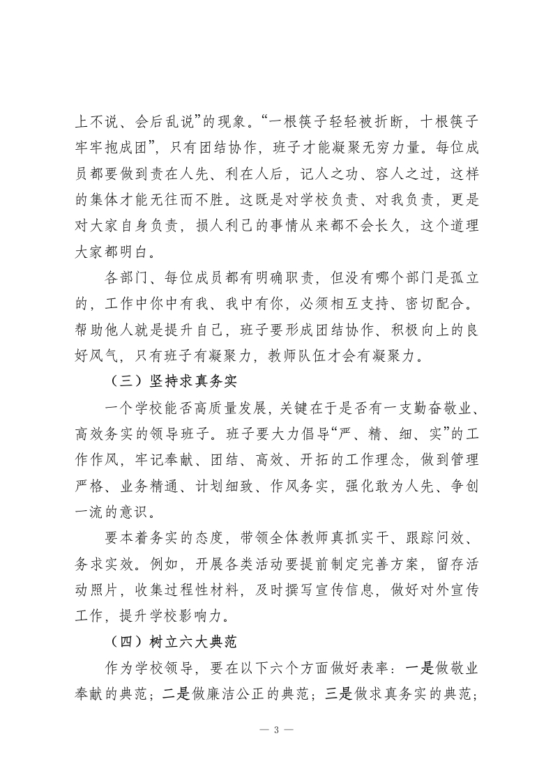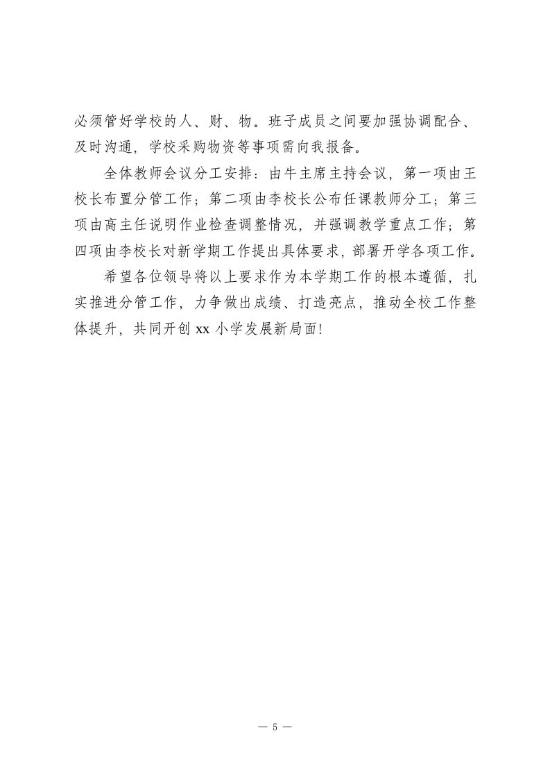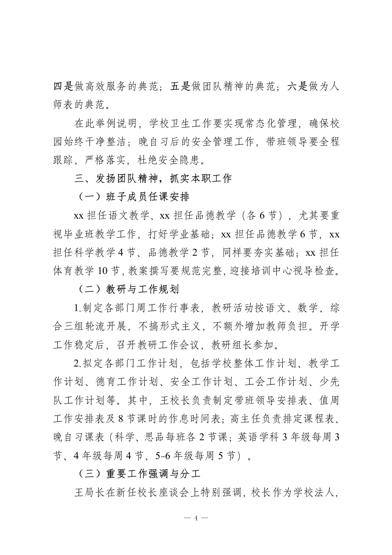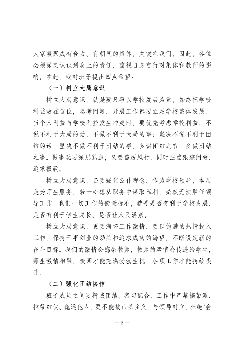 总校长在XX小学领导班子会议上的讲话:定方向、提要求、谋发展同志们,老师们:我们怀揣着新的憧憬与期盼,迎来了12月这个关键的学期阶段。相信各位领导在接下来的工作中,必将以更充沛的精力、更昂扬的斗志投身各项事务。说实话,组织上安排我担任xx小学校长,我深感荣幸,时隔多年再次回到家乡任教,衷心希望大家能够接纳我、支持我的工作。一、近期人事调整情况说明11月初,Xx政府对区域内教育系统人事进行了力度空前的调整,涉及辞职免职10人、交流任职10人、新拟任10人。xx政府党组成员于11月5日召开专题会议,通过投票表决确定了以上20位校长的任职安排。此次人事调整遵循明确标准:1.免职校长:主要参考20XX一20XX年综合分排名、任职期间成绩变化、年龄结构及是否发生安全事故等因素;2.提拔校长:依据20XX一20XX年教学成绩综合分排名,中学取前三名,小学取前五名;3.交流校长:原交流原则为6年,现调整为9年。二、对班子建设的四点希望常言道:“火车跑得快,全靠车头带。”xx小学的发展,核心在于我们这个领导班子。教师队伍年龄结构不一,部分教师年龄偏大,近年退休人员增多,每位教师都有自身特点,要将1