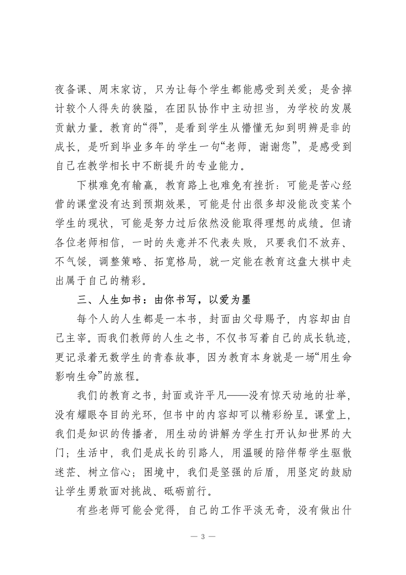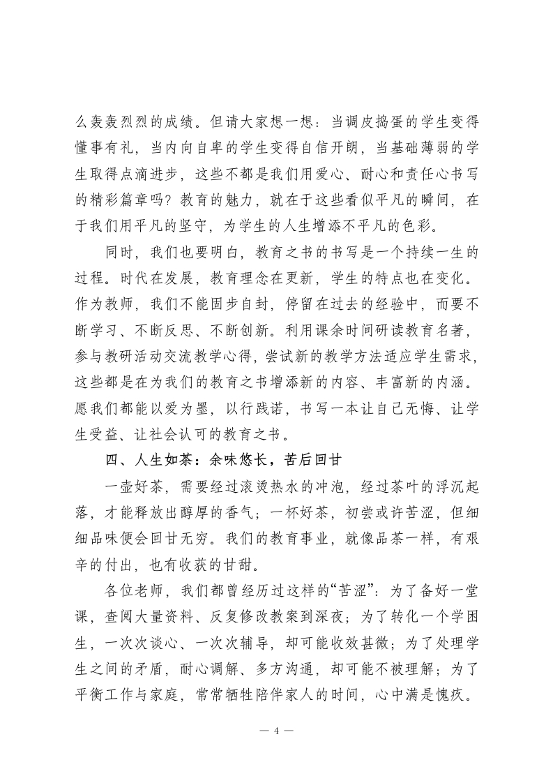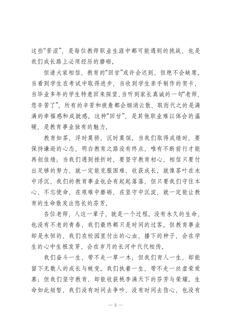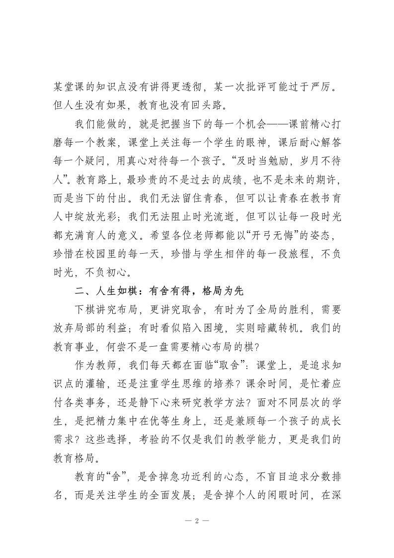 走心!!校长在教师会议上讲话:人生四境,教育四度一一以箭为锋、以棋为谋、以书为墨、以茶为魂各位老师:大家下午好!今天,借着全体教师大会的契机,想和大家聊一聊人生,也聊一聊我们共同坚守的教育事业。人这一辈子,说到底就是一个不断前行、不断沉淀的过程。我们在校园里陪伴一届又一届学生成长,也在日复一日的耕耘中书写自己的人生。今天,我想用四个比喻,四个关键词,和大家一起感悟人生真谛,践行教育初心。一、人生如箭:开弓无悔,不负当下时间就像离弦的箭,一旦射出便无法回头,正如我们的教育时光,每一分每一秒都承载着育人使命,容不得半点虚度。在座的每位老师,或许都有过这样的感受:清晨踏入校园时,还想着今天要完成的备课、要找的学生谈话;夜幕降临离开时,才发现一天的时光早已在课堂讲解、作业本批注、办公室答疑中悄然流逝。教育的特殊性就在于,我们面对的是一个个鲜活的生命,每一次沟通、每一次引导,都可能成为影响学生一生的关键瞬间。就像箭一旦射出便无法收回,我们的教育行为也没有重来的机会。有些老师可能会遗憾:某个学生当时没有多耐心一点,1