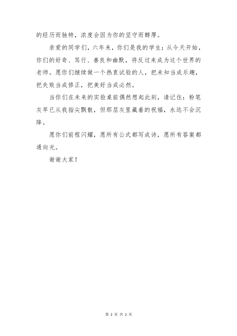 2025届毕业典礼教师讲话一剩下的话留给盛夏亲爱的孩子们,今天站在这里,我不是来总结六年成绩,也不是来嘱咐作业清单。我想用一节“课堂之外”的微型实验,为你们展示成长真正的配方。请把想象调到高清模式,跟我做一次“小小化学反应”。第一种试剂:好奇。把它滴进生活,每一滴都会冒出气泡。气泡里是藏在草尖的几何,是蜻蜓翅膀的物理,是榴花颜色的文学。好奇让世界自动发光,也让枯燥自动褪色。第二种试剂:笃行。好奇如果只写在草稿纸,它会很快蒸发;只有加上一勺笃行,才会沉淀出结晶。那结晶叫“完成一件事”,不论是背下一首长诗,还是跑完一公里长跑。第三种试剂:善良。这是最温柔、却也最具催化力的元素。把它轻轻摇匀,任何嘲笑都会沉底,任何鼓励都会上浮。它能把误解还原成理解,把争吵转化为合作,把陌生蒸馏为信任。第四种试剂:幽默。生活偶尔会过度加热,让情绪沸腾。此时请撒一点幽默,它像冰晶,能迅速降低“尴尬”和“沮丧”的沸点,让你重新看见问题背后隐藏的彩蛋。把这四种试剂混合,你会得到一种颜色奇特的溶液一一它叫“人生”。颜色会因为你的选择而改变,气味会因为你第1页共2页