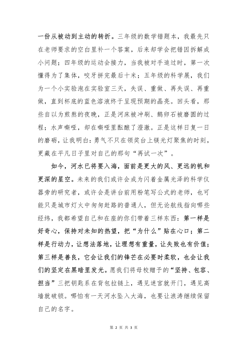 2025届毕业典礼学生讲话剩下的话留给盛夏尊敬的校长、亲爱的老师,慈爱的爸爸妈妈,以及和我一起长大的同学们:大家早上好!站在学校操场上,阳光斜斜洒在胸前的红领巾,微风吹起三月刚剪过的梧桐叶,六年来的记忆就像一条忽然翻起浪花的河,在脑海里轰然作响。我想把这条河今天完整地呈现给大家,让它从源头的感谢,流过河心的成长,最终抵达河口的梦想,再一次注满我们年轻的行囊。河水的第一道涌流,叫“感谢”。如果没有老师一步步牵引,我们不可能把拼音读准,把乘法背熟,更不可能在一次又一次的“再来一遍”中,明白坚持的含义。记得二年级的一次朗诵比赛,我因为紧张在台上结结巴巴,眼泪几乎要流下来,但班主任却用温柔的眼神对我竖起大拇指,那一刻我明白:成功不是唯一答案,勇气才是真正分数。感谢父母,你们的叮咛像清晨第一束光,照得路面发亮:你们的等待像夜晚最后一盏灯,让归家的脚步始终不晃。更要感谢并肩的同学,课间的一块橡皮、一句调侃、一声“加油”,在失落时为我造出一片小小晴空。所有滴滴点点的善意交汇成河,推着我们驶离稚嫩的岸。当河水来到河心,它载着“成长”的轰鸣奔流一一那是第1页共3页