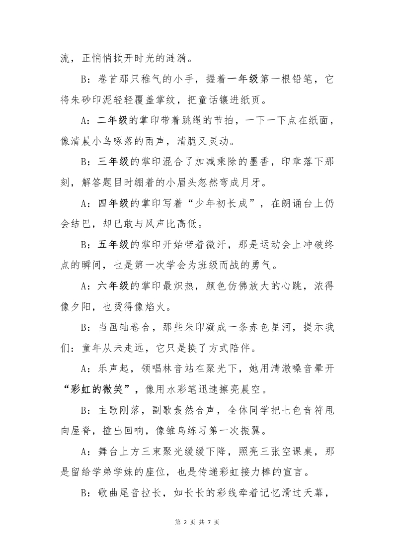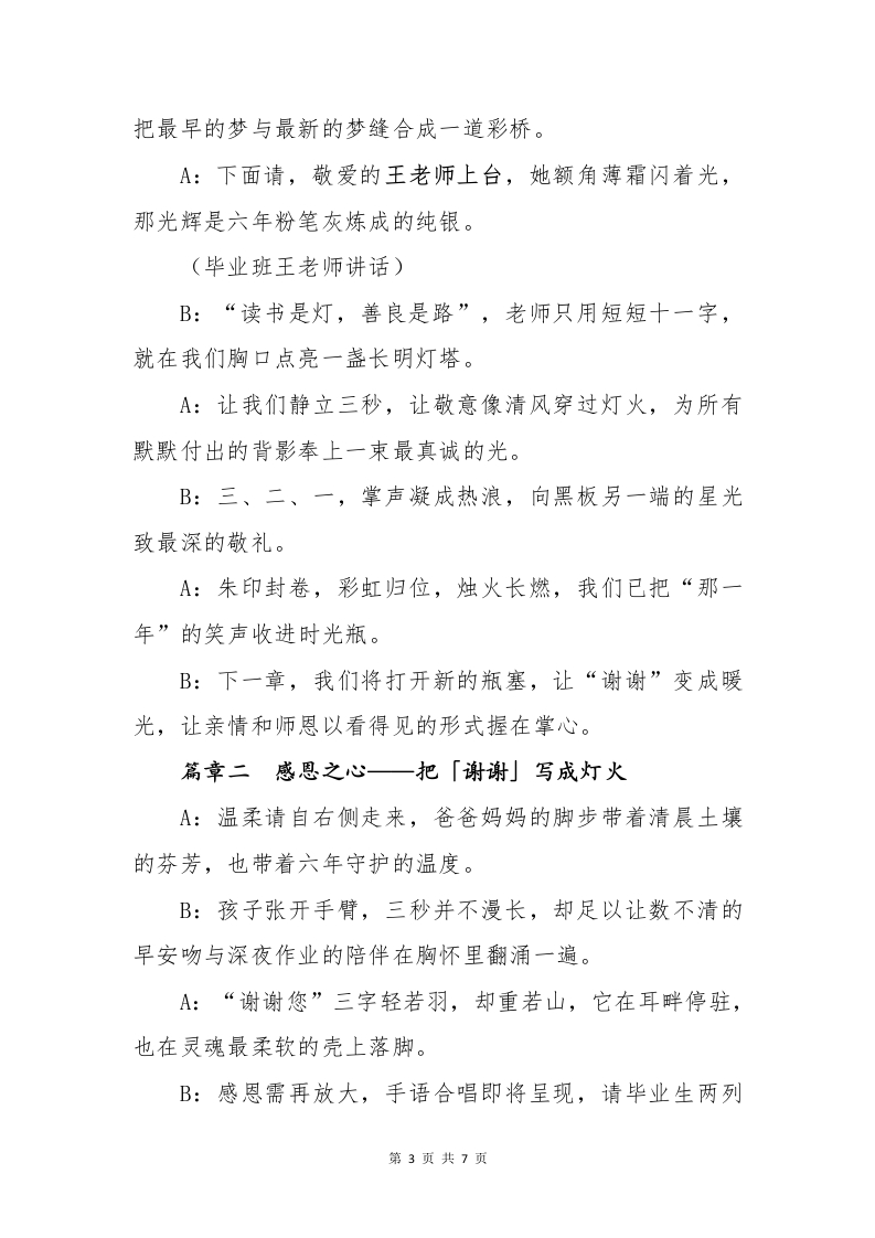 2025届毕业典礼主持词一剩下的话留给盛夏A:旭日染窗,金辉作序,梧桐影里启童年回声。B:清风携韵,翠叶传香,走廊深处寄六载芳踪。A:敬师长,谢父母,欢聚清晨共襄盛典。B:聆朝光,调心率,同赴别离且迎新程。A:八旗猎猎,指向来路;B:万瓦晶晶,映出前程。B六年前,我们怀揣稚气与好奇踏进校园,像向阳的蒲公英,微小却悄悄蓄着风;A六年后,我们肩头有了责任,眼底盛着星河,像待放的栀子,雪白而热烈。B八面班旗已昂首在舞台中央,它们像八支彩色罗盘,指向我们走来的方向,也指向未来航道。A请让掌声化作启航汽笛,在歌曲里点亮序章一一全体同学,请以最饱满的声音唱响《同一首歌》!A:歌止而心鸣,旗定而风劲,彩罗盘标注成长坐标;B:今宣此令一一二O二五届小学毕业典礼《剩下的话留给盛夏》启航!愿星光作引,愿梦想乘风。篇章一童年留声一把「那一年」收进笑声A:请把目光交给舞台右侧,一幅四米长卷像初醒的河第1页共7页