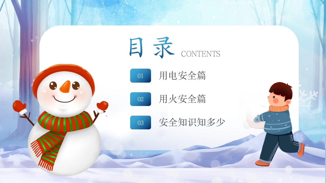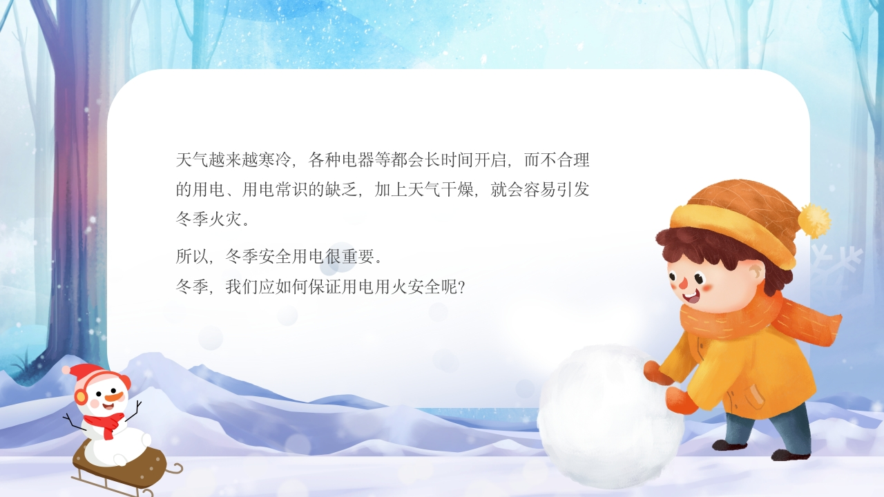 【通用】【安全教育】主题班会《冬季用电防火安全指南》tangqi8817小时前发布关注私信57.19MB25页04911 第1页 / 共25页 第2页 / 共25页 第3页 / 共25页 第4页 / 共25页 第5页 / 共25页 试读已结束,还剩20页,您可下载完整版后进行离线阅读 【通用】【安全教育】主题班会《冬季用电防火安全指南》此内容为付费资源,请付费后查看¥9.9¥29.9VIP会员免费立即购买您当前未登录!建议登陆后购买,可保存购买订单付费资源© 版权声明本站是一个信息分享及获取的平台,不确保部分用户上传资料的来源及知识产权归属,资料由老师投稿,公开渠道整理,网友上传,如果侵犯到您的权益,请联系客服删除THE ENDPPT课件 文本预览 Fire prevention with electricity in winter冬季用电防火安全指南天气越来越宋冷,各种电器等都会长时间开启,而不合理的用电、用电常识的缺乏,加上天气干燥就会容易引发冬季火灾。汇报人:时间:2025 查看更多 收起部分 喜欢就支持一下吧点赞11 分享QQ空间微博QQ好友海报分享复制链接收藏