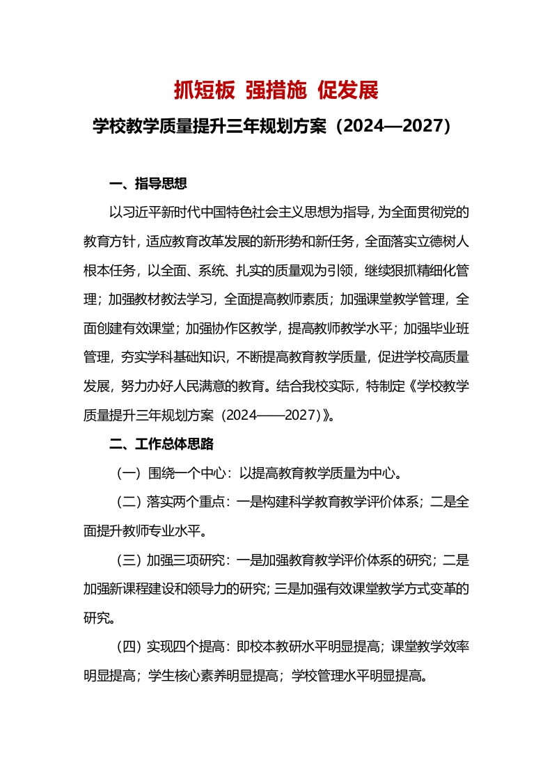抓短板强措施促发展学校教学质量提升三年规划方案(2024一2027)一、指导思想以习近平新时代中国特色社会主义思想为指导,为全面贯彻党的教育方针,适应教育改革发展的新形势和新任务,全面落实立德树人根本任务,以全面、系统、扎实的质量观为引领,继续很抓精细化管理;加强教材教法学习,全面提高教师素质;加强课堂教学管理,全面创建有效课堂;加强协作区教学,提高教师教学水平;加强毕业班管理,夯实学科基础知识,不断提高教育教学质量,促进学校高质量发展,努力办好人民满意的教育。结合我校实际,特制定《学校教学质量提升三年规划方案(2024—2027)》。二、工作总体思路(一)围绕一个中心:以提高教育教学质量为中心。(二)落实两个重点:一是构建科学教育教学评价体系;二是全面提升教师专业水平。(三)加强三项研究:一是加强教育教学评价体系的研究;二是加强新课程建设和领导力的研究:三是加强有效课堂教学方式变革的研究。(四)实现四个提高:即校本教研水平明显提高;课堂教学效率明显提高;学生核心素养明显提高;学校管理水平明显提高。
