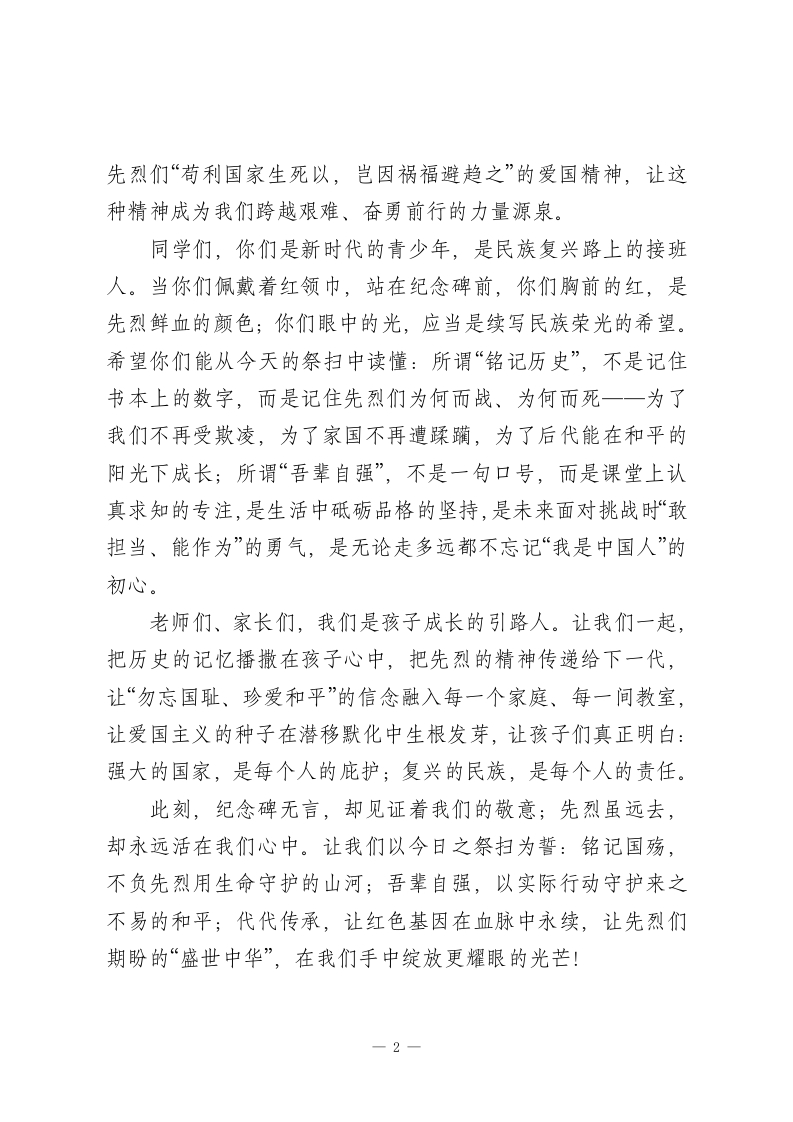 “铭记国殇承先烈,吾辈自强护和平”2025年公祭日陵园祭扫校长发言稿尊敬的各位同仁、亲爱的同学们,各位家长朋友们:今天,是12月13日一一南京大屠杀死难者国家公祭日。当防空警报的鸣响划破长空,当我们肃立在XX市烈士陵园的烈士纪念碑前,苍松凝翠,丰碑矗立,每一缕风都仿佛在诉说那段刻入民族骨髓的伤痛记忆,每一寸土地都承载着先烈们用生命写就的壮烈史诗。88年前的今天,南京城破,山河泣血。30万手无寸铁的同胞倒在侵略者的屠刀之下,家园化为焦土,哀嚎响彻街巷一一那是中华民族近代史上最黑暗、最沉重的一页,是我们永远不能忘却的国殇。但黑暗之中,总有星光:无数革命先烈挺身而出,他们或是稚气未脱却手握钢枪的战士,或是教书育人却毅然投身抗争的志士,或是普通百姓却愿为家国赴死的勇者。他们没有退缩,没有屈服,用血肉之躯挡住敌人的炮火,用生命守护民族的尊严,在绝望中点燃了希望的火种,用抗争诠释了“天下兴亡,匹夫有责”的担当,用牺牲铸就了“为有牺牲多壮志,敢教日月换新天”的精神丰碑。今天,我们怀着无比沉痛与崇敬的心情来到这里,不是为了延续仇恨,而是为了铭记一铭记30万遇难同胞的苦难,让历史的伤痕时刻警醒我们:和平从不是凭空而来,它是先烈用鲜血换来的珍宝;不是为了沉溺悲痛,而是为了传承一一传承—1