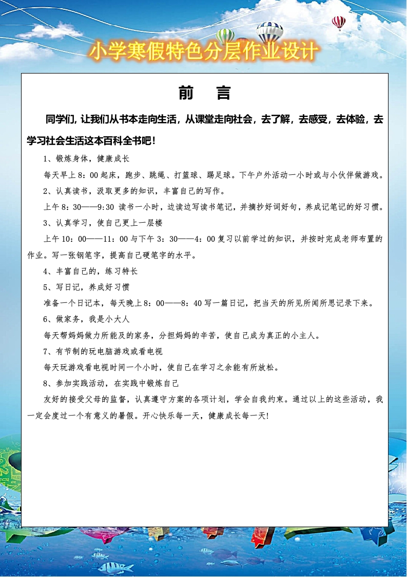 小学寒假特色分层作业设计前言同学们,让我们从书本走向生活,从课堂走向社会,去了解,去感爱,去体验,去学习社会生活这本百科全书吧!1、锻炼身体,健康成长每天早上8:00起床,跑步、跳绳、打篮球、踢足球。下午户外活动一小时或与小伙伴做游戏。2、认真读书,汲取更多的知识,丰富自己的写作。上午8:30一一9:30读书一小时,边读边写读书笔记,并摘抄好词好句,养成记笔记的好习惯。3、认真学习,使自己更上一层楼上午10:00一一11:00与下午3:30一一4:00复习以前学过的知识,并按时完成老师布置的作业。写一张钢笔字,提高自己硬笔字的水平。4、丰富自己的,练习特长5、写日记,养成好习惯准备一个日记本,每天晚上8:00一一8:40写一篇日记,把当天的所见所闻所思记录下来。6、做家务,我是小大人每天帮妈妈做力所能及的家务,分担妈妈的辛苦,使自己成为真正的小主人。7、有节制的玩电脑游戏或看电视每天玩游戏看电视时间一个小时,使自己在学习之余能有所放松。8、参加实践活动,在实践中锻炼自己友好的接受父母的监督,认真遵守方案的各项计划,学会自我约束。通过以上的这些活动,我一定会度过一个有意义的暑假。开心快乐每一天,健康成长每一天!