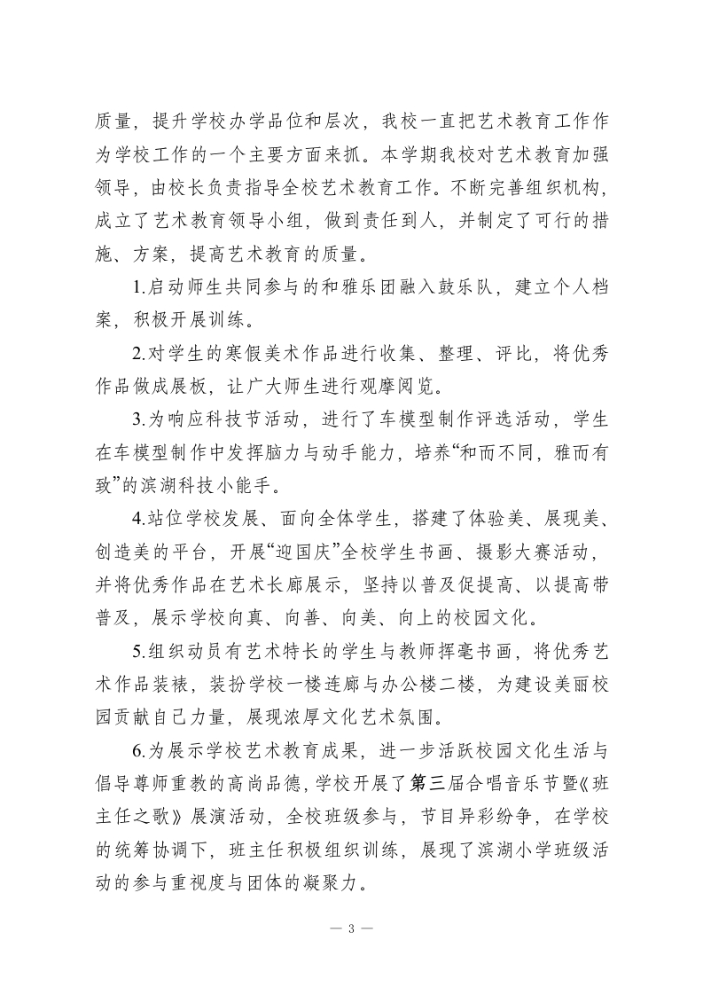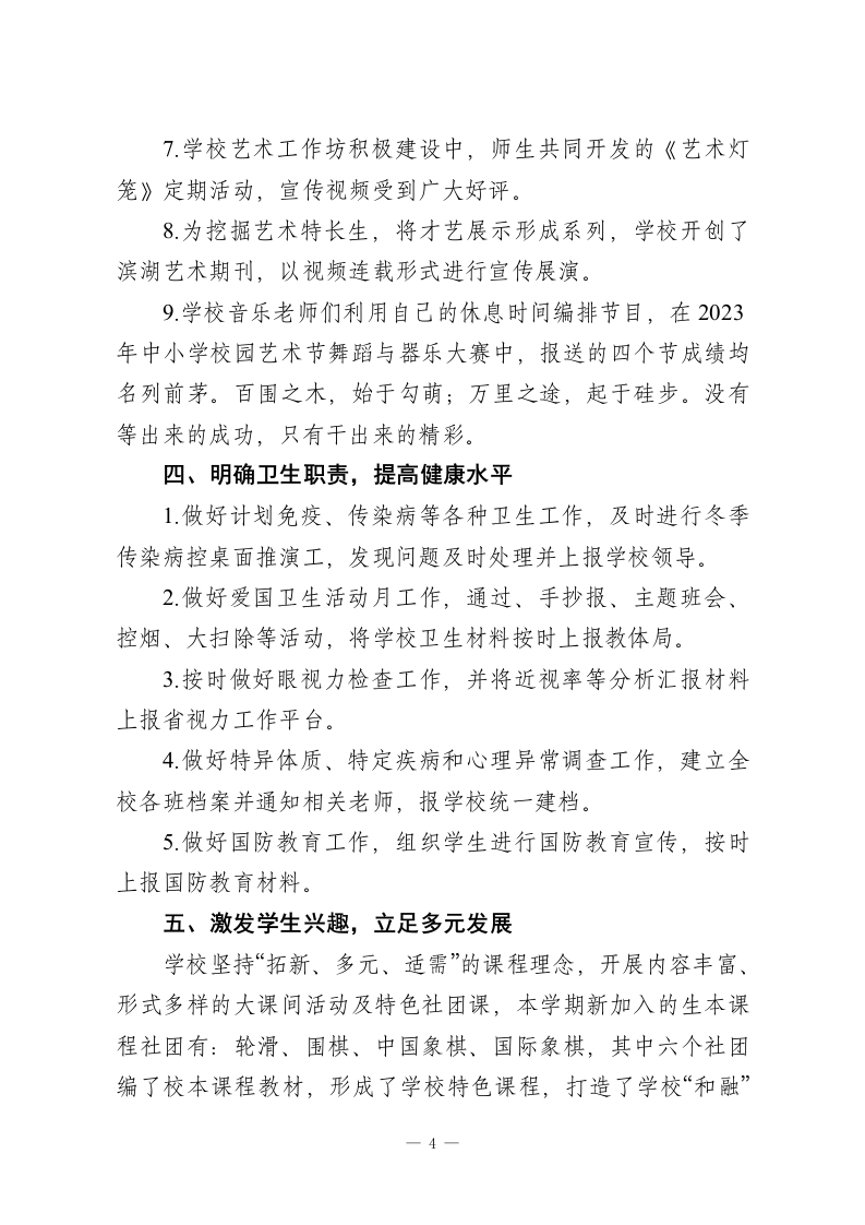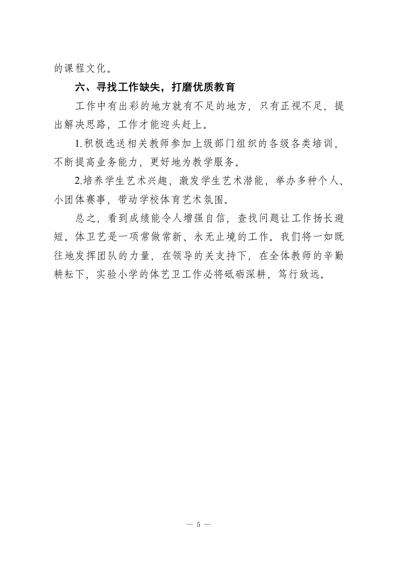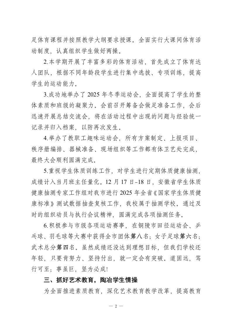 2025-2026年第一学期小学体艺卫工作总结星海横流,岁月成碑,短暂的学期转瞬即逝。本学期学校体卫艺处在校领导的关心和支持下,切实抓好体卫艺工作,认真研究贯彻并执行新版《体育艺术课程标准》,确立“以人为本”的教学目标,增强学生体质,提高学生艺术综合素质,注重实效,促进学校体育、卫生、艺术工作逐步走上规范化、制度化的轨道。下面对本学期体卫艺各项工作做以下总结:一、实施科学管理,促进持续发展为了抓好体卫艺工作,建立健全体卫艺工作的组织管理机构,做到分工明确,落实职责,建立健全了各项规章制度。保证了体卫艺教学工作的顺利进行。1.开学初体卫艺处召开2025年秋季教育教学专项会议,向老师们传达了本学期工作计划,用月历形式明晰工作清单,明确各自职责,推动体卫艺工作的全面发展。2.为激活内源力,激发内动力,促进教师专业提升,提升专业能力。开学初,音体美三学科根据新课标培训内容与大单元教学分别做了集体备课,探究新学期的课程发展方向。定期开展评教议教活动,修正问题、完善行为、提升自我。二、深化体育改革,增强学生体质1.认真实施好教育部、国家体育总局联合颁发的《学生体质健康标准》,贯彻落实《学校体育工作条例》,以《条例》为依据开展好学校体育工作。严格按照国家课程标准,开齐开1