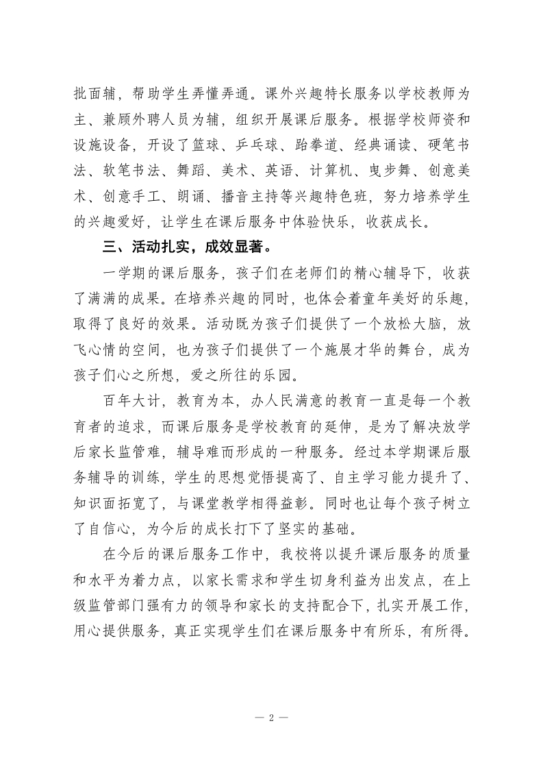 2025-2026年秋季第一学期课后延时服务工作总结为了进一步推进素质教育,贯彻党的教育方针,为进一步贯彻落实国家“双减”政策,丰富学生的校内外生活,全面发展学生能力,促进学生身心健康和谐全面发展,引导学生形成积极向上,团结合作,尊重他人的意志品质,为学生以后的学习生活和社会适应能力,打下良好的基础。我校在上级教育部门的关心指导下,全体家长的支持配合以及全体教师的不懈努力下,圆满完成一个学期的课后服务工作。为总结经验,吸取教训,臂画蓝图,踔厉奋发,力争取得更好的成绩,现将本学期的课后延时服务工作总结如下:一、精心谋划,周密部署。开学初,学校及时成立课后延时服务领导小组,从政策宣传、师资安排、安全保卫等方面对学校课后延时服务进行了安排部署。并结合本校实际,遵循“家长自愿,校内实施,有效监管”的原则,制定了《行之实验学校关于开展校内课后服务工作的实施方案》,确定了课后延时服务的服务时间、服务内容、辅导老师、管理制度等,明确了辅导老师和其他管理人员的职责和义务。二、多元课程,全面发展。根据学校实际,确定课后服务以作业辅导和课外兴趣特长服务相结合的模式进行。作业辅导由各班语文、数学、英语教师指导学生自主预习、复习、纠错练习巩固等,答疑解惑,面-1