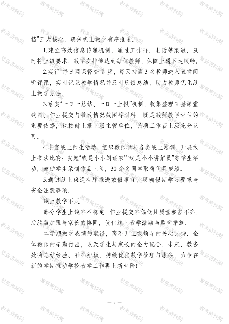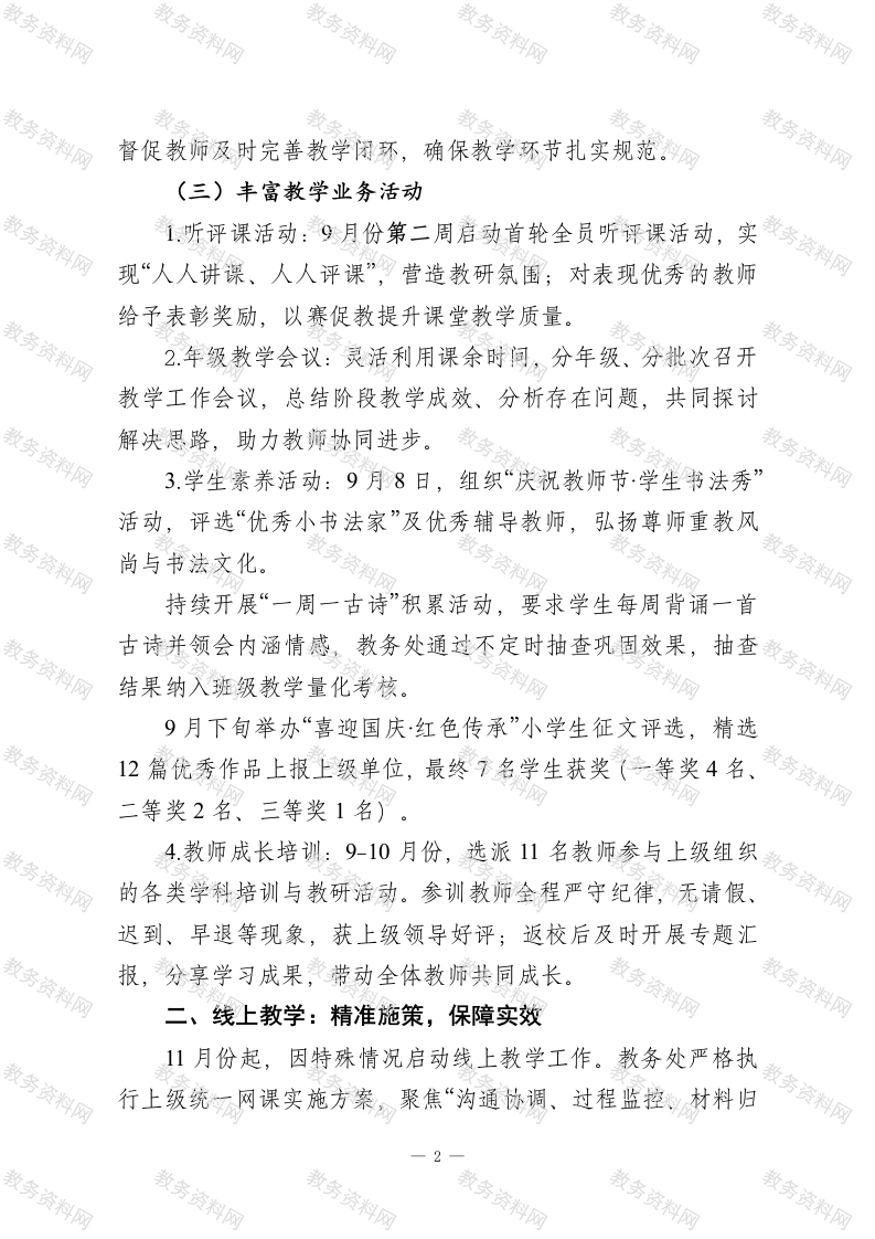 2025-2026秋季学年上学期教务工作总结本学期已近尾声,在上级教育部门的关心支持与全校教师的积极配合下,我校教务处紧紧围绕“提质增效、规范管理、赋能成长”的核心目标,扎实推进线下与线上教学各项工作,圆满完成学期既定教学任务。现将本学期重点教务工作汇报如下:一、线下教学:夯实基础,提质增效(一)科学统筹课程分配结合学校教师队伍调配实际,教务处牵头开展本学期任课教师优化配置工作。调配前召开全体教师会议,广泛听取任课意愿,全面掌握每位教师的优势学科、教学特长及年龄、身体状况。延续“2-3名教师负责一个班级核心教学”的配置模式,教务处统筹语数英主干课程分配,其他学科由班级任课教师协商分工。全体教师全力支持配合,即便部分课程存在调配冲突,也主动接纳安排,无一例拒绝任课现象,确保课程分配科学合理、落地高效。(二)规范过程材料管理1.备课管理:严格落实“先周备课”要求,为教师备课提供充足资源支持与时间保障;每两周收交一次备课材料,组织专人进行评审,对优质备课案例予以表彰推广,对存在问题的及时反馈整改。2.常规材料督查:按照上级教学评价标准,每两周对作业布置与批改、试卷讲评、教学反思等过程性材料开展专项督查,-1