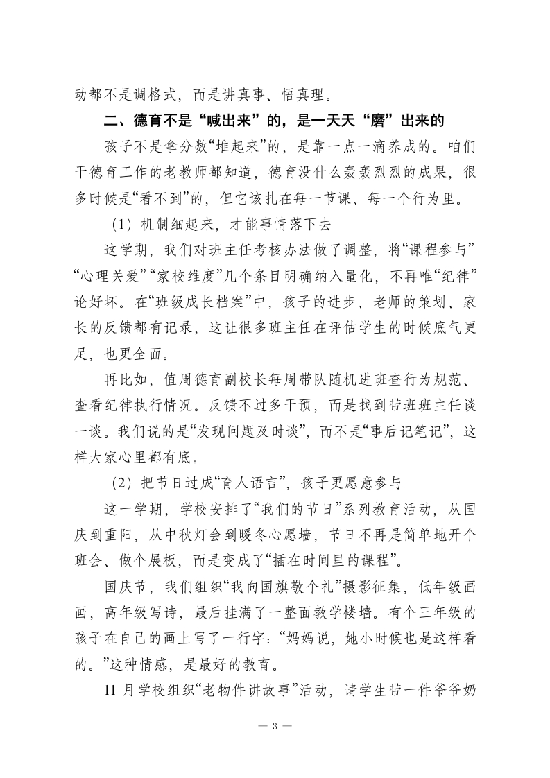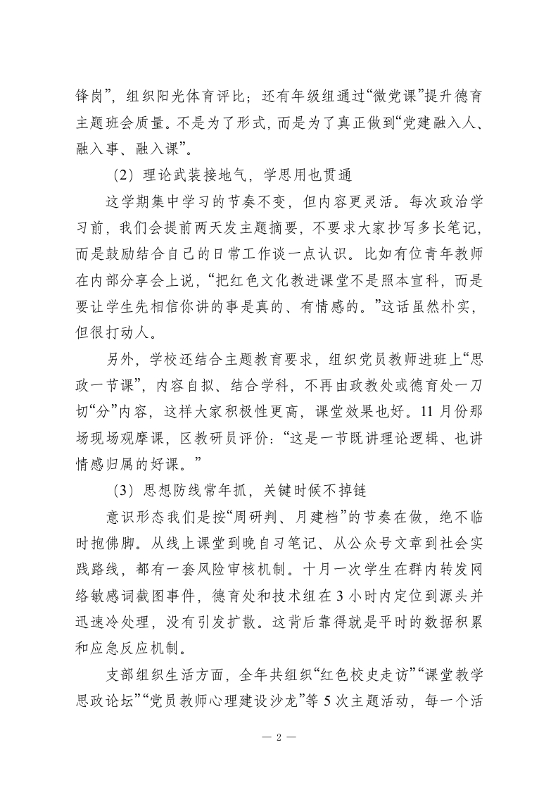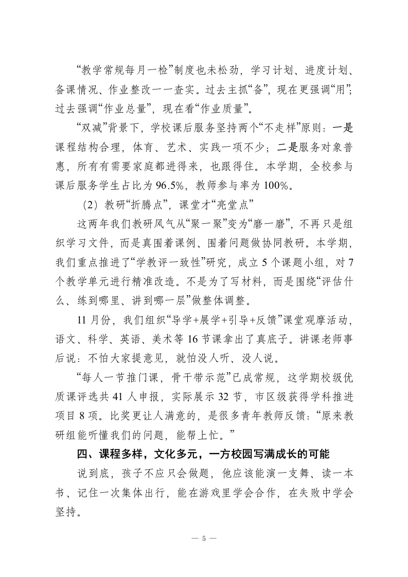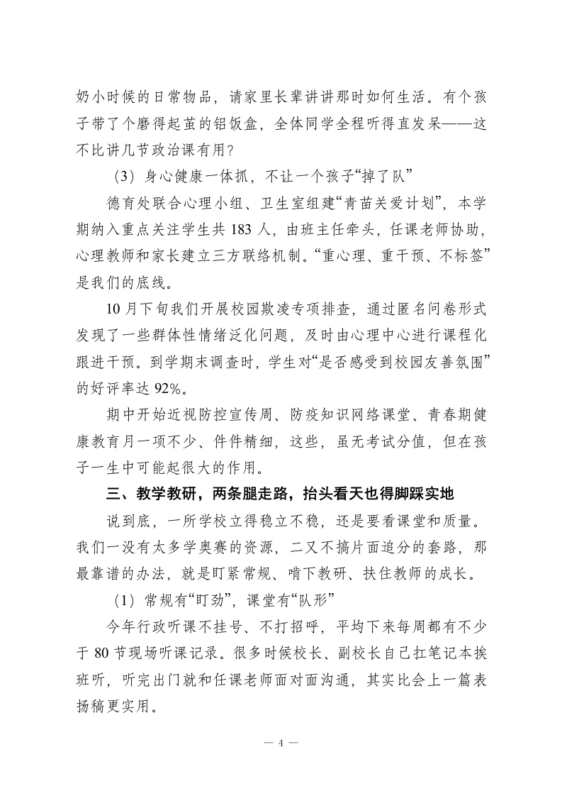 2025-2026学年第一学期学校工作总结:一半耕耘一半守望,一路深耕一路收获!时间过得真快,从九月的校门初开,到一月临近期末,不过百余天,但每天都密密实实地装满了人、事、思考与忙碌。开学那会儿站在教学楼前,看着老师们快步走进课堂、班主任带着新生从稚气中成长,心里就盘算着:今年,只盼着“稳”字当头,在去年的基础上,再扎上一层根,开一茬新枝。这一学期,全校上下启动得早、聚得快、跑得稳,不论是老教师的沉稳,还是新老师的朝气,都在这几个月的实践中融成了一股劲。说实话,这种“拧成一股绳”的感觉,是办学二十年来最珍贵的底气之一。下面就结合这学期重点工作,简单回顾几点:一、抓住“主心骨”,把党建工作做到人心里学校发展的根在教育,根本在人,而人这件事最讲引领、讲方向。可以说,学校的党建工作抓得牢不牢,直接决定着一所学校的“魂”是否稳、心是不是齐。(1)党建与业务不是“两张皮”,而是“一个面”这学期,我们继续把党建责任压实到每个处室、年级组、教研组。书记带头讲党建课、上示范课成了常态,全校26名在编党员教师,每月围绕中心工作写学习小结,做个人承诺,签责任状,把党建要求融进日常教学、德育、安全管理中。校内设了“党建+德育”“党建+教研”双协同机制。比如,语文教研组党小组建了“红色读本单元课程”;体育组成立“党员先1