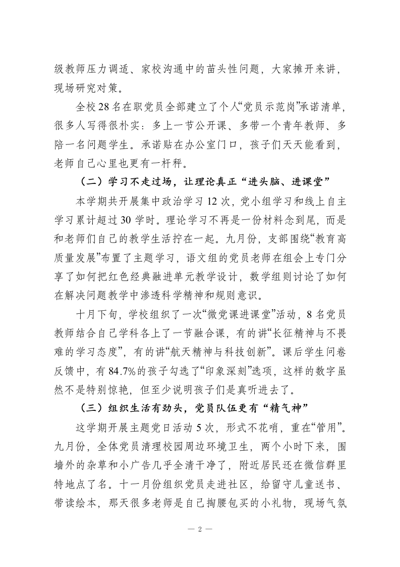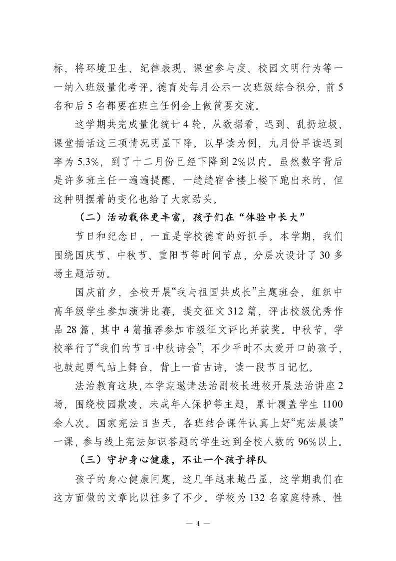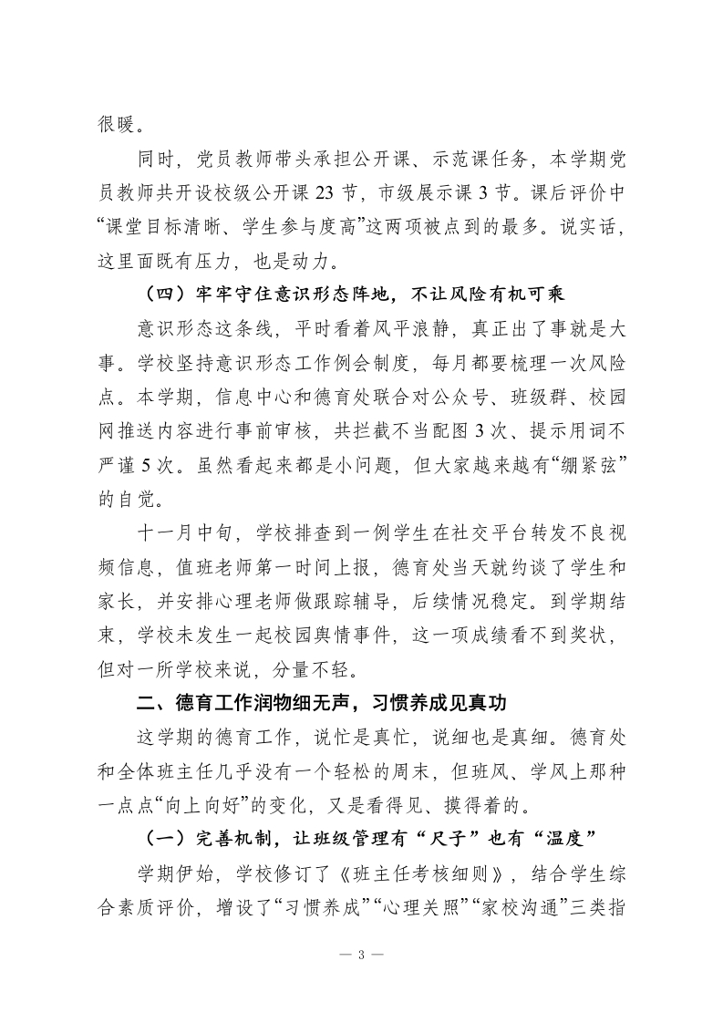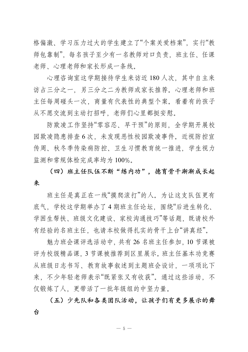 2025-2026学年第一学期学校工作总结:一程山水育桃李,半亩方塘见初心!这学期从九月初开学到一月中旬期未收尾,前前后后四个多月,忙得脚不沾地。回头看看,其实心里还是有一点踏实的:该抓的工作都没有丢,年初定下的目标大部分也基本落到了地上。说不累是假的,很多老师都是踩着铃上课、踩着月光回家。但看到孩子们一点点长高、长壮、长见识,看到家长群里抱怨少了、点赞多了,大家心里还是那句话一累点也值。这一学期,在上级教育主管部门指导下,在社区、家长和周边单位的帮助下,学校紧紧围绕“提高教育教学质量、促进教育内涵发展”这个中心,盯住“观念突破、管理突破”这两件硬事,把“党建引领、安全保障、质量提升、多元发展”这四块内容扎扎实实往下做。很多工作没有什么惊天动地的大新闻,但每一天的点滴叠加起来,就是这所学校真实的成长轨迹。一、党建工作落细落小,把好学校发展的“方向盘”这学期下来,最直观的感受是:党建工作越来越不像一块“独立业务”,而是实实在在融进了学校的日常管理和教育教学。(一)压实责任,形成一条“拧在一起的绳”学期初,学校党支部对全年党建工作重新做了梳理,把责任分到了人头,也落到了岗位。书记与各处室负责人、年级组长一共签了18份党建目标责任书,把党建任务与教学、德育、安全等重点工作一一对接。每月一次的支委会不讲空话,基本都盯着一个实实在在的难点,比如青年教师思想状况、毕业年1