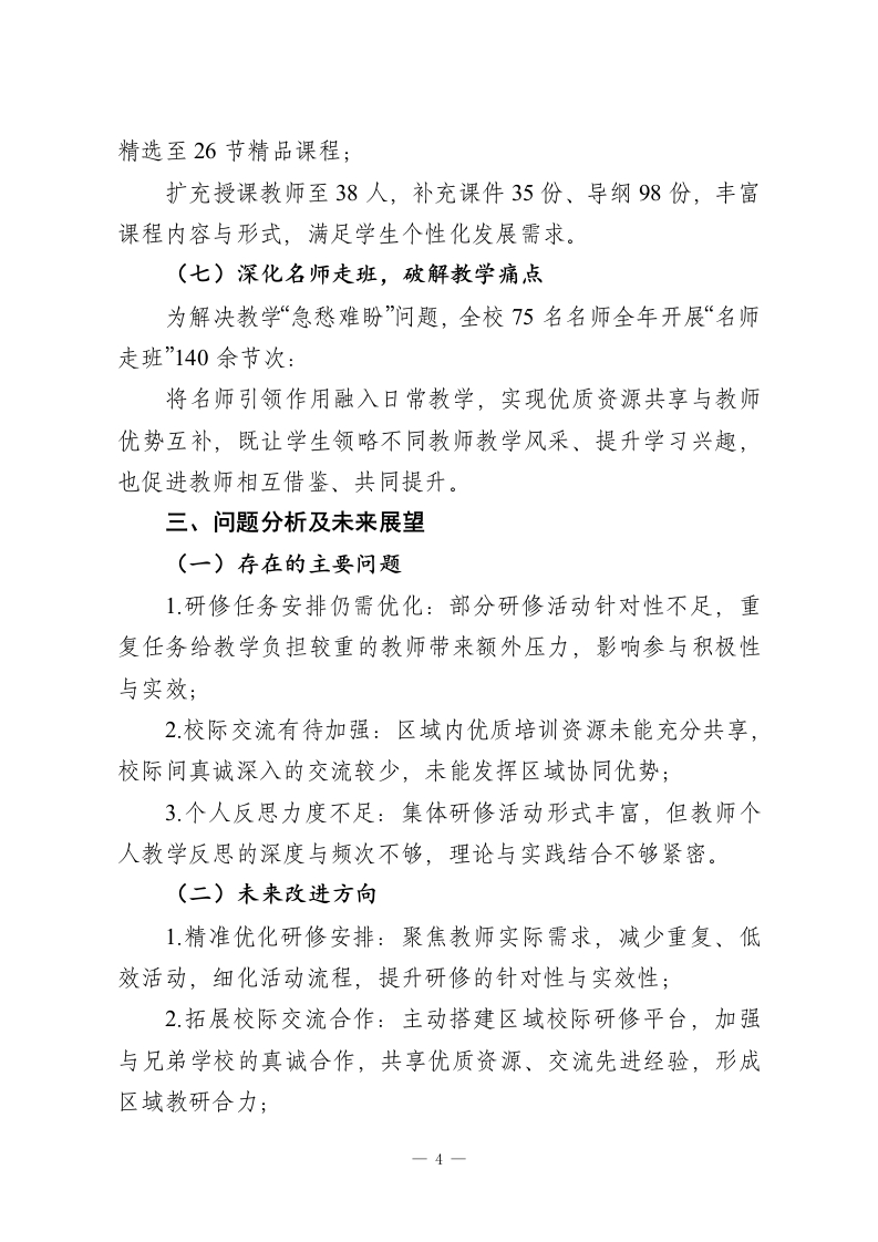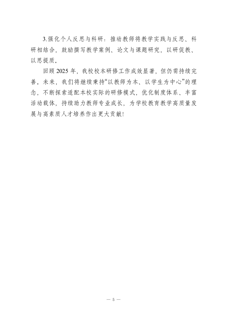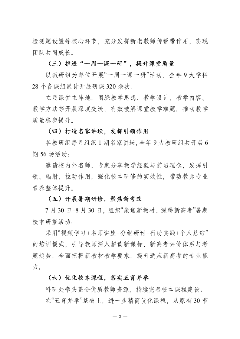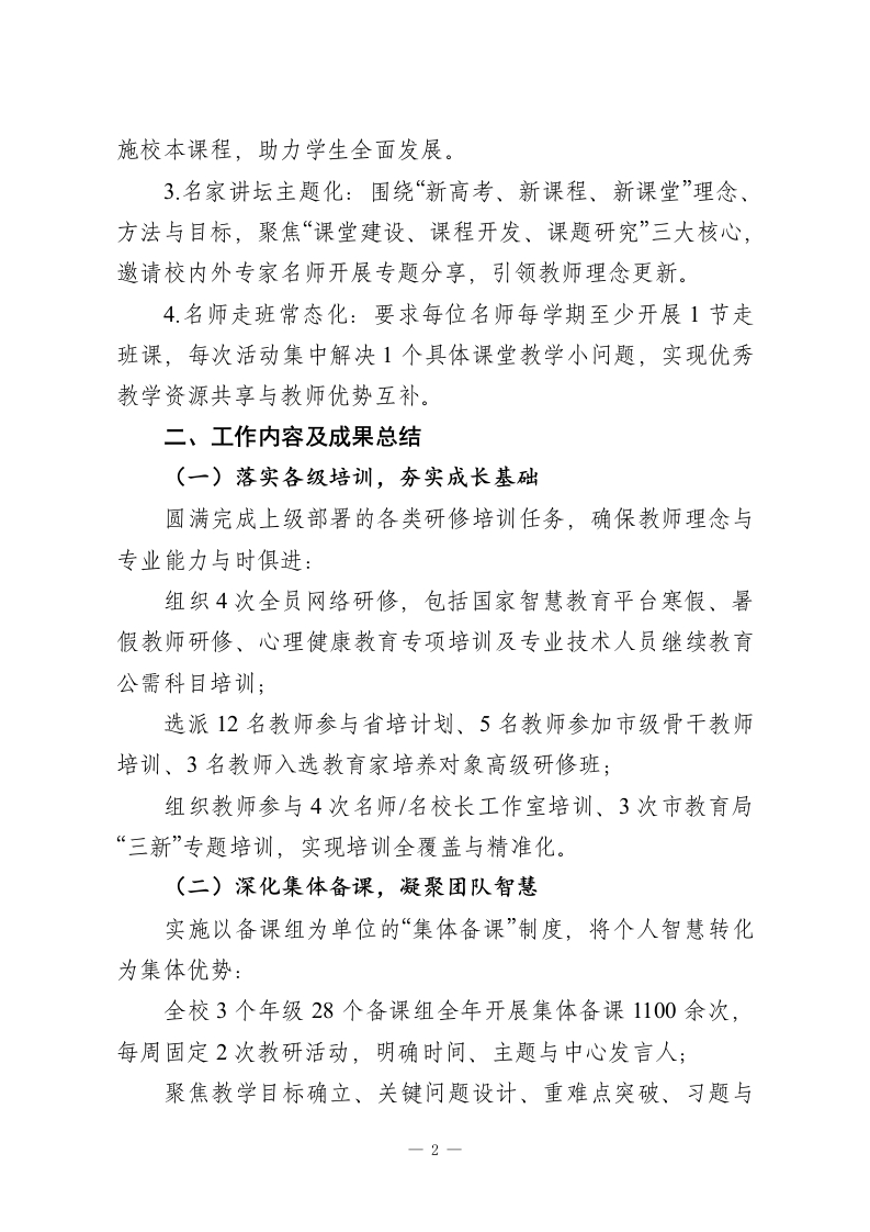 2025年度XX高中校本研修工作总结今年,我校校本研修工作以“促进学校高质量发展、助力教师专业成长”为核心目标,立足本校教育教学实际问题,面向全体教师、突出重点任务,通过教师培训、学科教研、集体研讨、个人反思等多元形式,深入开展校内学习与研究活动,有效提升了教师综合素养与业务能力,为学校教育教学质量的可持续发展提供了坚实支撑。现将本年度工作总结如下:一、工作思路及创新举措(一)核心工作思路教师素质是教育事业发展的核心动力,也是学校办学水平的关键支撑。今年,我校在充分调研教师需求与教学痛点的基础上,延续并深化“教学推动教研,教研反哺教学”的工作思路,以课堂教学实际问题为导向,通过研课、讲坛、培训、课程开发等核心活动,引导教师主动学习、自主提升,着力打造高素质专业化教师队伍。((二)关键创新举措围绕核心思路,我校在实践中优化并探索出多项务实有效的研修举措:1.研课精准化:明确每次研课必须聚焦课堂教学“三破”目标一一破难点、破重点、破考点,推动教研与教学深度融合,避免研课形式化。2.校本课程特色化:秉持“以校为基、以生为本”理念,依托校内优势教师资源,从德、智、体、美、劳“五育”维度开发实1